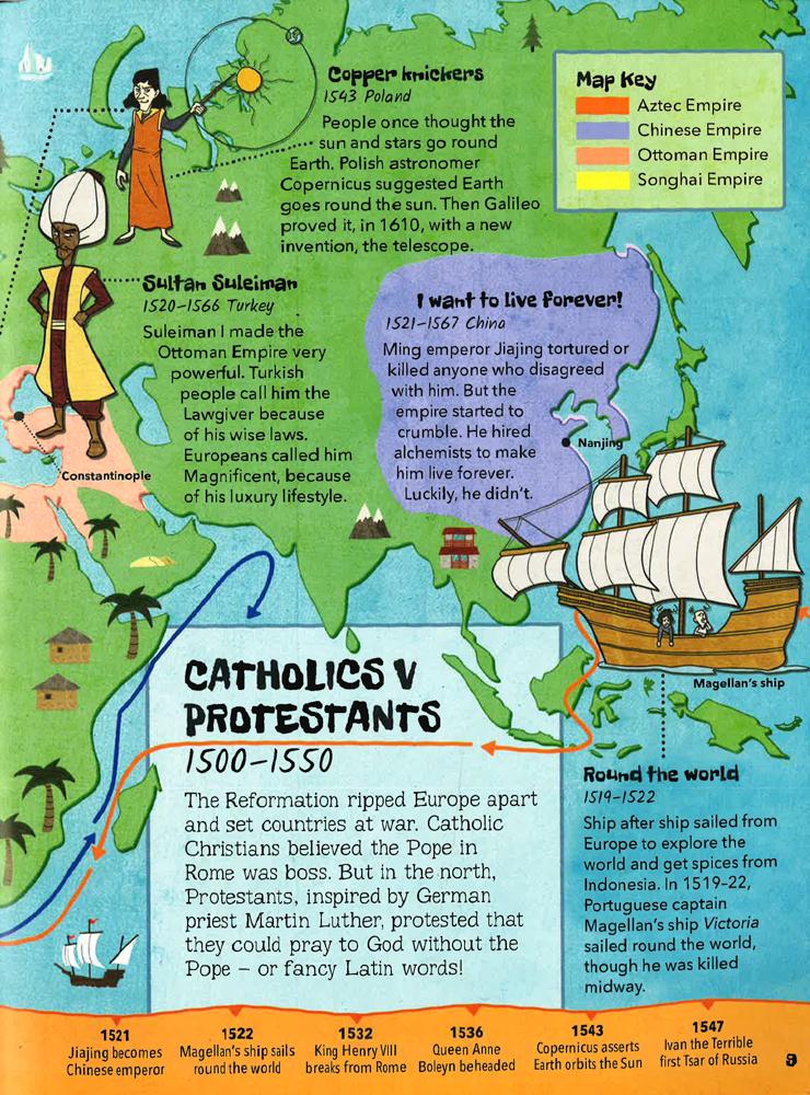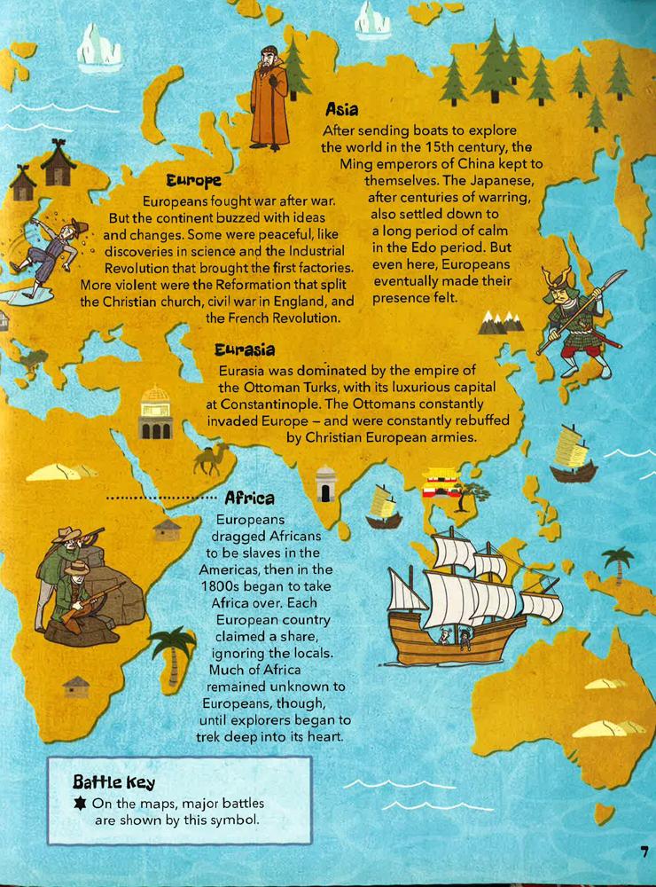 Follow four centuries of discovery and change, from the moment the world was first explored to turbulent times when it turned upside down - even for people not going anywhere! See how... South American gold fuelled Spain's 'Golden Age'. Ivan the Terrible made Russia BIG. A French king lost his head (and so did an English one). The United States won independence. ...and lots more. Fun, illustrated maps give an instant, bird's-eye view of what was happening when and where through time - not forgetting landmark inventions such as the telegraph, photography and the car. Stand by for action...