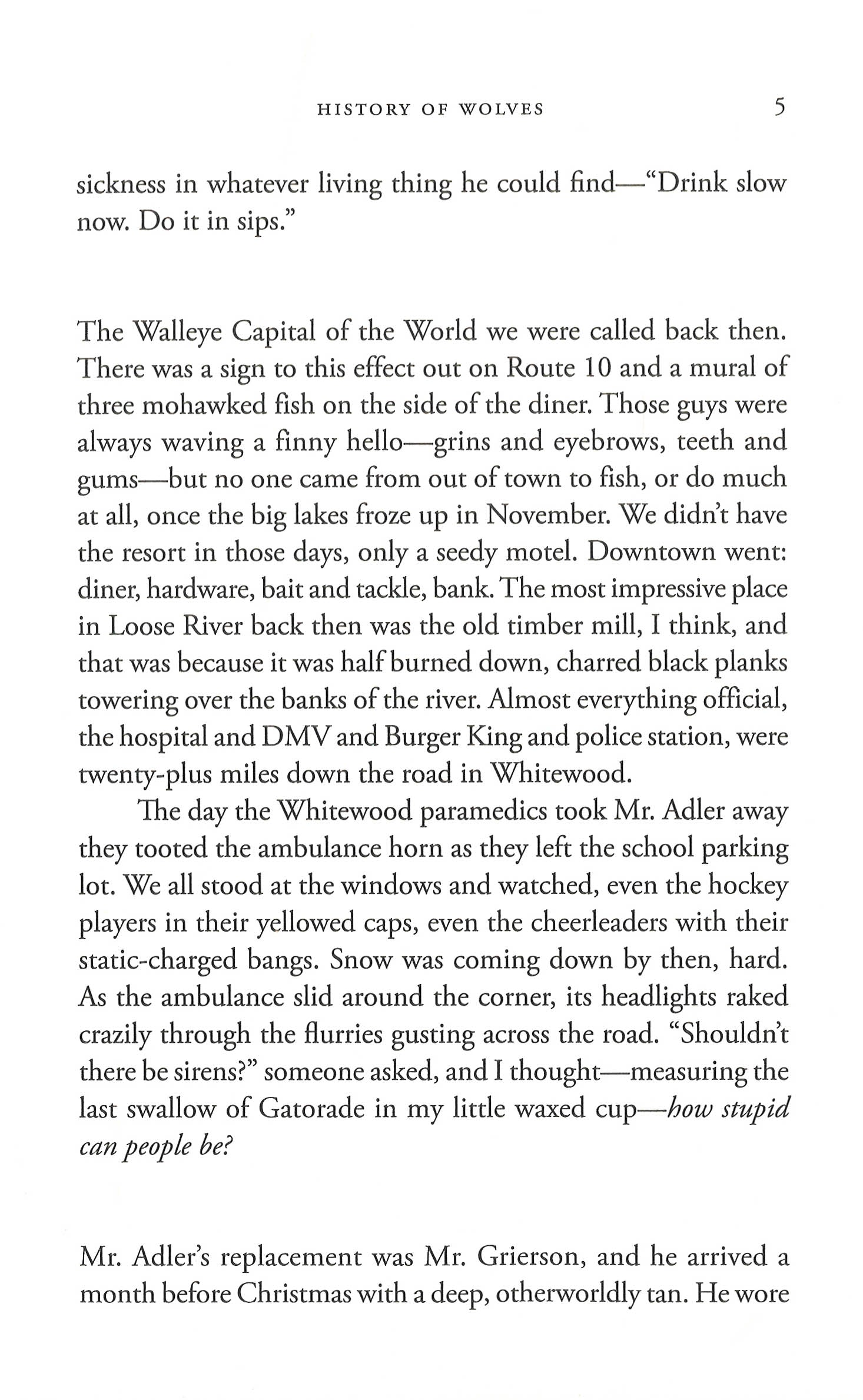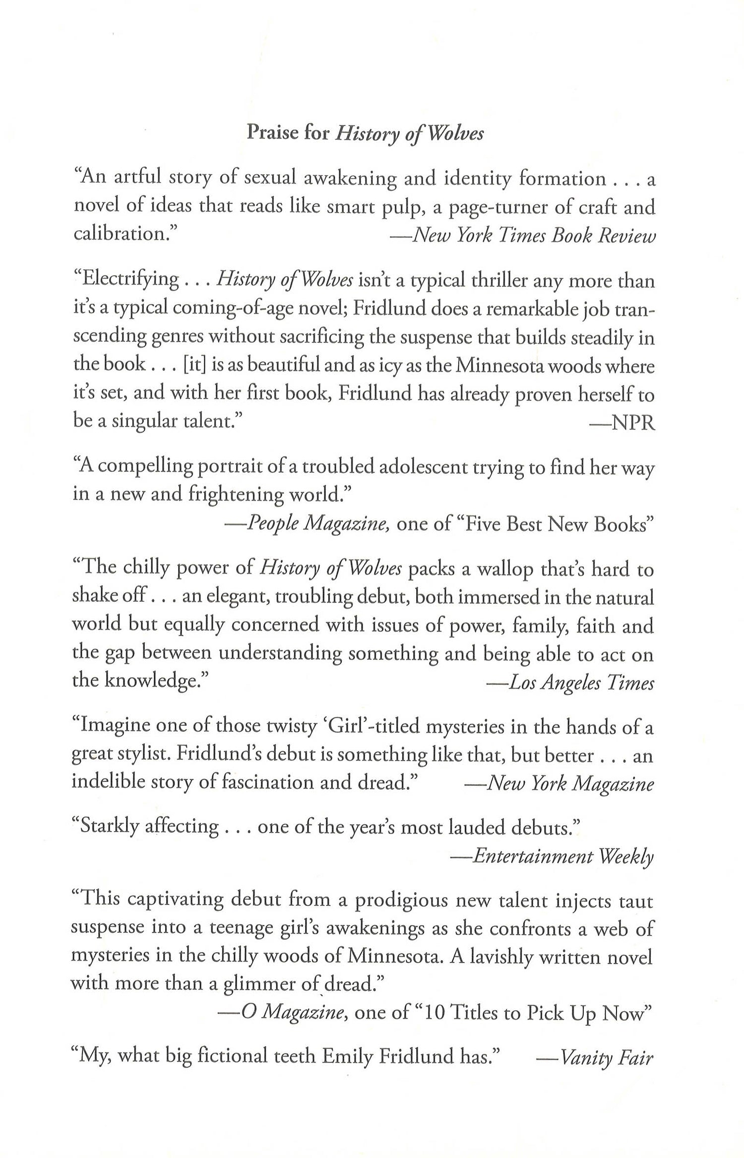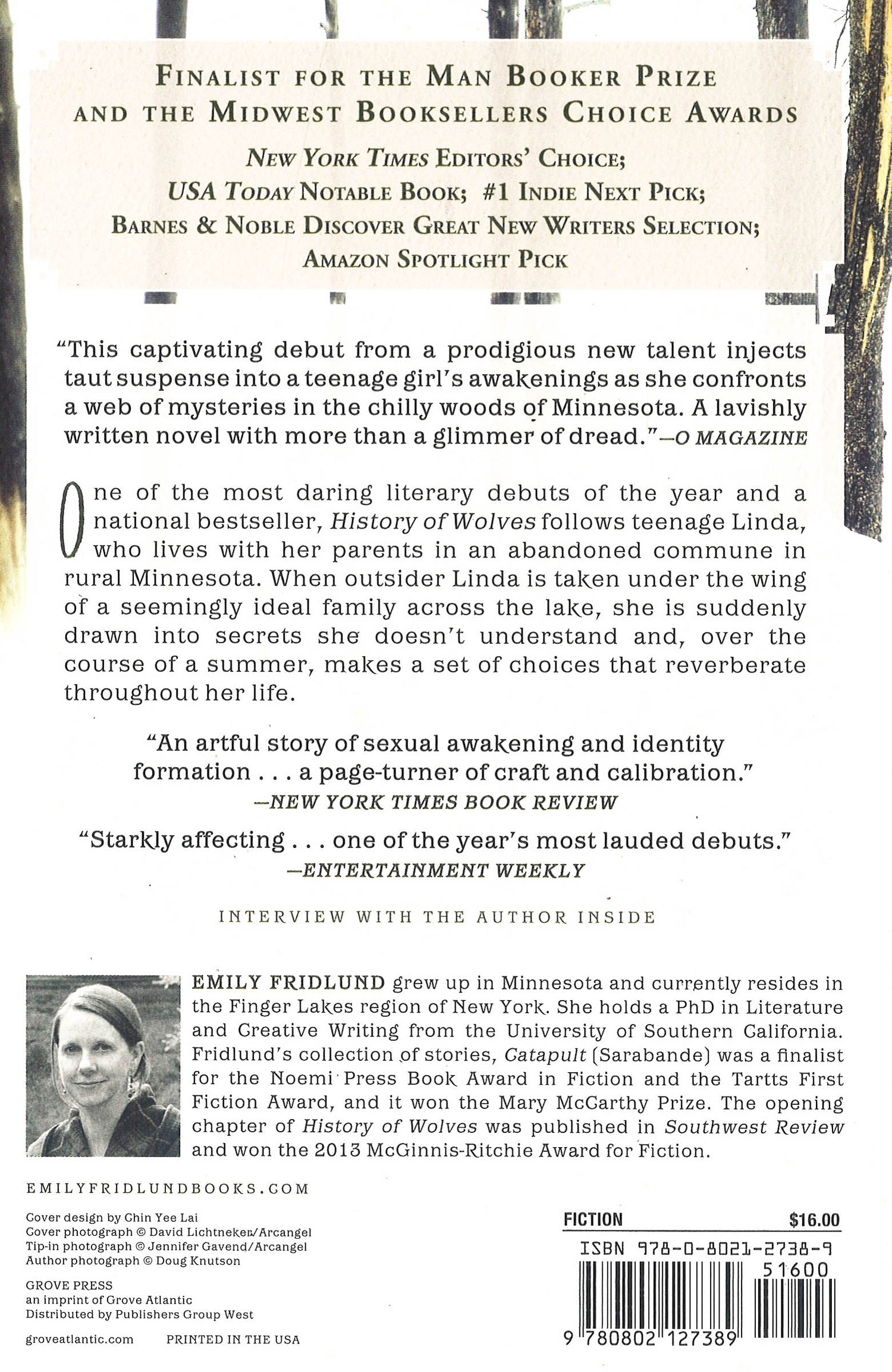 Teenage Linda lives with her parents in the austere woods of northern Minnesota, where their nearly abandoned commune stands as a last vestige of a lost counter-culture world. Isolated at home and an outsider at school, Linda is drawn to the enigmatic Lily and new history teacher Mr. Grierson. When Mr. Grierson is faced with child pornography charges, his arrest deeply affects Linda as she wrestles with her own fledgling desires and craving to belong. And then the young Gardner family moves in across the lake and Linda finds herself welcomed into their home as a babysitter for their little boy. But with this new sense of belonging comes expectations and secrets she doesn't understand and, over the course of a summer, Linda makes a set of choices that reverberate throughout her life. One of the most daring literary debuts of the year and a national bestseller, History of Wolves is an agonizing and gorgeously written novel from an urgent, new voice in American fiction.