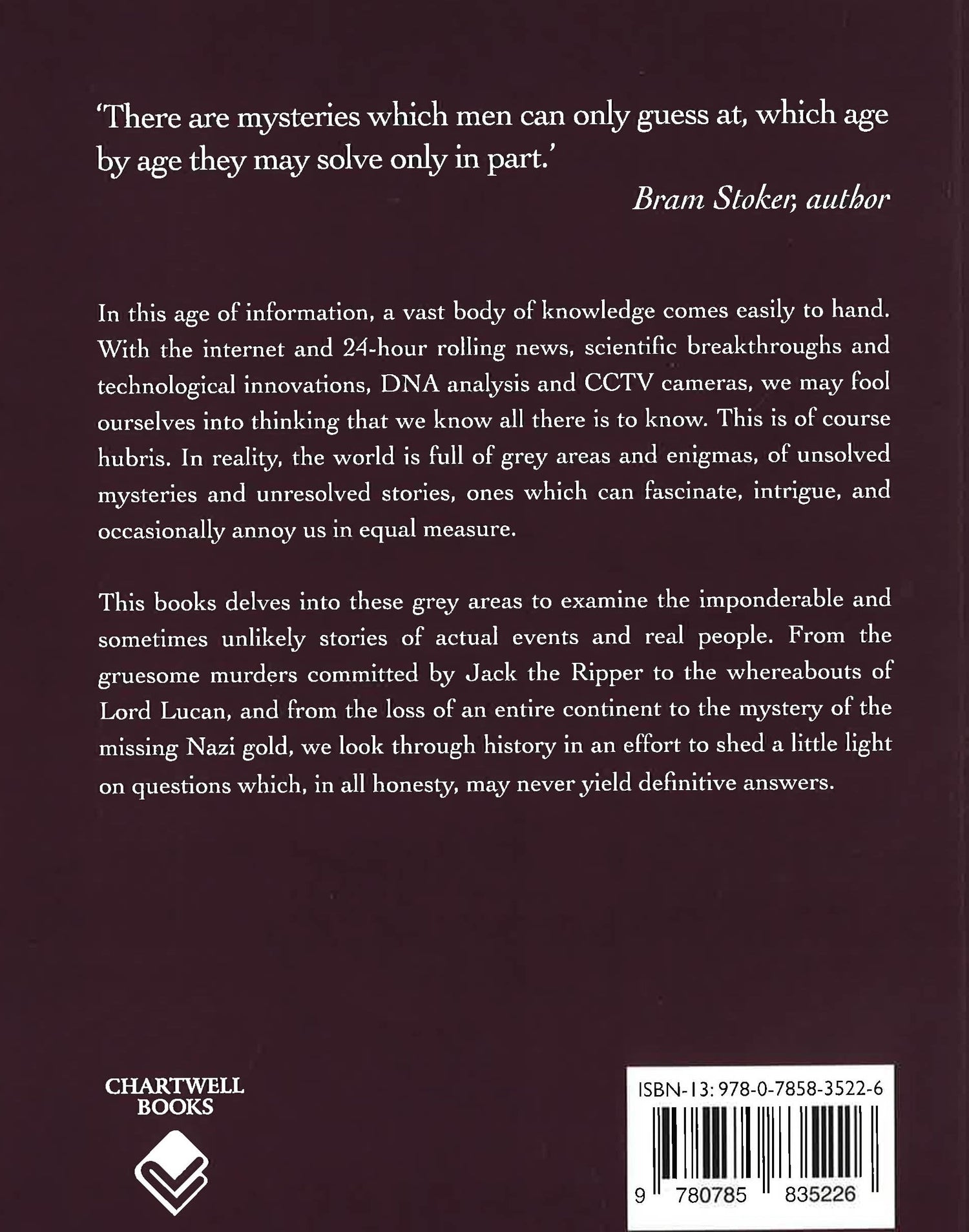 In this age of information, a vast body of knowledge comes easily to hand. With the internet and 24-hour rolling news, scientific breakthroughs and technological innovations, DNA analysis and CCTV cameras, we may fool ourselves into thinking that we know all there is to know. This is of course hubris. In reality, the world is full of grey areas and enigmas, of unsolved mysteries and unresolved stories, ones which can fascinate, intrigue, and occasionally annoy us in equal measure. This book delves into these grey areas to examine the imponderable and sometimes unlikely stories of actual events and real people. From the gruesome murders committed by Jack the Ripper to the whereabouts of Lord Lucan, and from the loss of an entire continent to the mystery of the missing Nazi gold, we look through history in an effort to shed a little light on questions which, in all honesty, may never yield definitive answers.