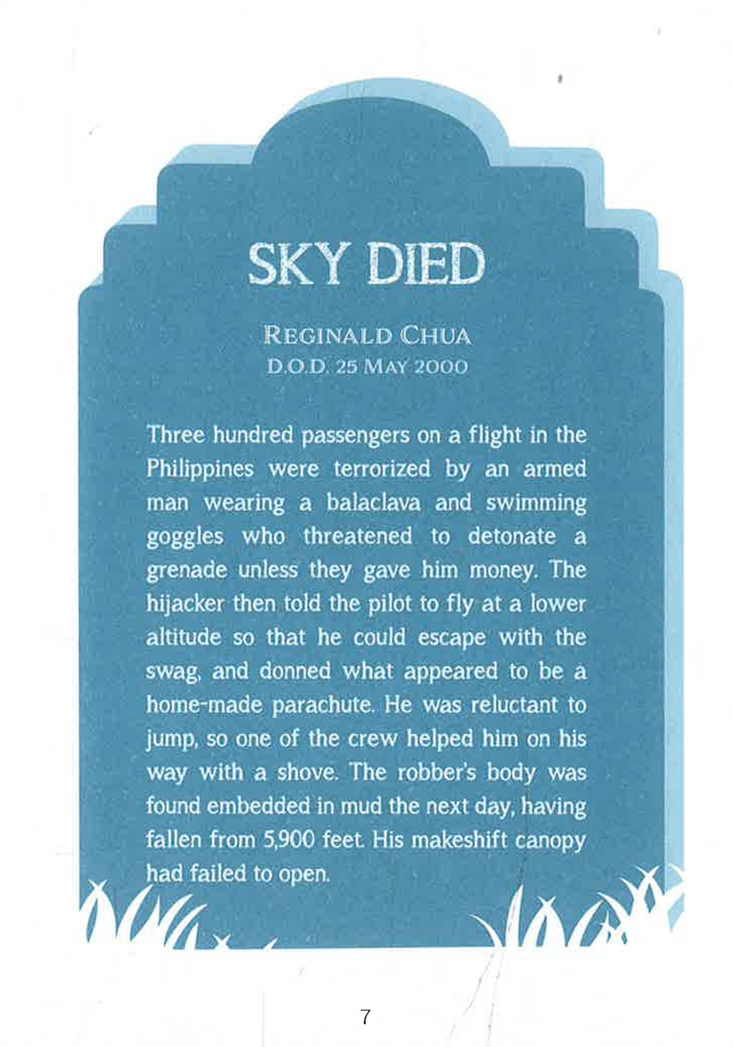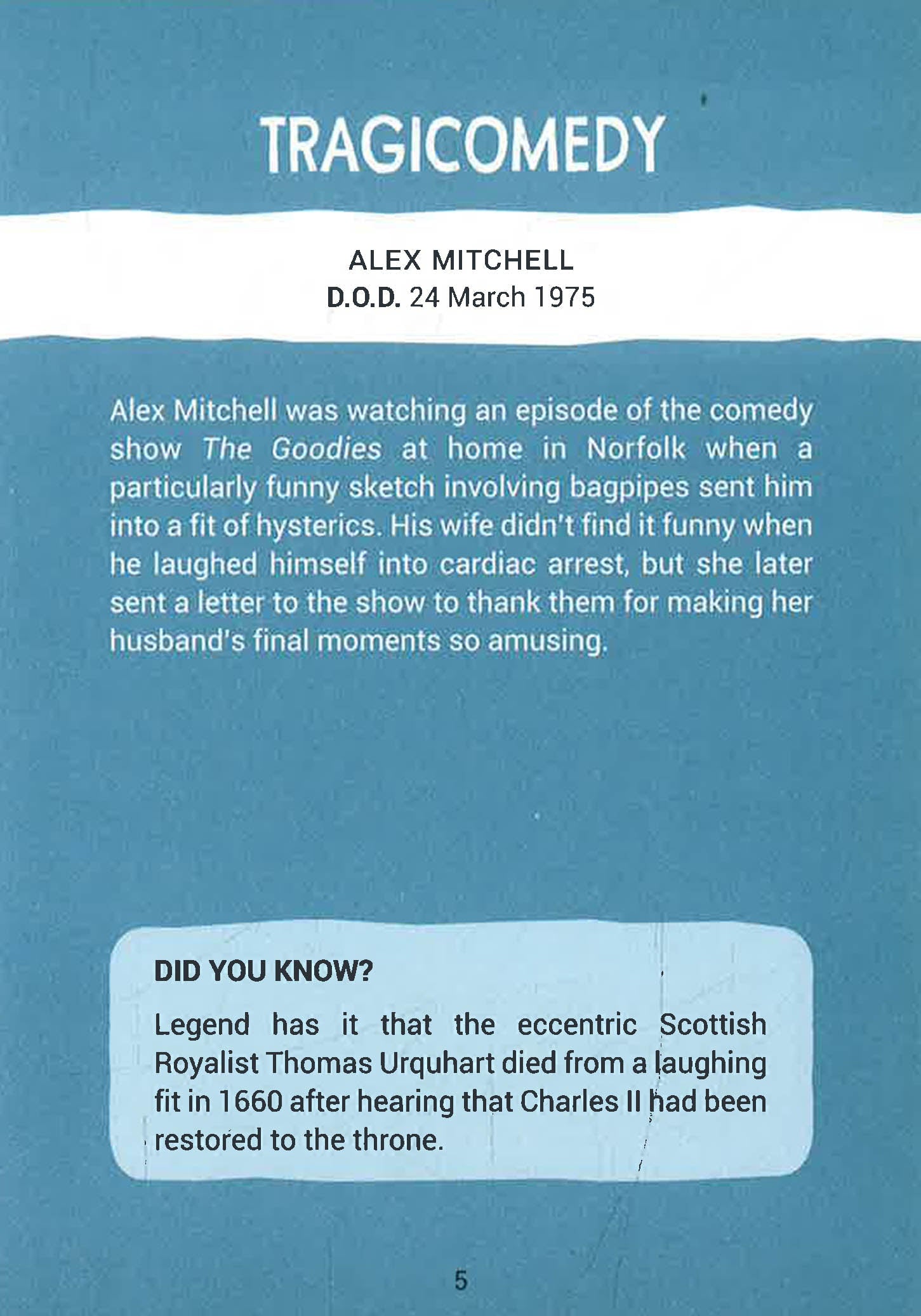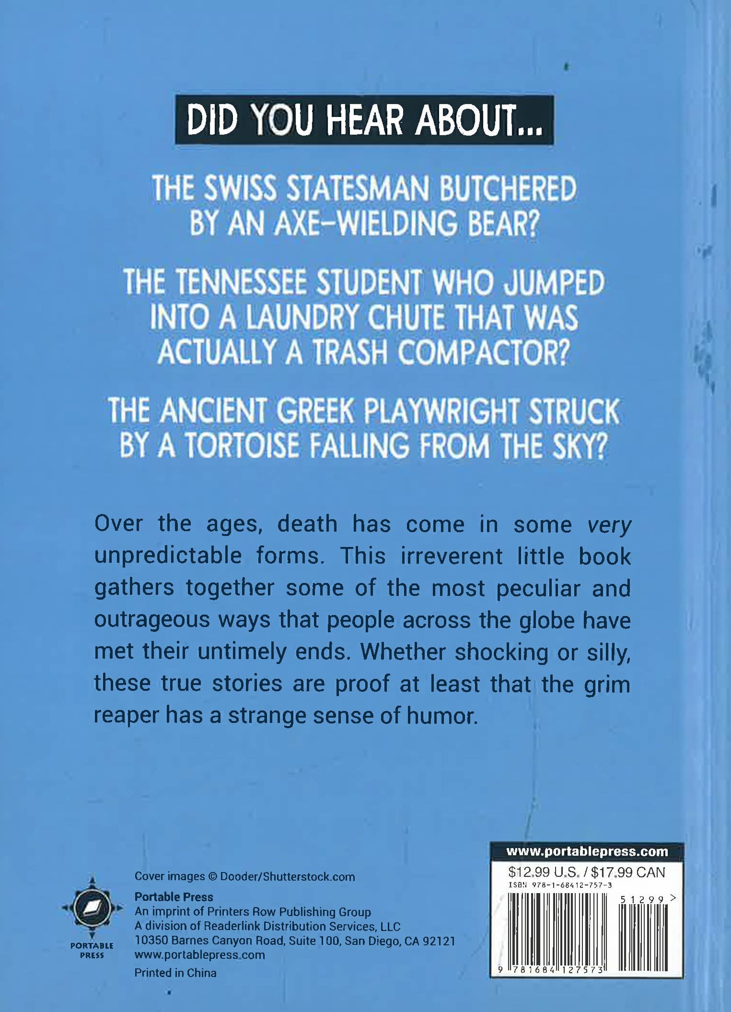 Death comes in many forms—sometimes peaceful, sometimes tragic, sometimes dramatic . . . and at other times just plain weird. In History’s Weirdest Deaths, you’ll read the true stories of more than a hundred people who met their end in a bizarre fashion. Each cautionary tale is unique. Meet the victims of stunts that went horribly wrong, ordinary people who made boneheaded blunders, and famous figures who realized too late that celebrity isn’t a cure for stupidity.