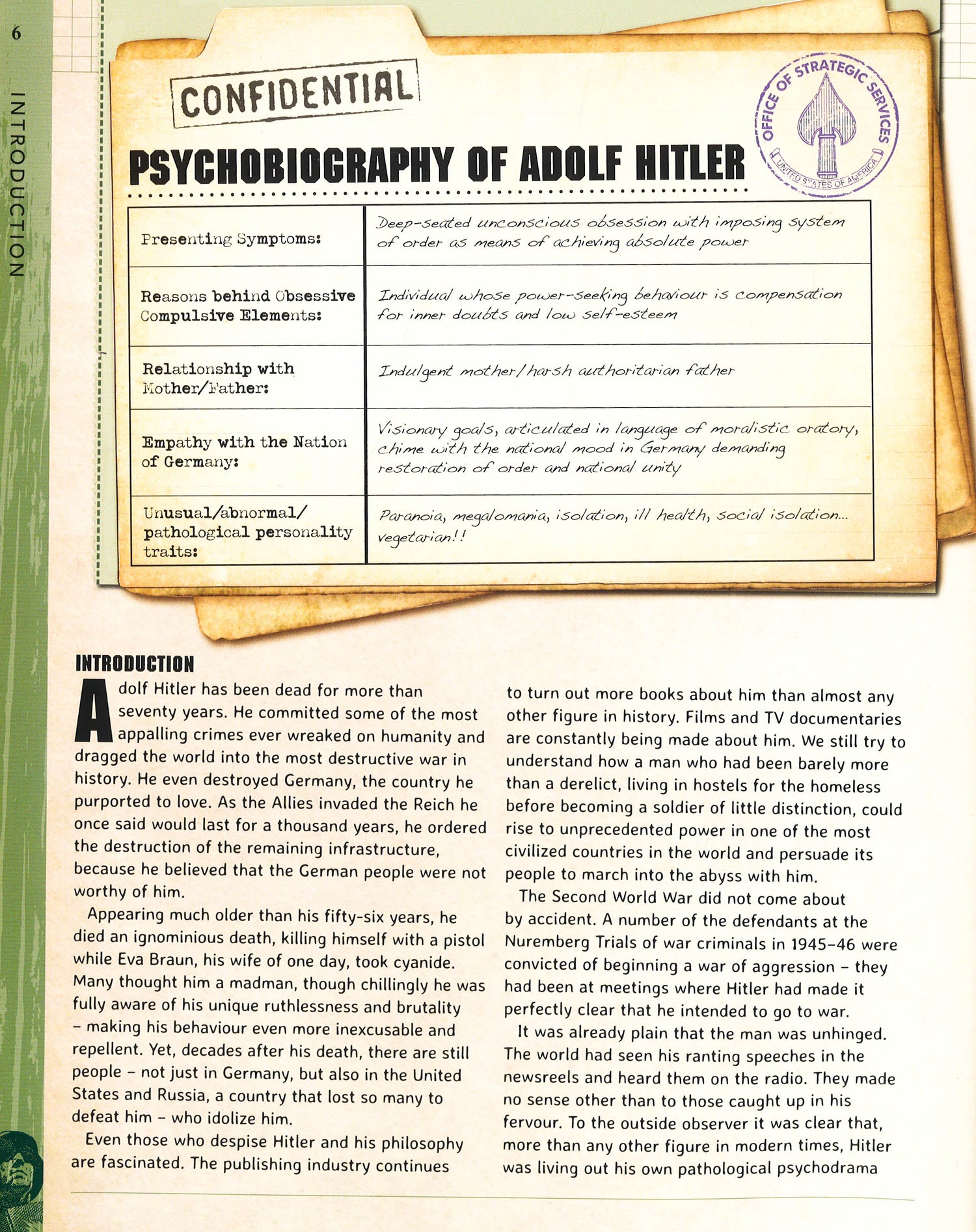 How did a former Austrian corporal in the Bavarian army with no apparent gift for leadership or strategy become the leader of one of the most civilized countries in Europe and turn it into a nightmare state? This is an accessible, concise and penetrating analysis of Adolf Hitler, the most enigmatic figure of the 20th century. Drawing on sound psychological principles and the latest research into the causes and nature of aberrant personalities, Hitler: the Psychiatric Files presents revealing insights into one of the world s most murderous dictators.This book explains how Hitler s childhood framed his view of the world and led to his Messiah complex. The Third Reich was a manifestation of Hitler s neurotic personality, his megalomania and desire for destruction. This book explains the tyrant that ran it, and the demons that ran him. Hitler was an actor on the world stage. These pages reveal the public face and the private man, his sexual relationships, the dark pathology of a 'Man with a Mission', and the psychopathology which influenced his actions and reactions throughout the war years along with the personality types he attracted into his inner circle. Fully illustrated in full color."