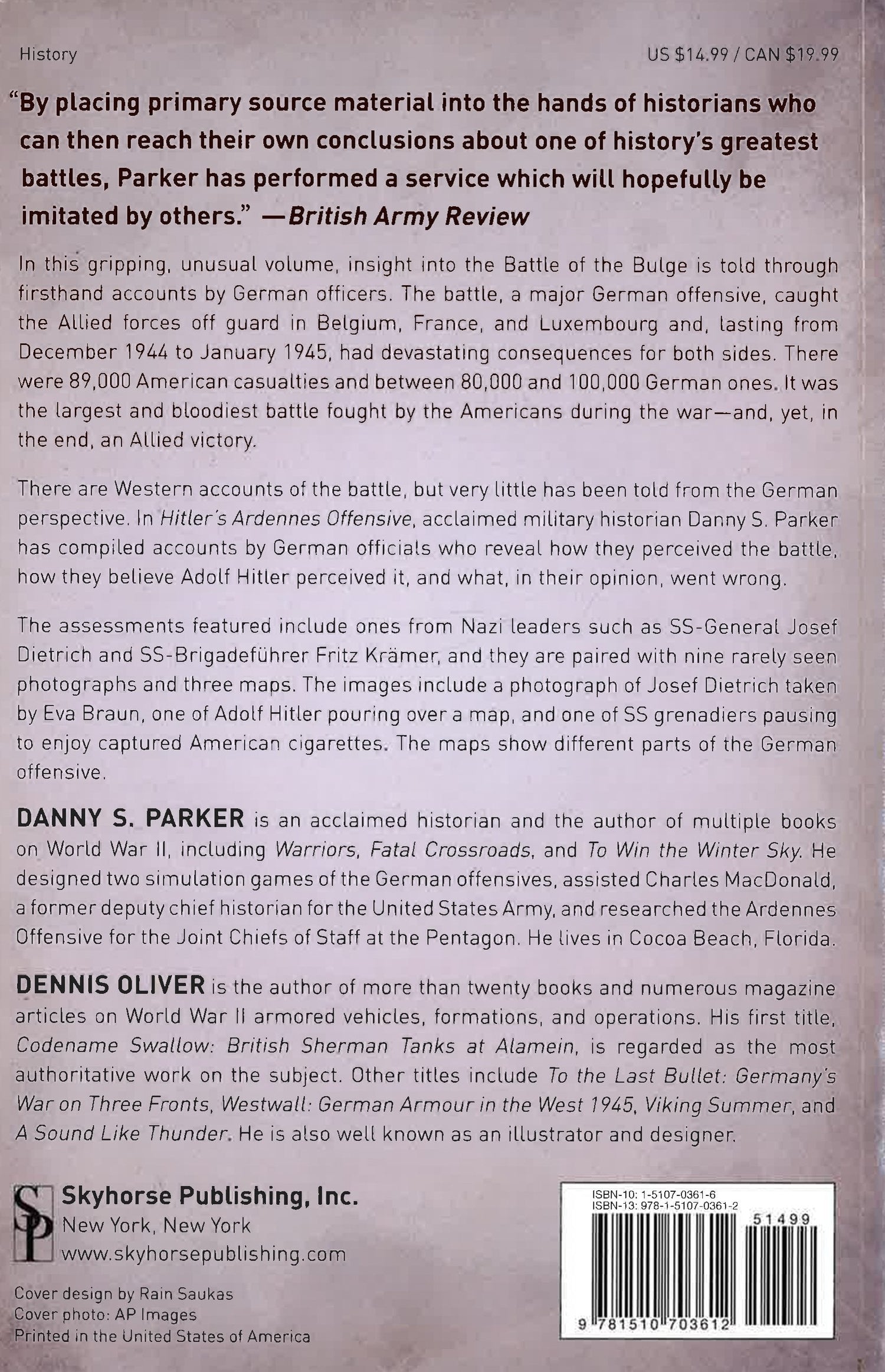In this gripping, unusual volume, insight into the Battle of the Bulge is told through firsthand accounts by German officers. The battle, a major German offensive, caught the allied forces off-guard in Belgium, France, and Luxembourg and, lasting from December 1945 January 1945, had devastating consequences for both sides. There were eighty-nine thousand Americans casualties and between eighty thousand and one hundred thousand German ones. It was the largest and bloodiest battle fought by the Americans during the war and, yet, in the end, an allied victory. There are Western accounts of the battle, but very little has been told from the German perspective. In Hitler's Ardennes Offensive, acclaimed military historian Danny S. Parker has compiled together accounts by German officials who reveal how they perceived the battle, how they believe Adolf Hitler perceived it, and what, in their opinion, went wrong. The assessments featured include ones from Nazi leaders such as SS-generals Josef Dietrich and SS-Brigadefuhrer Fritz Kramer, and they are paired with nine rarely seen photographs and three maps. The images include a photograph of Josef Dietrich taken by Eva Braun, one of Adolf Hitler pouring over a map, and one of SS grenadiers pausing to enjoy captured American cigarettes. The maps show different parts of the German offensive. The unique volume was created after Parker spent twenty-five years studying World War II and conducting more than two hundred interviews on it. Released ten years ago in a limited print run, it is now, shortly after the seventieth anniversary of the battle, finally back in print. Skyhorse Publishing, as well as our Arcade imprint, are proud to publish a broad range of books for readers interested in history--books about World War II, the Third Reich, Hitler and his henchmen, the JFK assassination, conspiracies, the American Civil War, the American Revolution, gladiators, Vikings, ancient Rome, medieval times, the old West, and much more. While not every title we publish becomes a New York Times bestseller or a national bestseller, we are committed to books on subjects that are sometimes overlooked and to authors whose work might not otherwise find a home.
