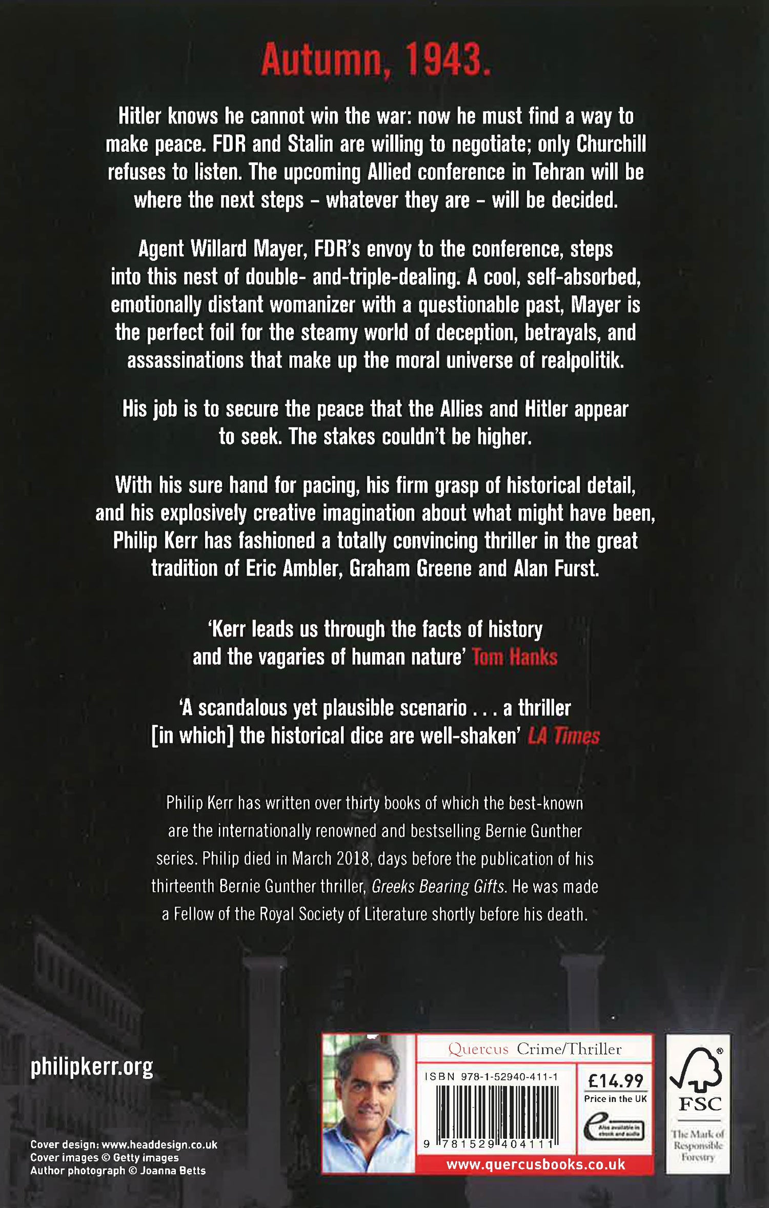 A gripping alternative history thriller set in the Second World War, from the internationally acclaimed and bestselling author of the Bernie Gunther novels.Autumn 1943. Hitler knows he cannot win the war: now he must find a way to make peace. FDR and Stalin are willing to negotiate; only Churchill refuses to listen. The upcoming Allied Tehran conference will be where the next steps - whatever they are - will be decided.Into this nest of double- and triple-dealing steps Willard Mayer, OSS agent and FDR's envoy to the conference. His job is to secure the peace that the USA and Hitler now crave. The stakes couldn't be higher.Showcasing Philip Kerr's brilliant research and masterful plotting at its best, Hitler's Peace has never before been published in the UK and is a fitting coda to the career of one of the masters of the historical thriller.