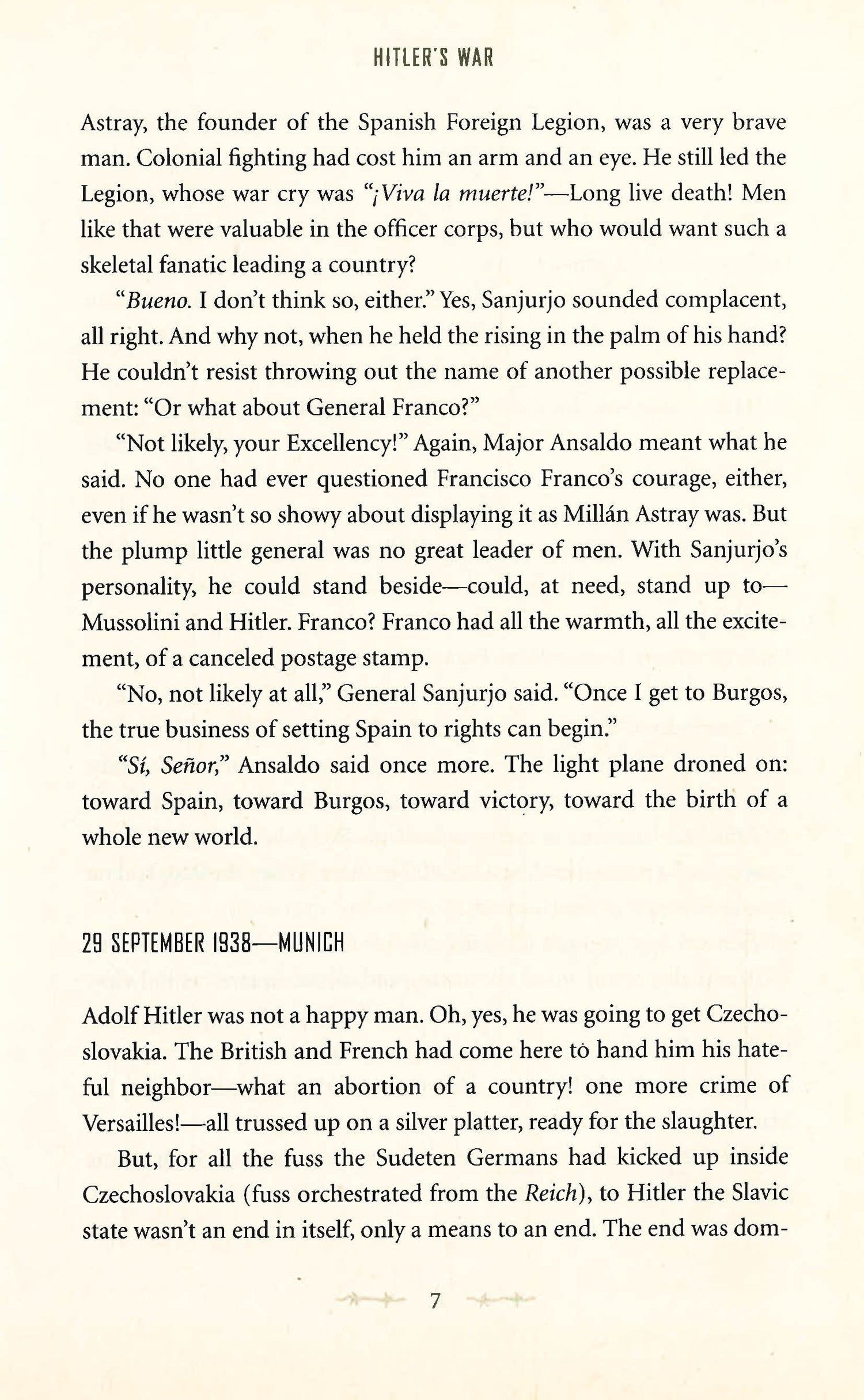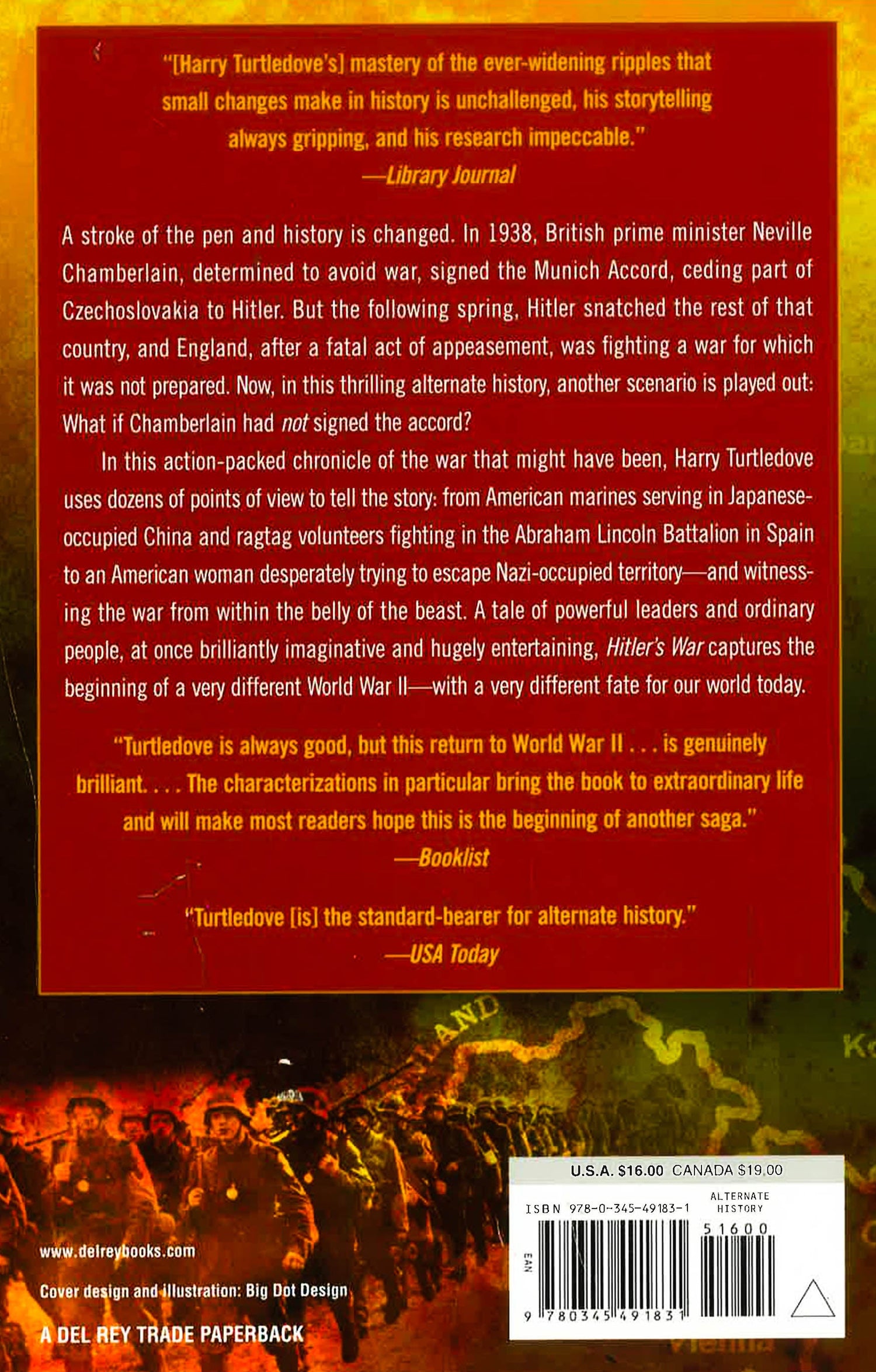 A stroke of the pen and history is changed. In 1938, British prime minister Neville Chamberlain, determined to avoid war, signed the Munich Accord, ceding part of Czechoslovakia to Hitler. But the following spring, Hitler snatched the rest of that country, and England, after a fatal act of appeasement, was fighting a war for which it was not prepared. Now, in this thrilling alternate history, another scenario is played out: What if Chamberlain had not signed the accord? In this action-packed chronicle of the war that might have been, Harry Turtledove uses dozens of points of view to tell the story: from American marines serving in Japanese-occupied China and ragtag volunteers fighting in the Abraham Lincoln Battalion in Spain to an American woman desperately trying to escape Nazi-occupied territory--and witnessing the war from within the belly of the beast. A tale of powerful leaders and ordinary people, at once brilliantly imaginative and hugely entertaining, Hitler's War captures the beginning of a very different World War II--with a very different fate for our world today.
