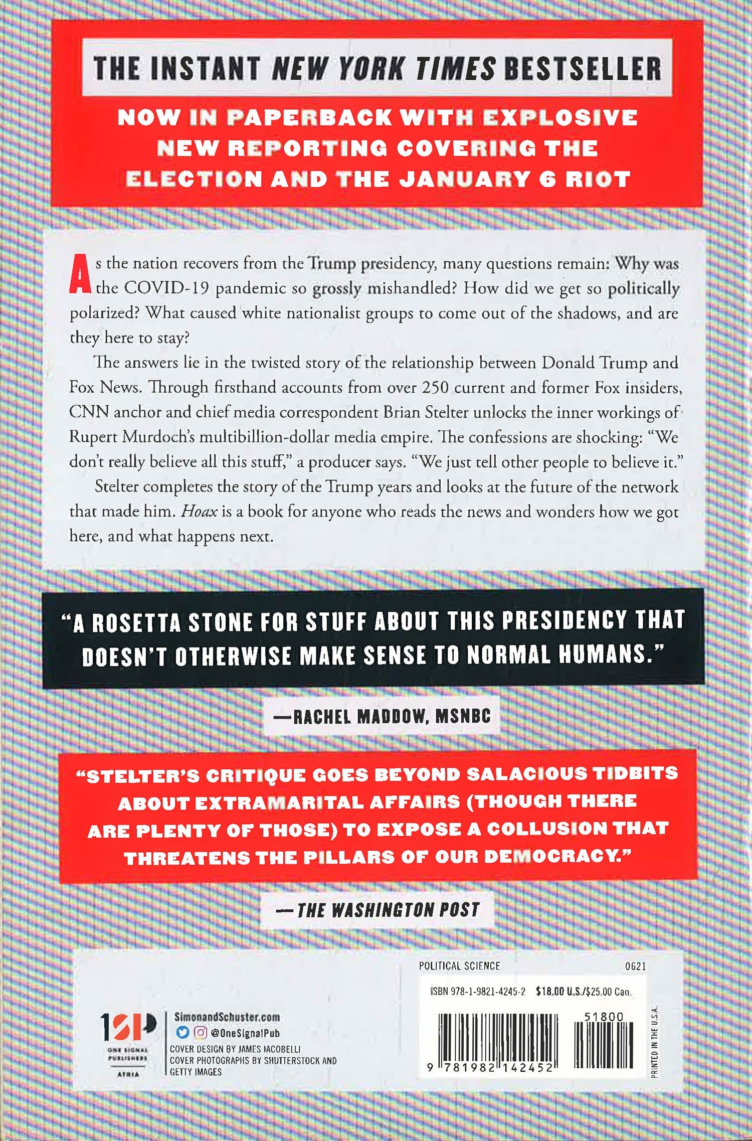 Stelter completes the story of the Trump years and looks toward the future of the network that made him. Hoax is a book for anyone who reads the news and wonders how we got here, and what happens next.