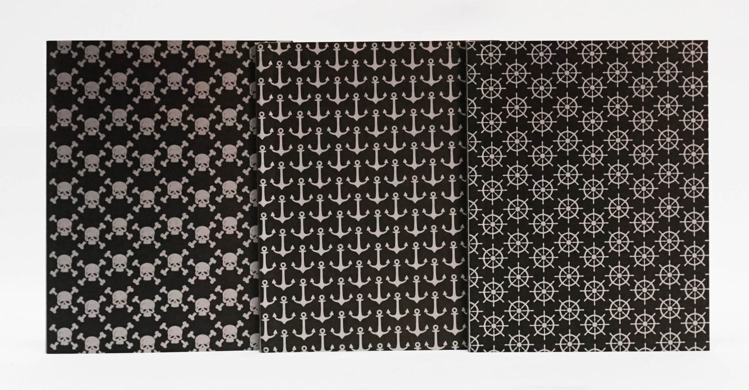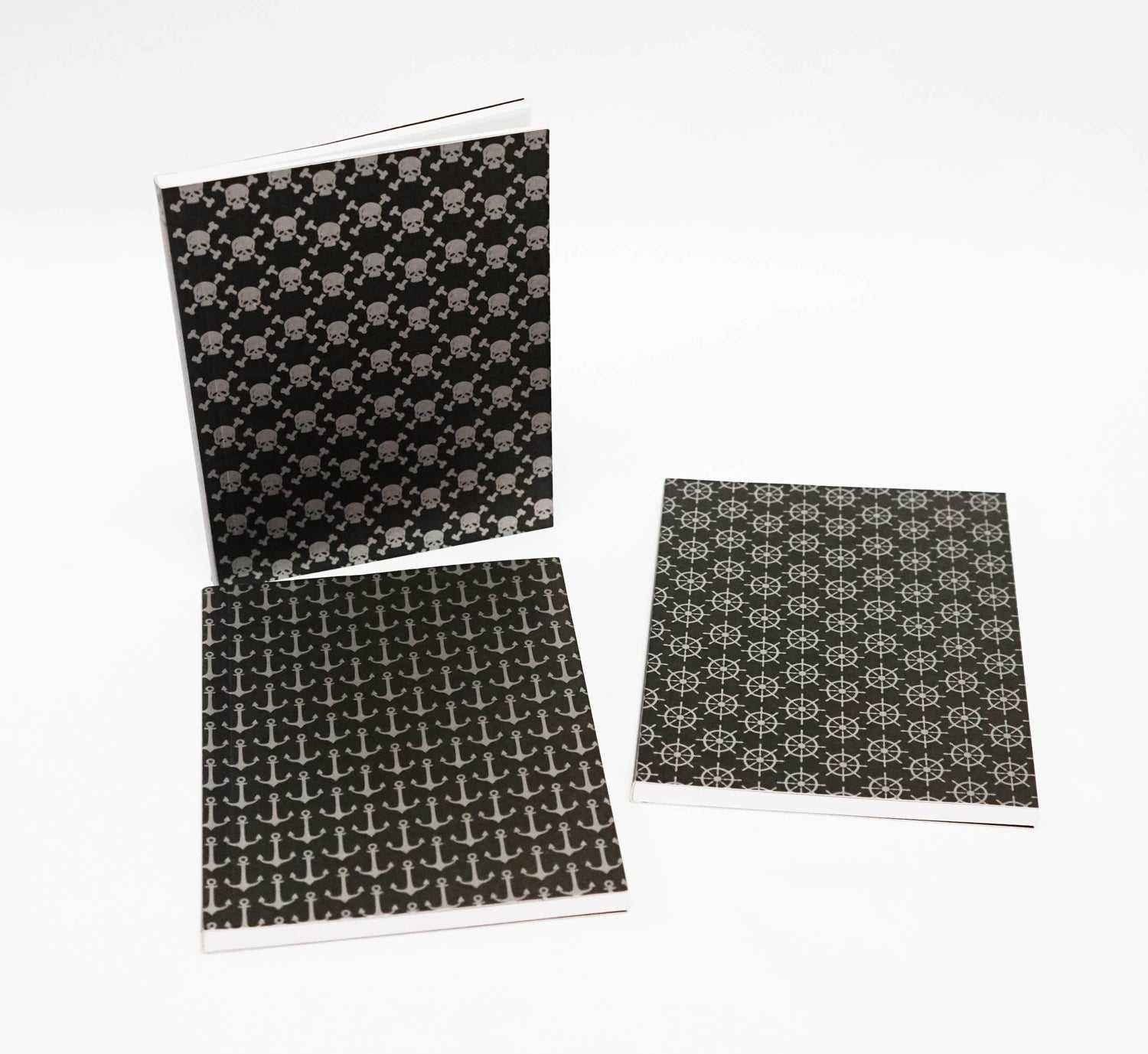 This three journal set is awash with swashbuckling style! Perfect for on-the-go note-taking, these journals have 96 lined pages each, and fit into almost any bag. The set features three designs - anchors, ship's wheels, and skull-and-crossbones - printed with a subtle metallic sheen, and is bound with red and black twine. A great gift for the worthy mate on your crew.