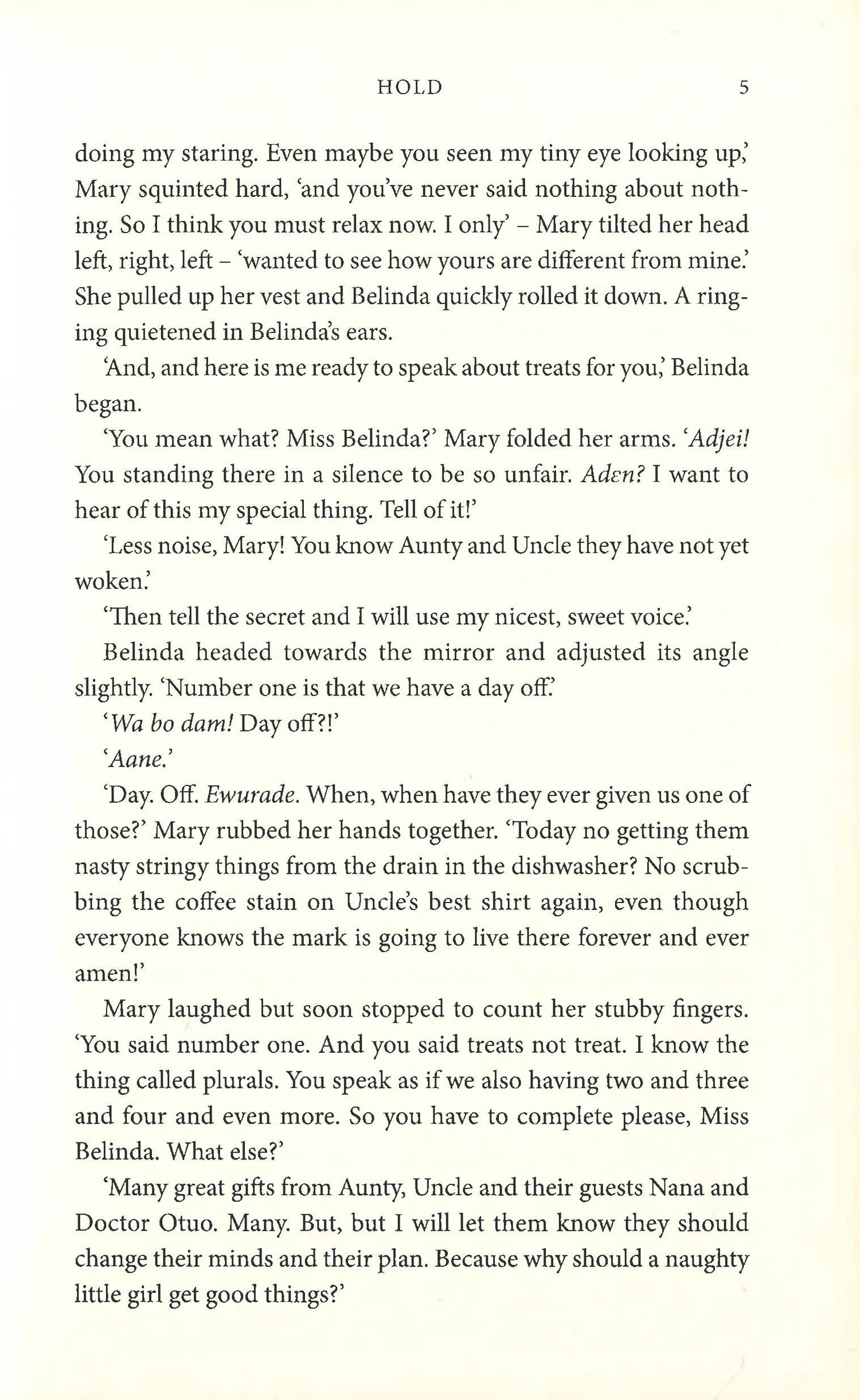 Moving between Ghana and London, Hold is an intimate, powerful coming-of-age novel. It's a story of friendship and family, shame and forgiveness; of learning what we should cling to, and when we need to let go. Belinda knows how to follow the rules. As a housegirl, she has learnt the right way to polish water glasses, to wash and fold a hundred handkerchiefs, and to keep a tight lid on memories of the village she left behind when she came to Kumasi. Mary is still learning the rules. Eleven-years old and irrepressible, the young housegirl-in-training is the little sister Belinda never had. Amma has had enough of the rules. A straight-A pupil at her exclusive South-London school, she has always been the pride of her Ghanaian parents. Until now. Watching their once-confident teenager grow sullen and wayward, they decide that sensible Belinda might be just the shining example Amma needs. So Belinda is summoned from Ghana to London, and must leave Mary to befriend a troubled girl who shows no desire for her friendship. She encounters a city as bewildering as it is thrilling, and tries to impose order on her unsettling new world. As the Brixton summer turns to Autumn, Belinda and Amma are surprised to discover the beginnings of an unexpected kinship. But when the cracks in their defences open up, the secrets they have both been holding tightly threaten to seep out.