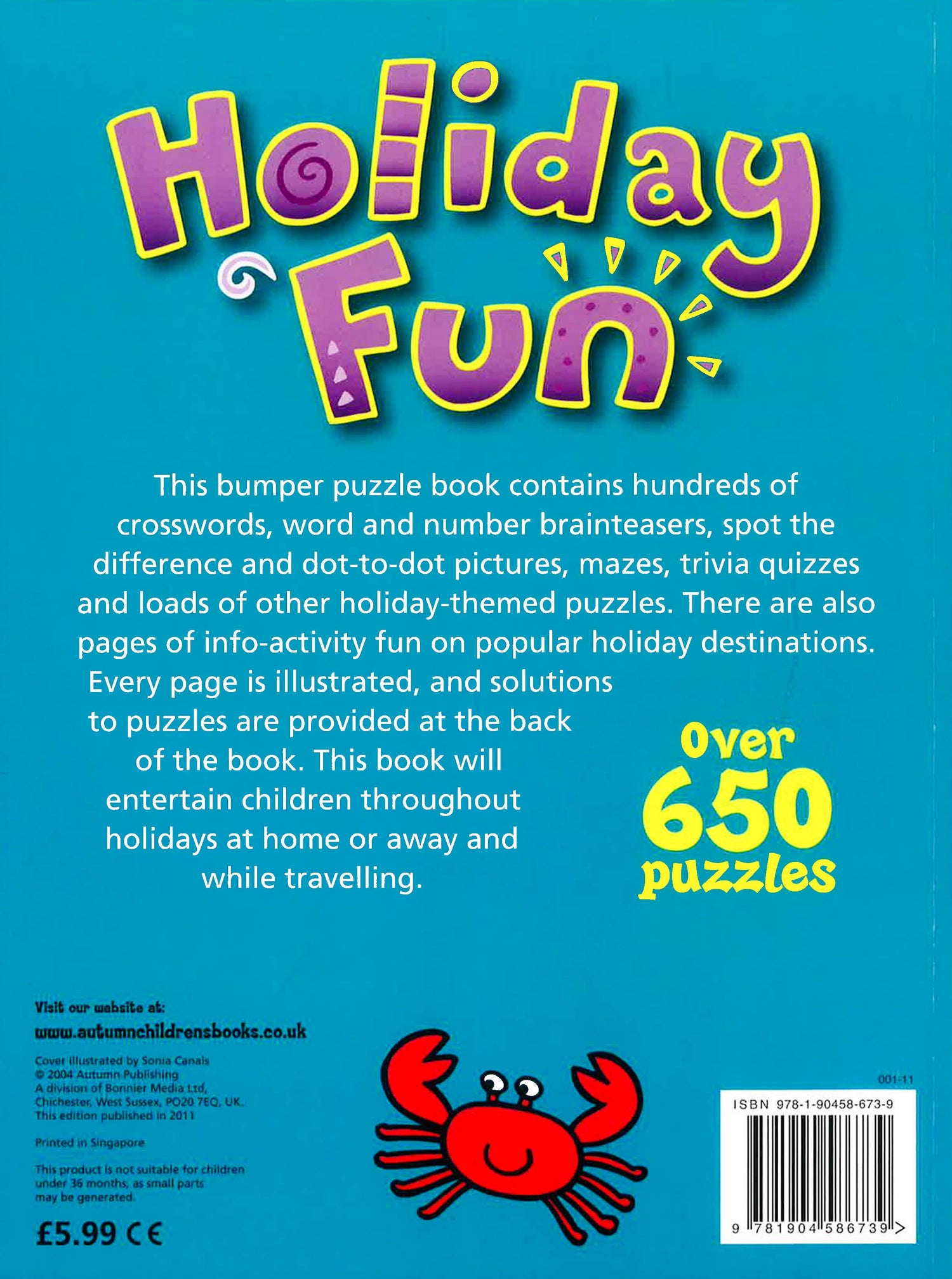 A bumper puzzle book containing hundreds of crosswords, brainteasers, spot the difference pictures, mazes, trivia quizzes and lots of other holiday-themed puzzles. There are also pages of info-activity fun on popular holiday destinations. This book is designed to entertain children throughout holidays at home or away and travelling.