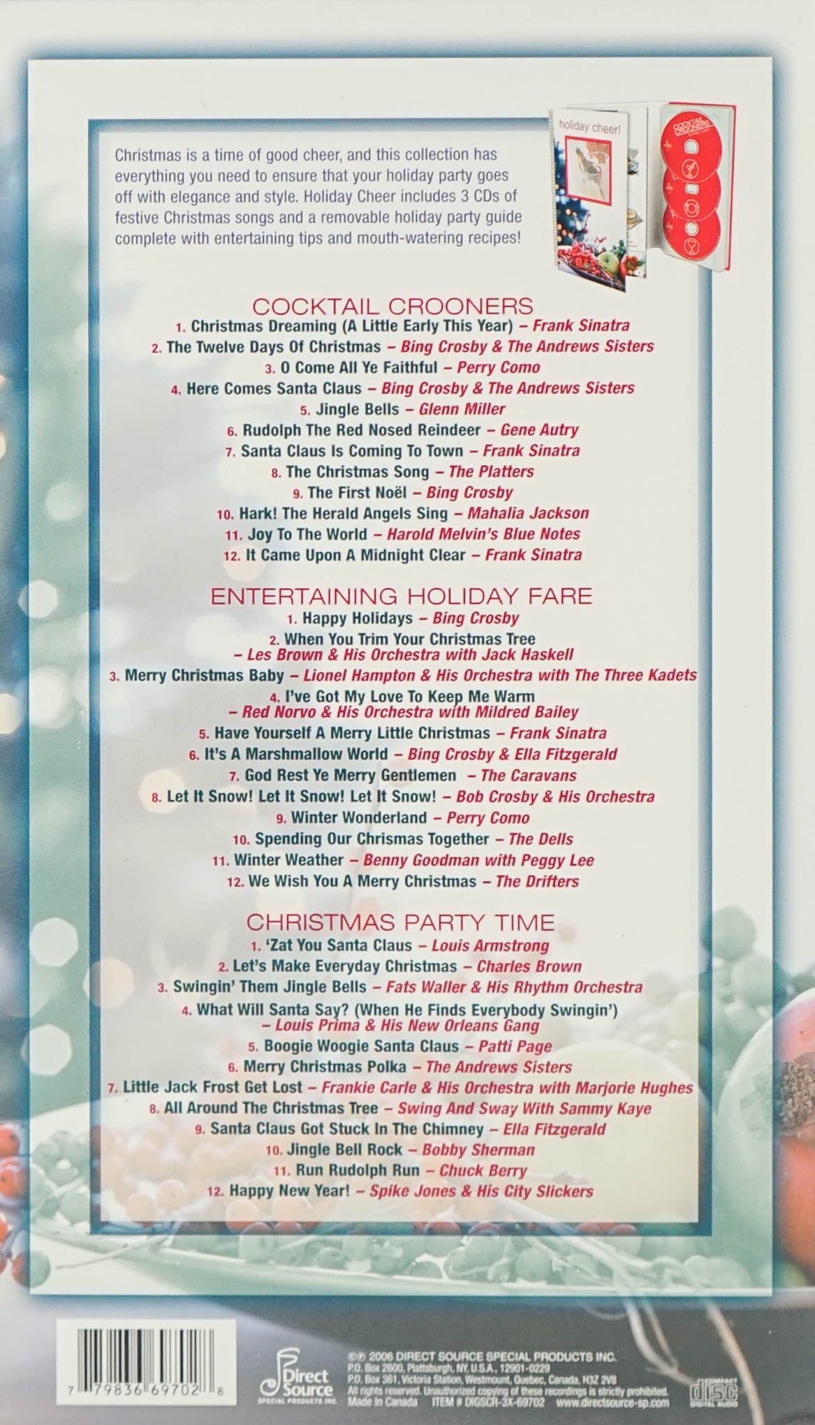 Christmas is a time of good cheer, and this collection has everything you need to ensure that your holiday party goes off with elegance and style. Holiday Cheer includes 3 CDs of festive Christmas songs and a removable holiday party guide complete with entertaning tips and mouth-watering recipes!