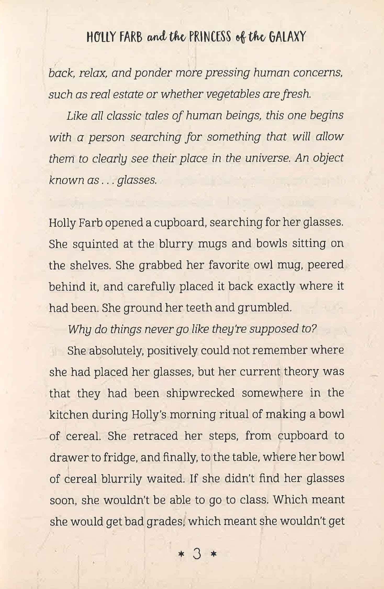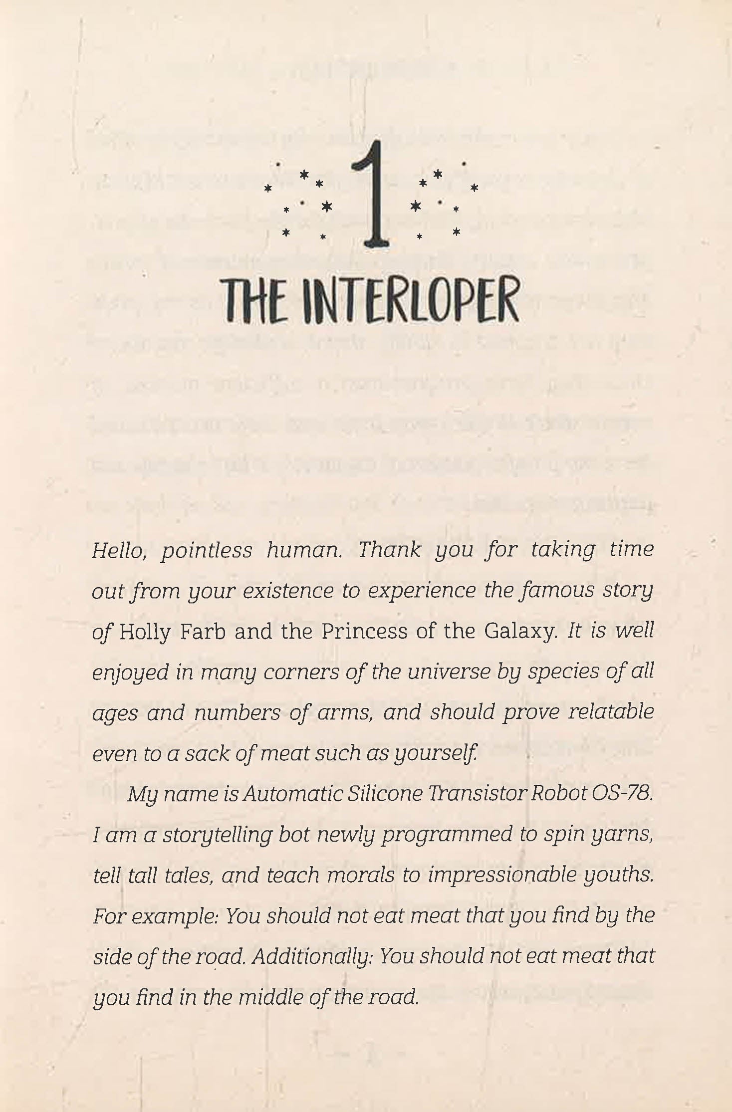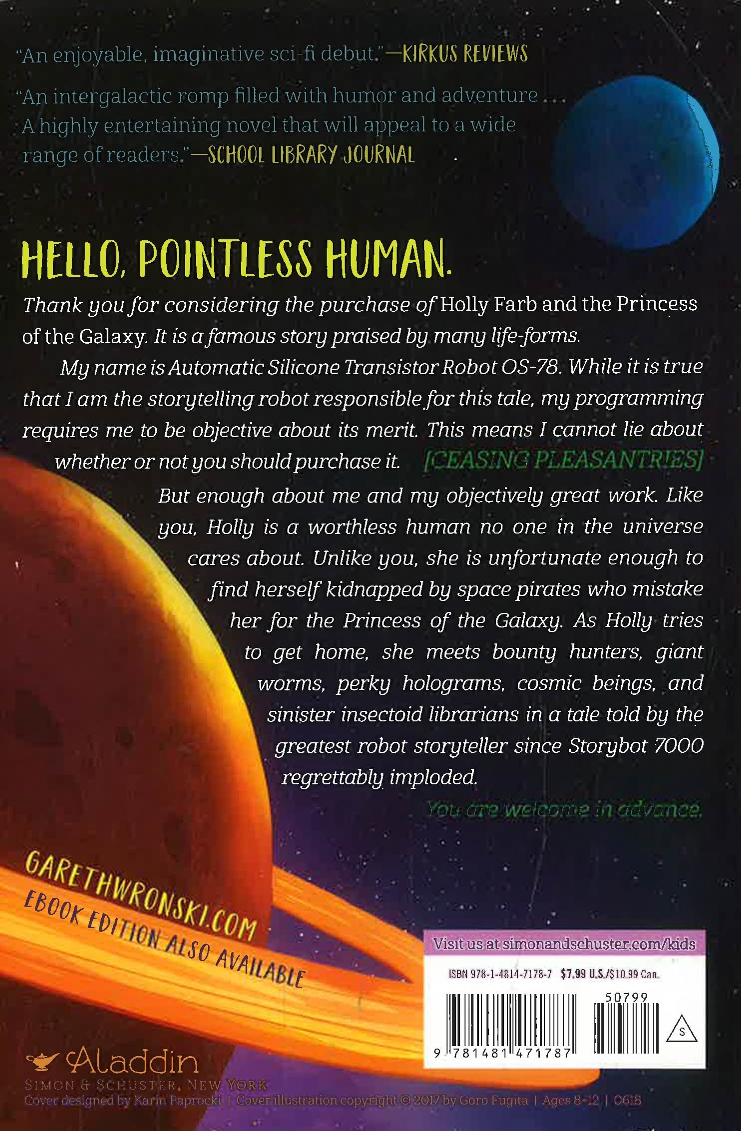 Guardians of the Galaxy meets Hitchhiker's Guide to the Galaxy in this laugh-out-loud funny journey into space and beyond! Holly Farb is not the Princess of the Galaxy. She may be top of the class in every subject, but she can't even win a school election, never mind rule the Milky Way. The aliens who kidnapped her have gotten it all wrong. Unfortunately Holly's alien pirate kidnappers believe that she's the princess they've been looking for, and so she finds herself hurtling through space on an alien pirate ship together with her teacher, Mr. Mendez, and Chester, the most annoying boy in her class. Now all she has to do is escape the pirates, find the missing princess, and get back to Earth in time for her big test on Friday. But it turns out that space is a pretty big place, and before they can go home, Holly, Chester, and Mr. Mendez must face down space cruise liners, bounty hunters, giant worms, perky holograms, cosmic board games, sinister insectoid librarians, and a robot who is learning how to lie. Between running from space pirates, defying the President of the Universe, and meeting a host of rather unusual new friends, Holly starts to wonder if there might be more to life than being top of the class after all.