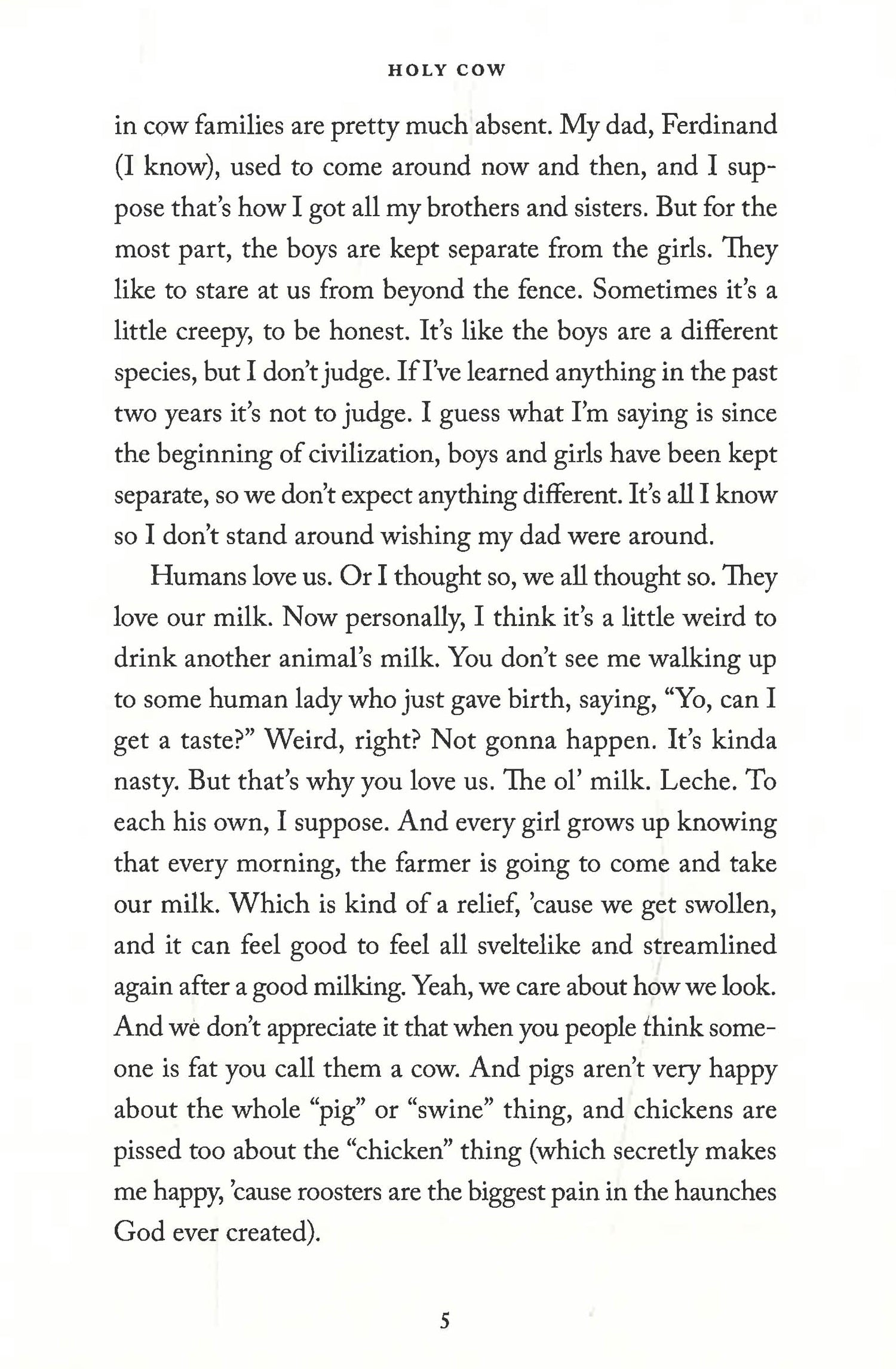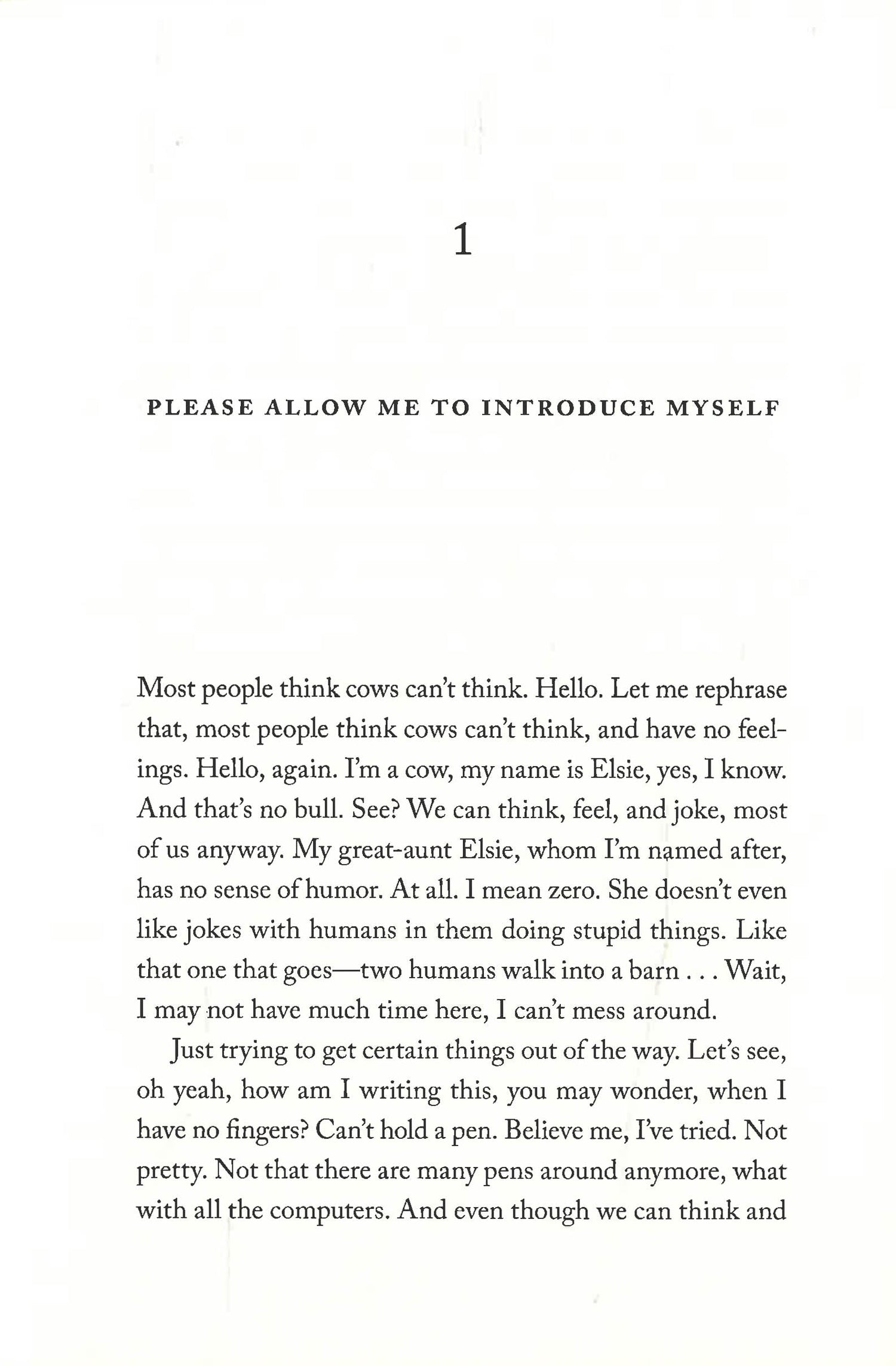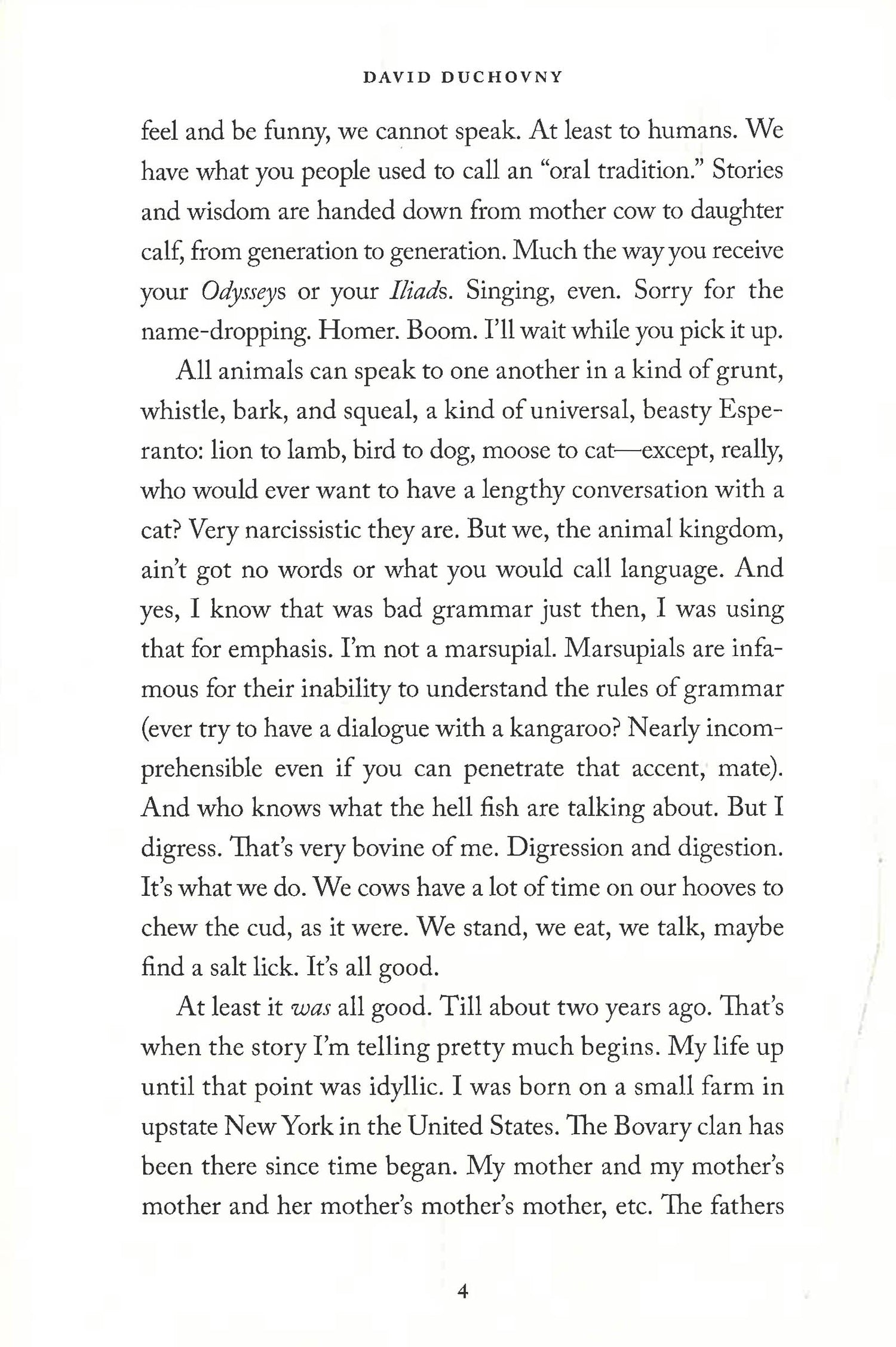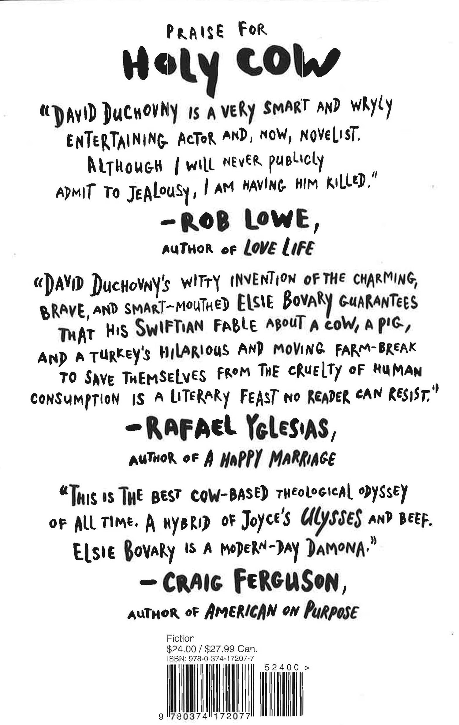 Elsie Bovary is a cow, and a pretty happy one at that-her long, lazy days are spent eating, napping, and chatting with her best friend, Mallory. One night, Elsie and Mallory sneak out of their pasture; but while Mallory is interested in flirting with the neighboring bulls, Elsie finds herself drawn to the farmhouse. Through the window, she sees the farmer's family gathered around a bright Box God-and what the Box God reveals about something called an "industrial meat farm" shakes Elsie's understanding of her world to its core. There's only one solution: escape to a better, safer world. And so a motley crew is formed: Elsie; Jerry-excuse me, Shalom-a cranky, Torah-reading pig who's recently converted to Judaism; and Tom, a suave (in his own mind, at least) turkey who can't fly, but who "can" work an iPhone with his beak. Toting stolen passports and slapdash human disguises, they head for the airport. Elsie is our wise-cracking, pop-culture-reference-dropping, slyly witty narrator; Tom-who does eventually learn to fly (sort of)-dispenses psychiatric advice in a fake German accent; and Shalom, rejected by his adopted people in Jerusalem, ends up unexpectedly uniting Israelis and Palestinians. David Duchovny's charismatic creatures point the way toward a mutual understanding and acceptance that the world desperately needs.