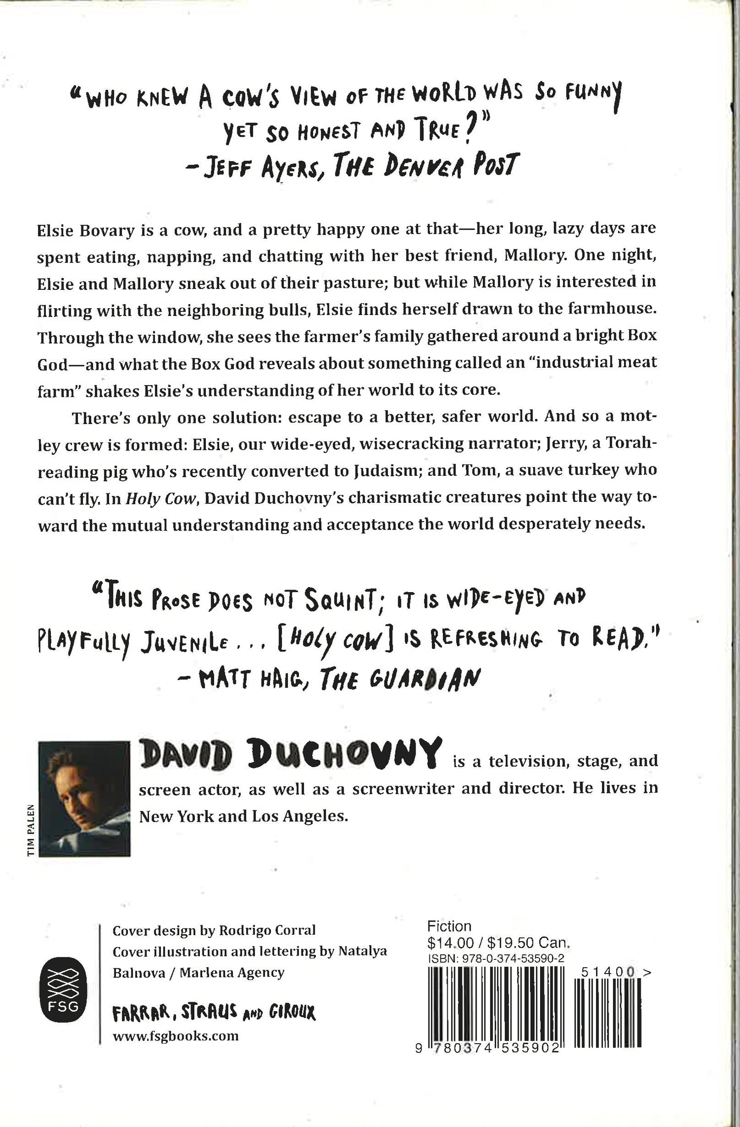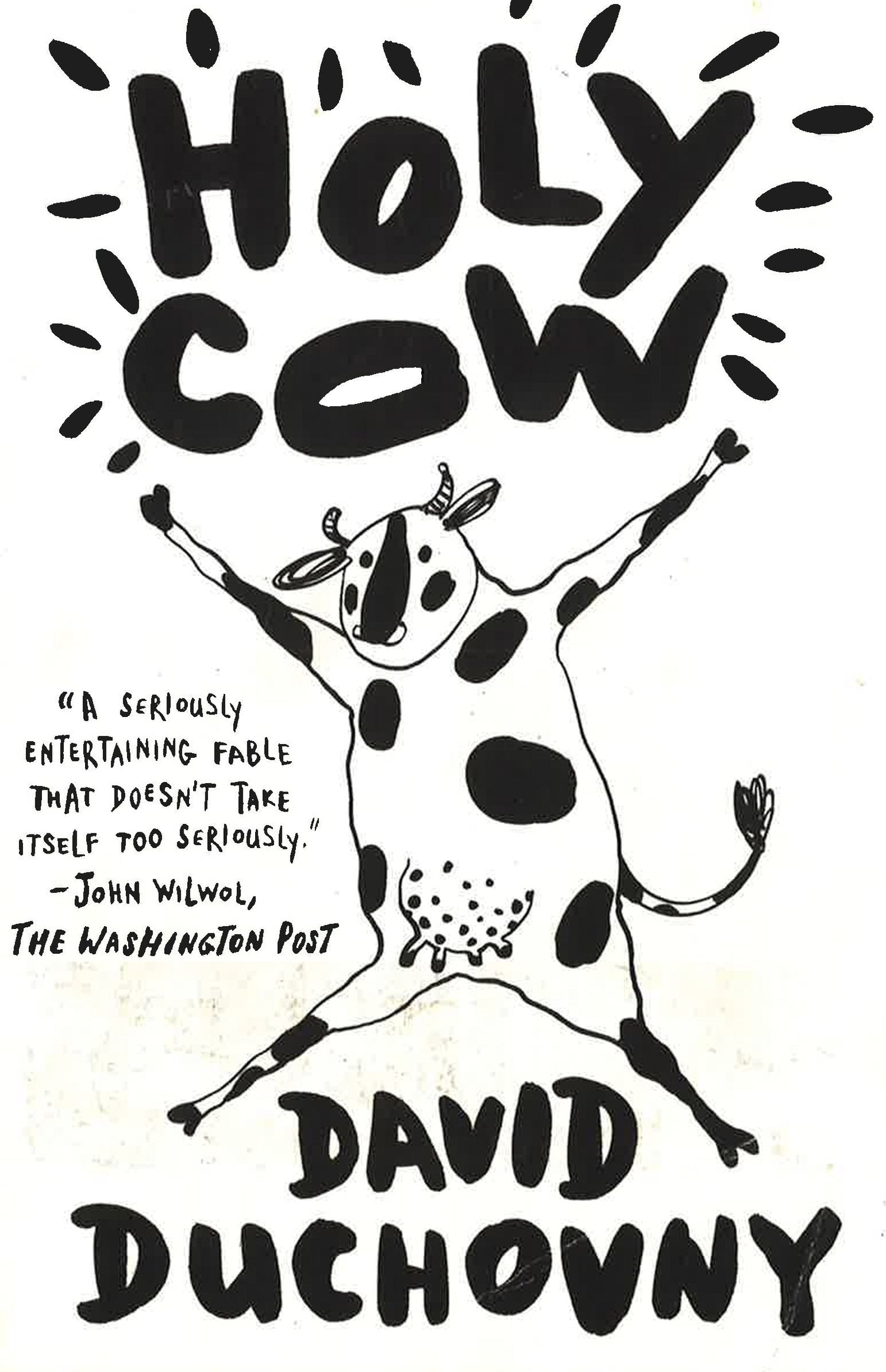 A rollicking, globe-trotting adventure with a twist: a four-legged heroine you won't soon forget.Elsie Bovary is a cow, and a pretty happy one at that--her long, lazy days are spent eating, napping, and chatting with her best friend, Mallory. One night, Elsie and Mallory sneak out of their pasture; but while Mallory is interested in flirting with the neighboring bulls, Elsie finds herself drawn to the farmhouse. Through the window, she sees the farmer's family gathered around a bright Box God--and what the Box God reveals about something called an "industrial meat farm" shakes Elsie's understanding of her world to its core.There's only one solution: escape to a better, safer world. And so a motley crew is formed: Elsie; Jerry--excuse me, Shalom--a cranky, Torah-reading pig who's recently converted to Judaism; and Tom, a suave (in his own mind, at least) turkey who can't fly, but who can work an iPhone with his beak. Toting stolen passports and slapdash human disguises, they head for the airport.Elsie is our wisecracking, pop-culture-reference-dropping, slyly witty narrator; Tom--who does eventually learn to fly (sort of)--dispenses psychiatric advice in a fake German accent; and Shalom, rejected by his adopted people in Jerusalem, ends up unexpectedly uniting Israelis and Palestinians. In Holy Cow, David Duchovny's charismatic creatures point the way toward a mutual understanding and acceptance that the world desperately needs.