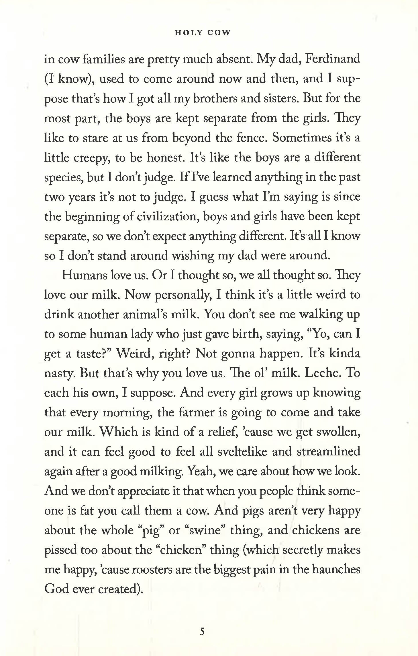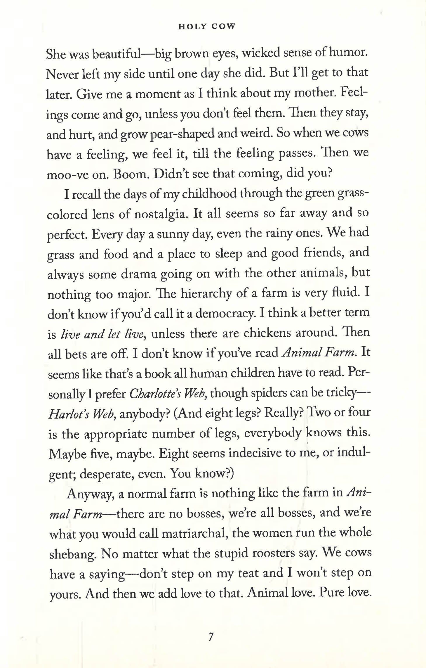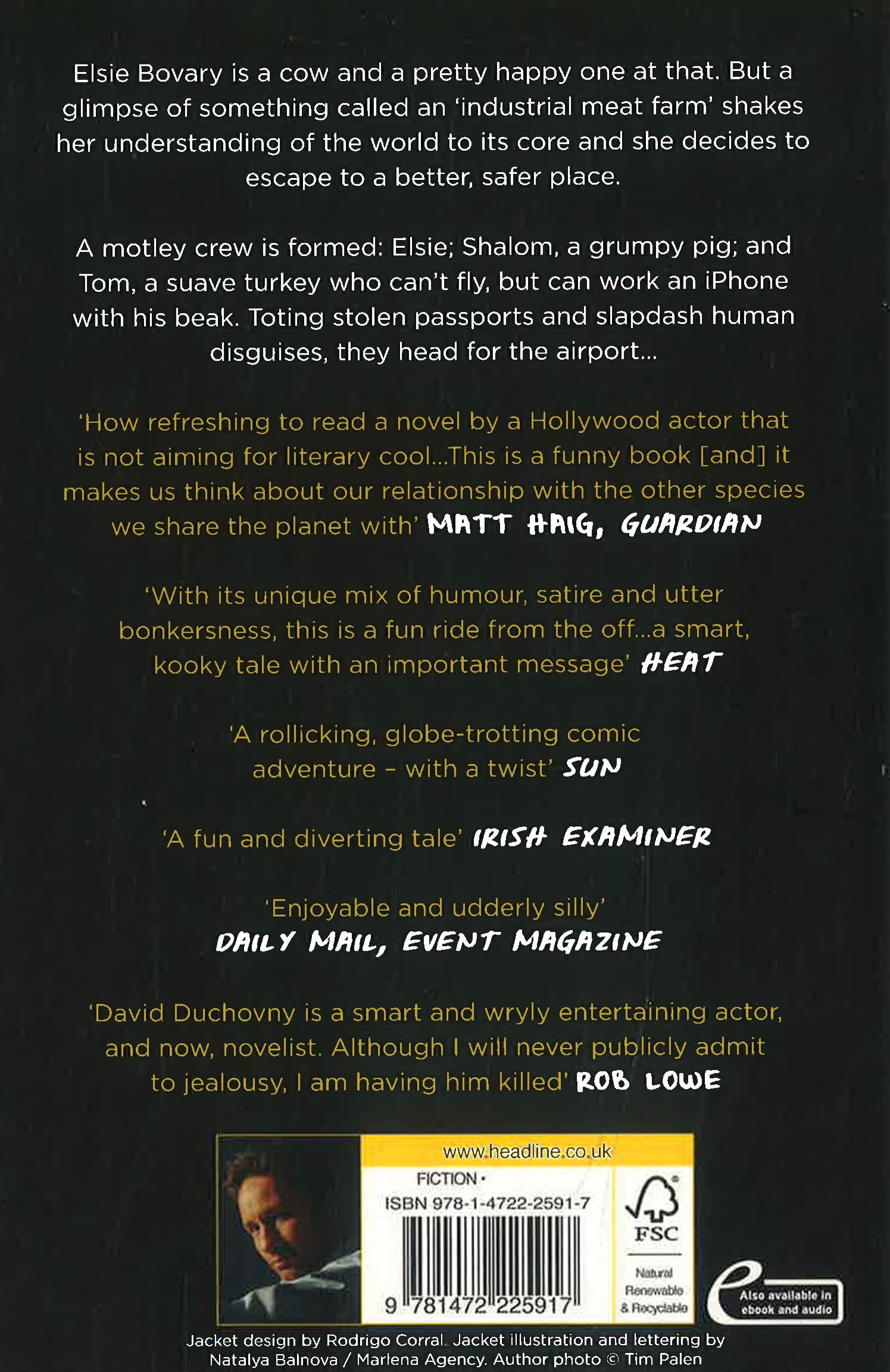 Holy Cow by David Duchovny is a comic delight that will thrill fans of Jasper Fforde and Ben Aaronovitch. And anyone who enjoys a witty wisecrack in a novel.Elsie Bovary is a cow and a pretty happy one at that. Until one night, Elsie sneaks out of the pasture and finds herself drawn to the farmhouse. Through the window, she sees the farmer's family gathered around a bright Box God - and what the Box God reveals about something called an 'industrial meat farm' shakes Elsie's understanding of her world to its core.The only solution? To escape to a better, safer world. And so a motley crew is formed: Elsie; Shalom, a grumpy pig who's recently converted to Judaism; and Tom, a suave turkey who can't fly, but can work an iPhone with his beak. Toting stolen passports and slapdash human disguises, they head for the airport ...Elsie is a wise-cracking, slyly witty narrator; Tom dispenses psychiatric advice in a fake German accent; and Shalom ends up unexpectedly uniting Israelis and Palestinians. David Duchovny's charismatic creatures point the way toward a mutual understanding and acceptance the world desperately needs.