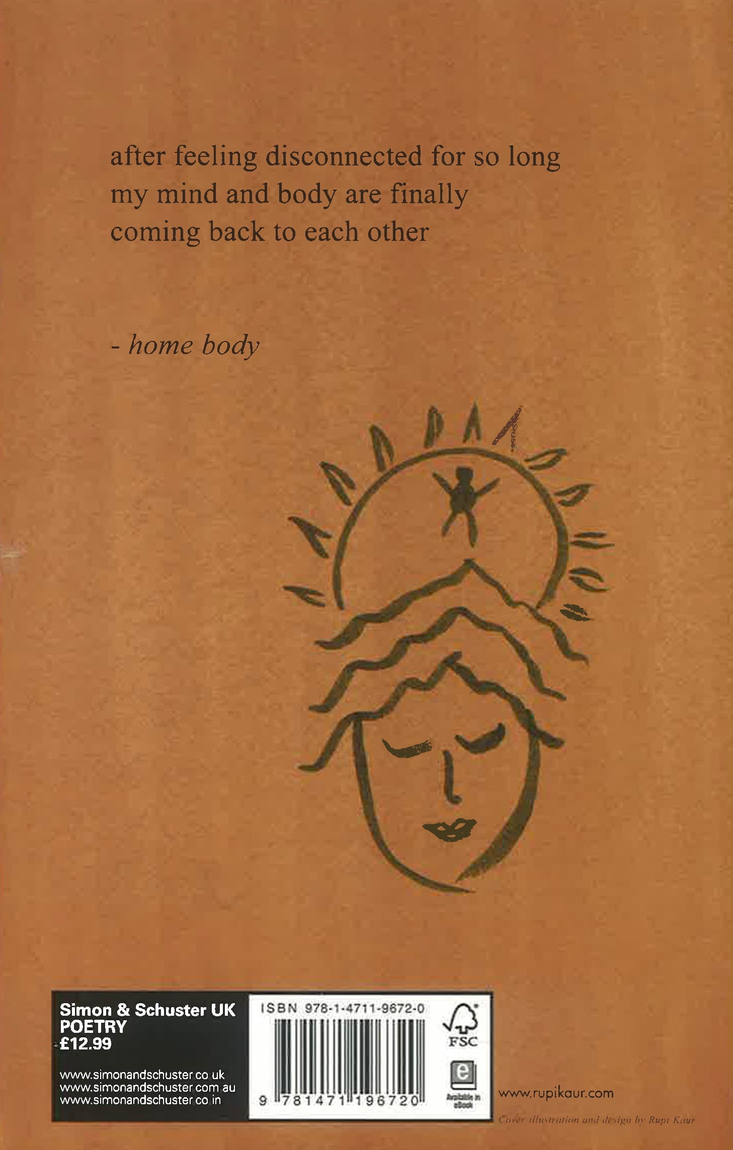 rupi kaur constantly embraces growth, and in home body, she walks readers through a reflective and intimate journey visiting the past, the present and the potential of the self. home body is a collection of raw, honest conversations with oneself - reminding readers to fill up on love, acceptance, community, family, and embrace change. illustrated by the author, themes of nature and nurture, light and dark, rest here.