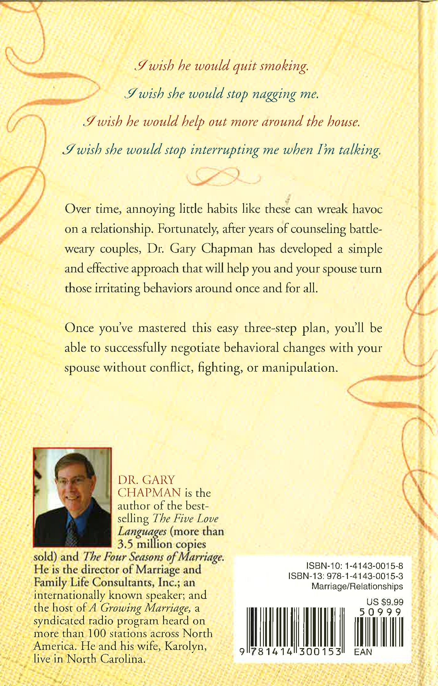 Those annoying habits can be damaging to a relationship over time. There's hope for change. Dr. Chapman provides a do-it-yourself approach to helping couples learn to overcome bad habits. By learning and using Dr. Chapman's simple 3-step process (admitting and asking forgiveness for your own past failures; discovering and speaking your spouse's love language; and learning the proper time, place, and way to request behavioral change), couples will be able to successfully negotiate change without resorting to arguing or manipulation.