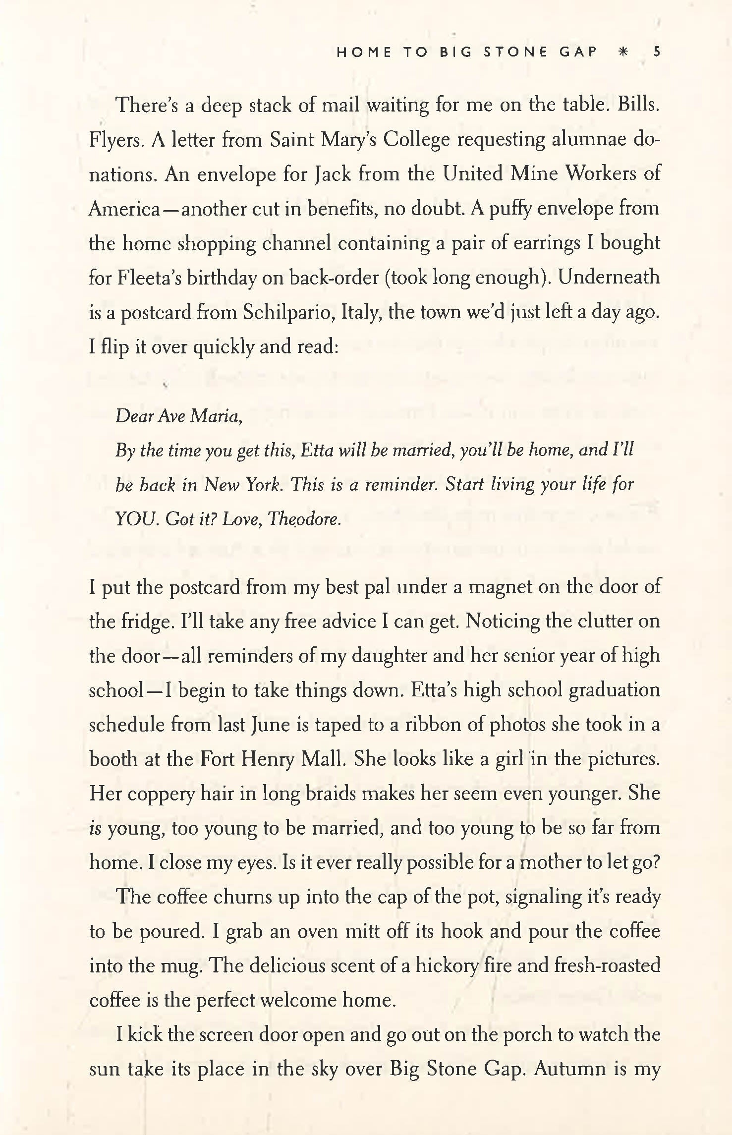 Big Stone Gap is a sleepy village where people can go their whole lives without leaving. It’s been the home of Ave Maria and her family for generations, but with her daughter now married and living in Italy, Ave realises it’s time to go in search of a new dream. Yet before her journey can begin, her life is turned upside down.
