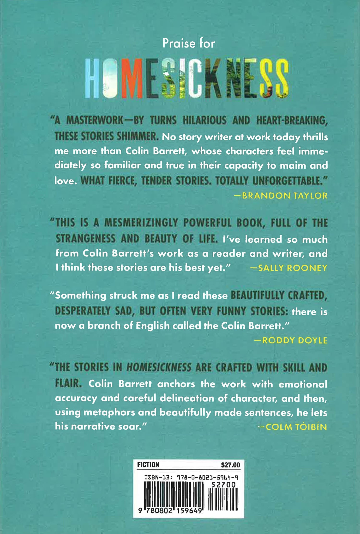 The second piece of fiction from a "lyrical and tough and smart" (Anne Enright) voice in contemporary Irish literature, Homesickness marks Colin Barrett out as our most brilliantly original and captivating storyteller.