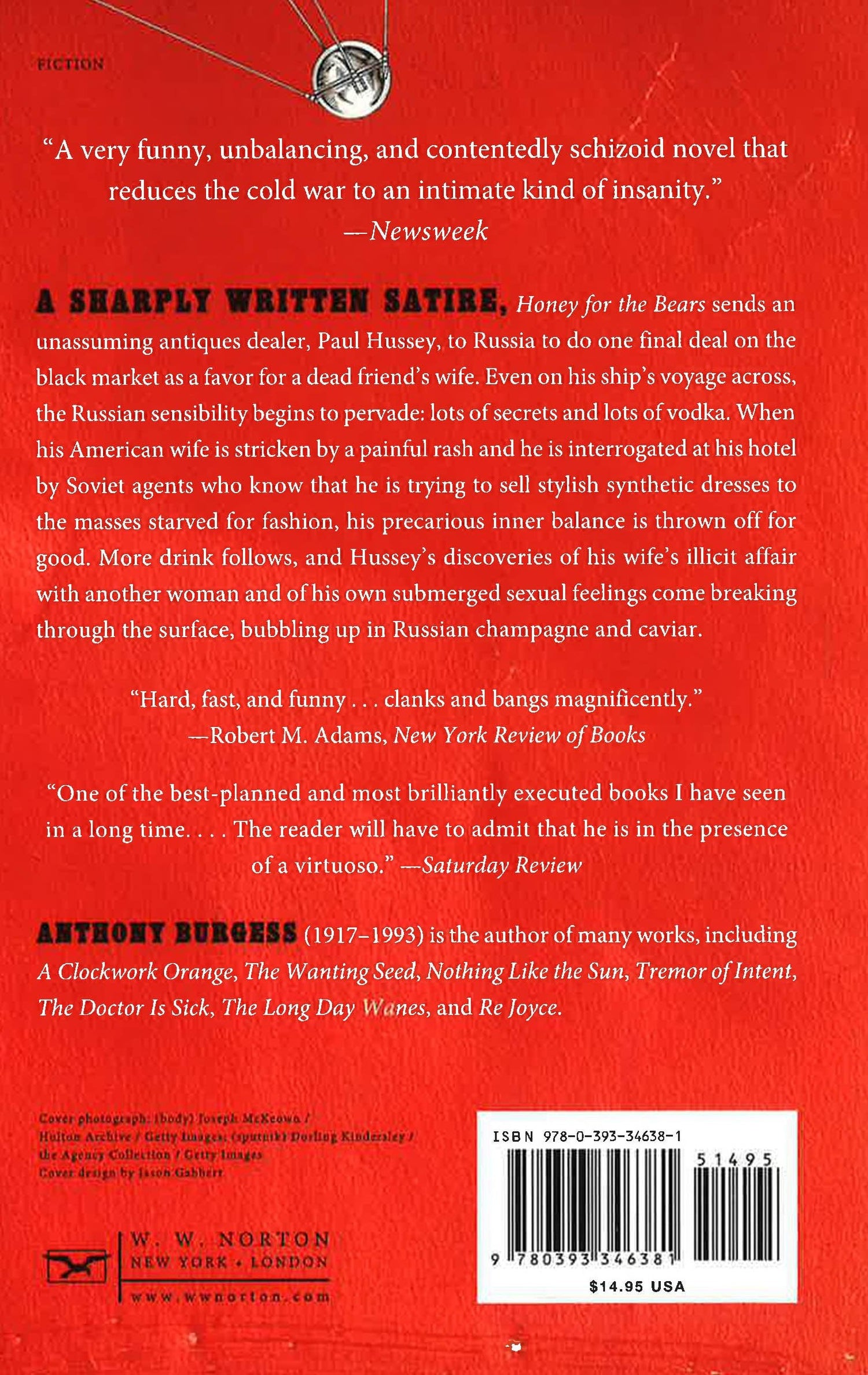 A sharply written satire, Honey for the Bears sends an unassuming antiques dealer, Paul Hussey, to Russia to do one final deal on the black market as a favor for a dead friend's wife. Even on the ship's voyage across, the Russian sensibility begins to pervade: lots of secrets and lots of vodka. When his American wife is stricken by a painful rash and he is interrogated at his hotel by Soviet agents who know that he is trying to sell stylish synthetic dresses to the masses starved for fashion, his precarious inner balance is thrown off for good. More drink follows, discoveries of his wife's illicit affair with another woman, and his own submerged sexual feelings come breaking through the surface, bubbling up in Russian champagne and caviar.