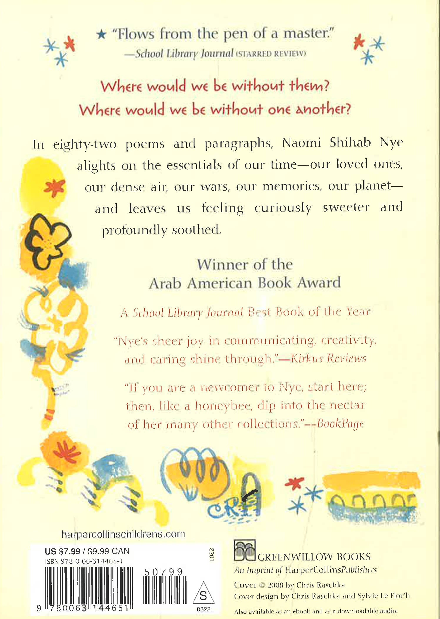 In eighty-two poems and paragraphs (including the renowned Gate A-4), Naomi Shihab Nye alights on the essentials of our time—our loved ones, our dense air, our wars, our memories, our planet—and leaves us feeling curiously sweeter and profoundly soothed.