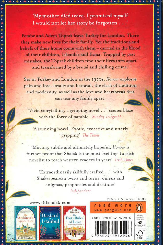 From award-winning writer Elif Shafak, the Orange Prize long-listed author of The Forty Rules of Love and The Architect's Apprentice, Honour is a tale of love, betrayal and clashing cultures. "A powerful book; thoughtful, provoking and compassionate." (Joanne Harris, author of Chocolat). 'My mother died twice. I promised myself I would not let her story be forgotten ...' Leaving her twin sister behind, Pembe leaves Turkey for love - following her husband Adem to London. There the Topraks hope to make new lives for themselves and their children. Yet, no matter how far they travel, the traditions and beliefs the Topraks left behind stay with them - carried in the blood. Their eldest is the boy Iskender, who remembers Turkey and feels betrayal deeper than most. His sister is Esma, who is loyal and true despite the pain and heartache. And, lastly, Yunus, who was born in London, and is shy and different. Trapped by the mistakes of the past, the Toprak children find their lives shattered and transformed by a brutal act of murder...A powerful novel set in Turkey and London in the 1970s, Honour explores pain and loss, loyalty and betrayal, the trials of the immigrant, the clash of tradition and modernity, as well as the love and heartbreak that too often tears families apart. Vivid storytelling...that explores the darkest aspects of faith and love." (Sunday Telegraph). "Rich and wide as the Euphrates river along whose banks it begins and ends, Elif Shafak has woven with masterful care and compassion one immigrant family's heartbreaking story - a story nurtured in the terrible silences between men and women trying to grow within ancient ways, all the while growing past them. I loved this book." (Sarah Blake, author of The Postmistress). "[Elif Shafak] joins writers such as Hanif Kureishi, Zadie Smith, Monica Ali, Aamer Hussein, Andrea Levy, Hanan al-Shakyh and Leila Aboulela, who offer us fictional glimpses of London's Others." (The Independent).
