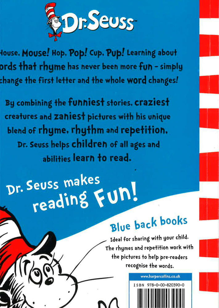 This charming book introduces young children to words that rhyme, with classic Dr. Seuss fun!This charming book introduces young children to words that rhyme, with classic Dr. Seuss fun! House, Mouse!Hop, Pop!Cup, Pup!Learning about words that rhyme has never been more fun - simply change the first letter and the whole word changes! With his unique combination of hilarious stories, zany pictures and riotous rhymes, Dr. Seuss has been delighting young children and helping them learn to read for over fifty years. As part of a major rebrand programme, HarperCollins has relaunched 17 of Dr. Seuss's best-selling books, including such perennial favourites as The Cat in the Hat, Green Eggs and Ham and Fox in Socks. In response to consumer demand, the bright new cover designs incorporate much needed guidance on reading levels, with the standard paperbacks divided into three reading strands - Blue Back Books for parents to share with young children, Green Back Books for budding readers to tackle on their own, and Yellow Back Books for older, more fluent readers to enjoy. Hop on Pop belongs to the Blue Back Book range.