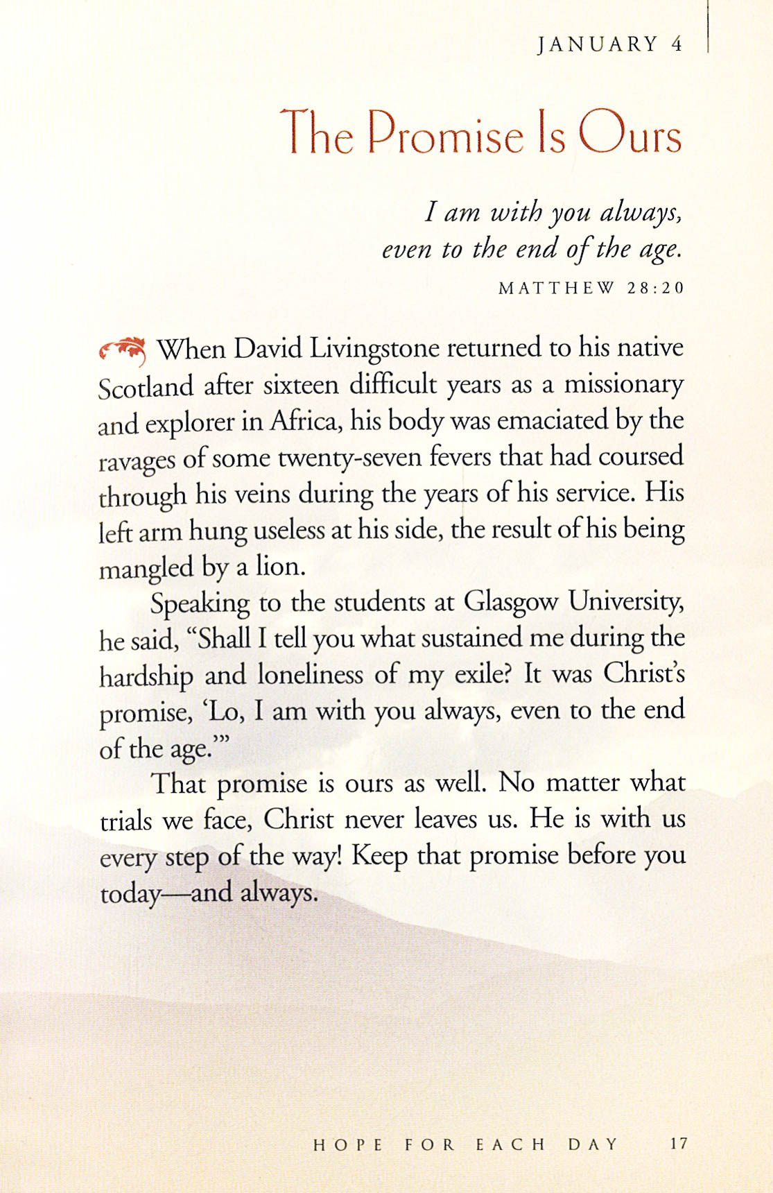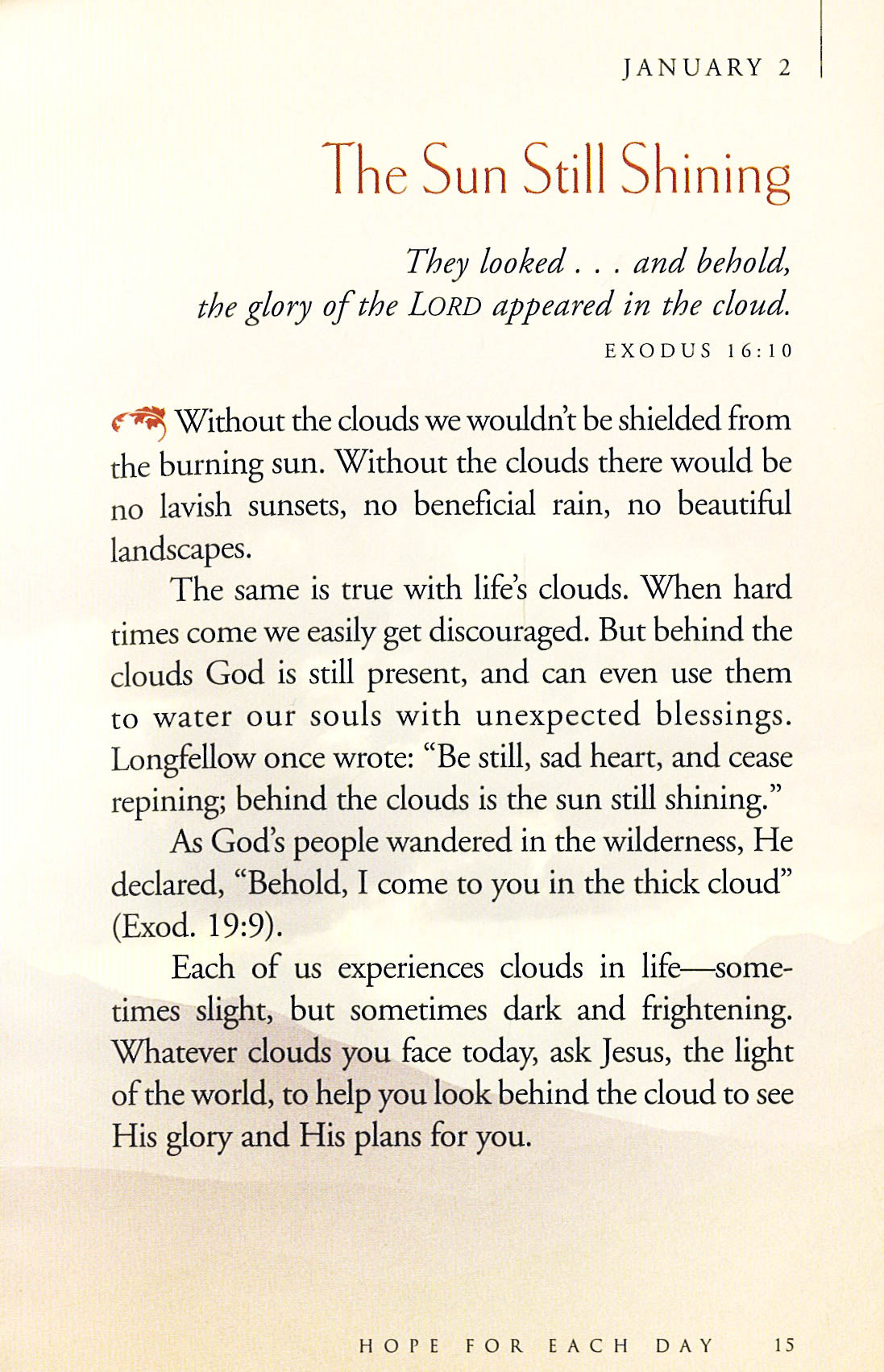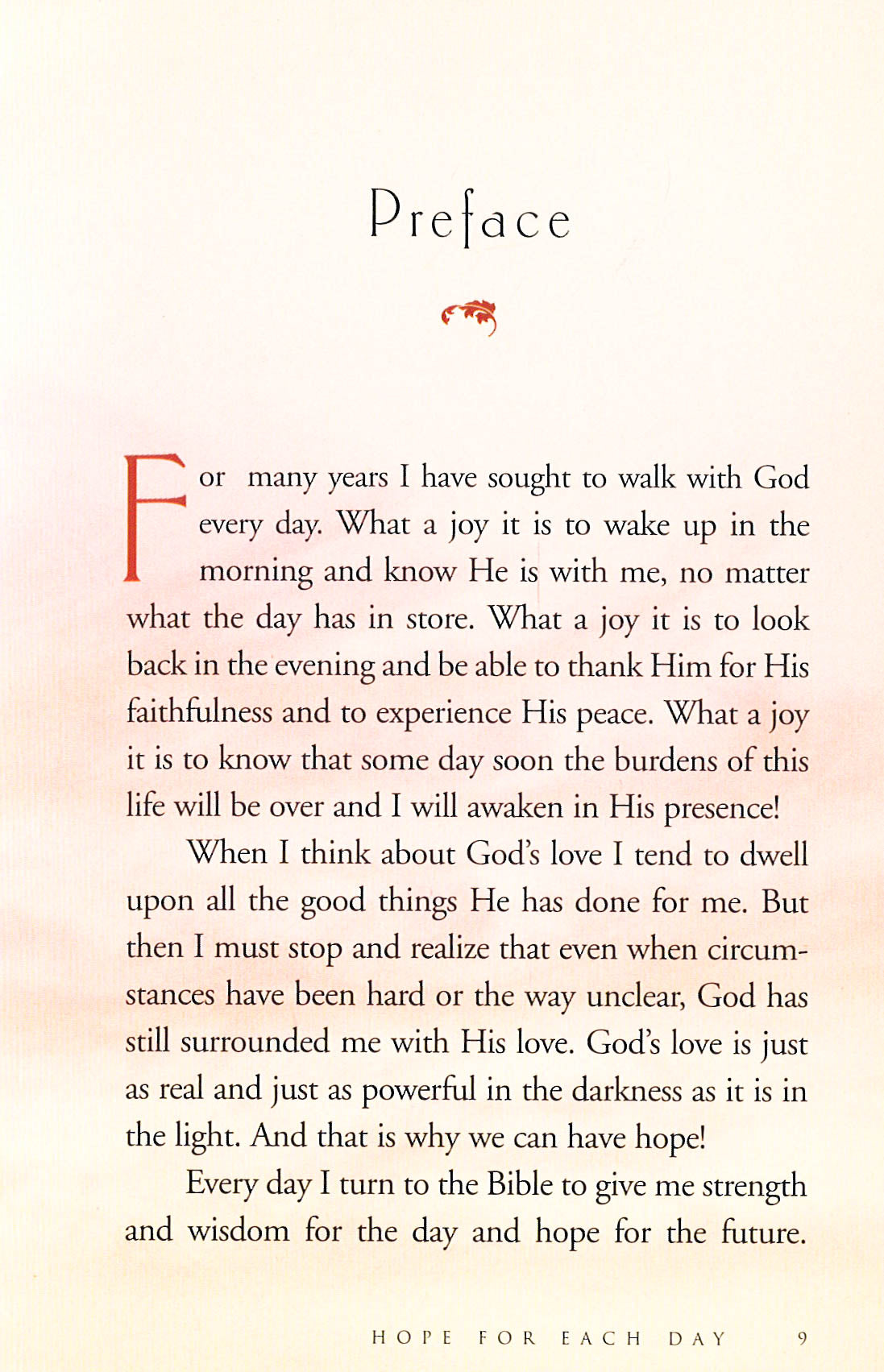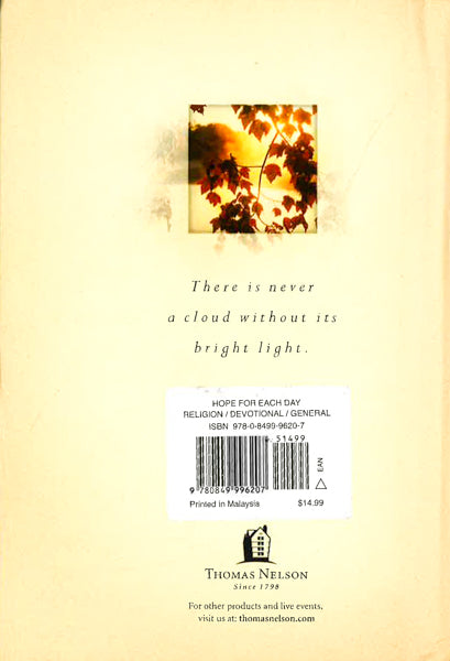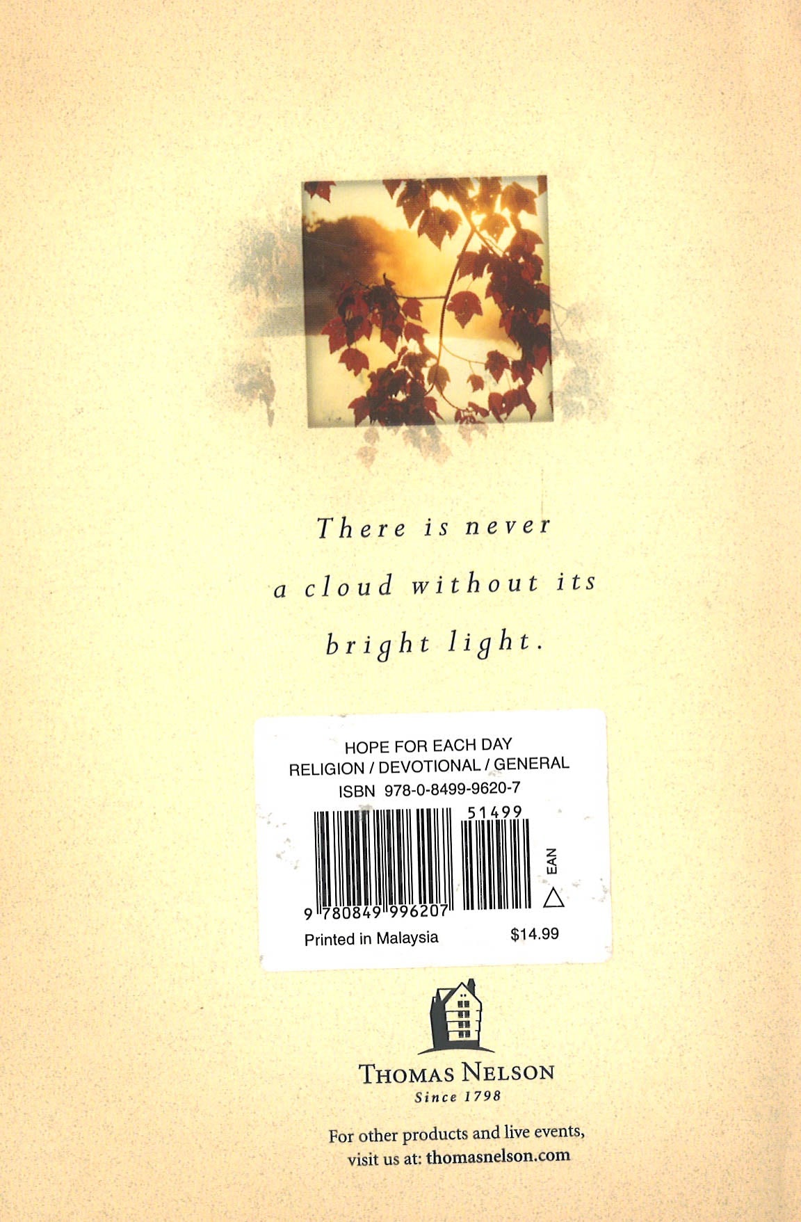 In keeping with the spirit of Max Lucado's Grace for the Moment, Charles Swindoll's Wisdom for the Way, and John MacArthur's Truth for Today comes the latest edition into the Daily Inspirations series. In Hope for Each Day, Billy Graham offers spiritual comfort to guide us through our daily lives. Rev. Graham is a national treasure and has counseled numerous political leaders and provided comfort in times of public crisis.
