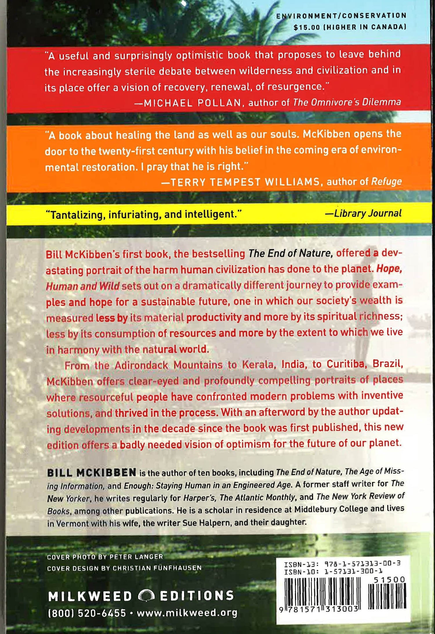 Divided into three sections, Hope, Human and Wild profiles the efforts of three caring communities to preserve wilderness and reverse environmental devastation. They include the reforestation of McKibben's home territory, New York's Adirondack Mountains; solving traffic and pollution problems in the densely populated Curitiba, Brazil; and how the citizens of Kerala, India have demonstrated that quality of life doesn't depend on overconsumption of resources. This edition features a new introduction that revisits these places and explores how they've changed over the years.