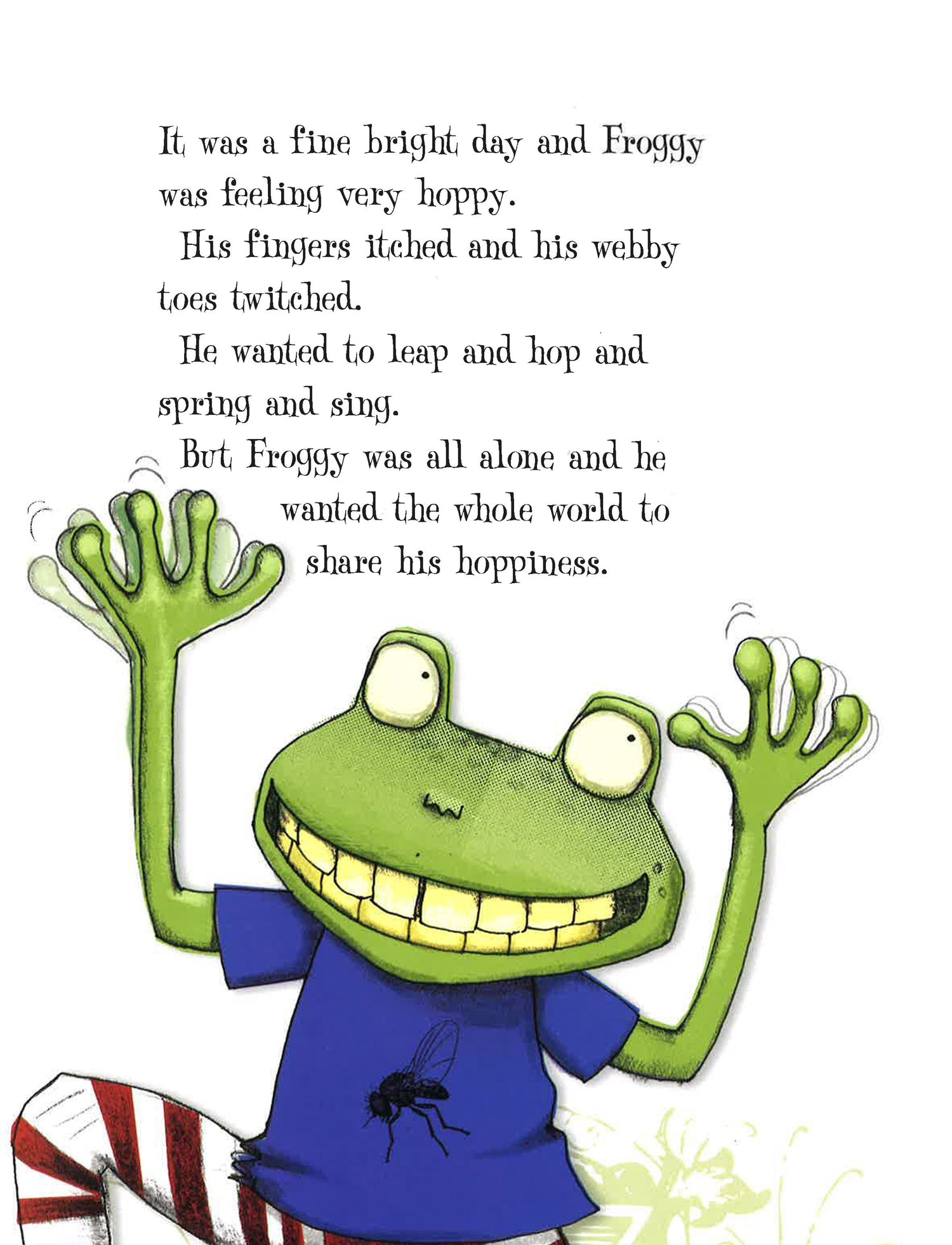 Froggy wants to share his hoppiness with the whole world, but it seems no one wants to be hoppy with himFroggy is one hoppy frog! In fact, he's so hoppy he wants to share the feeling with the whole wide world. But what's this? No one else wants to be hoppy? Poor Froggy will never end up hoppy ever after if he's all alone. He feels very lonely--until, that is, he meets one special person. . . .