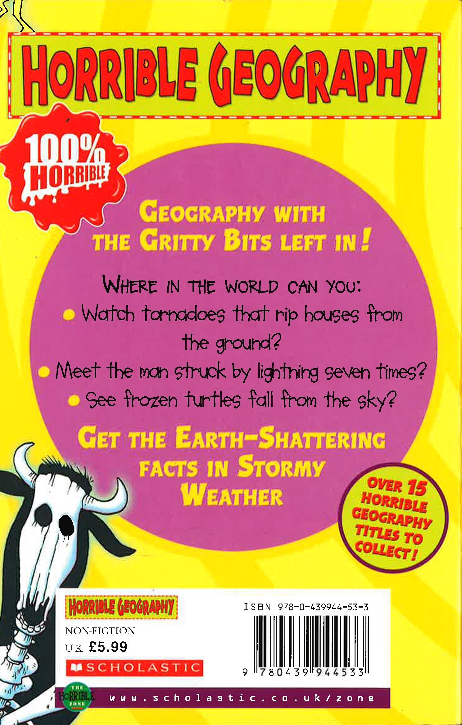Geography with the Gritty Bits left in! Where in the world can you: watch tornadoes that rip houses from the ground? meet the man struck by lightning seven times? and, see frozen turtles fall from the sky? Get the Earth-shattering facts in "Stormy Weather".