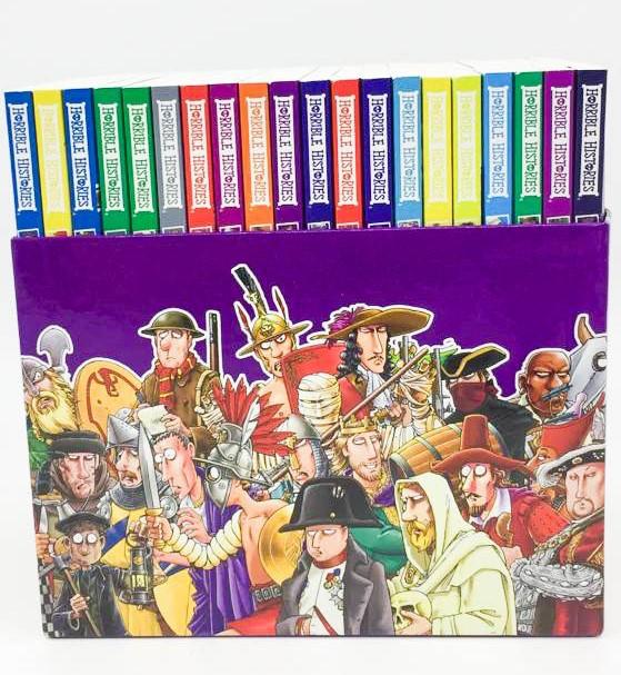 All the foul favourites from the Horrible Histories series presented in a blood-curdling box with flip-top lid. Contains twenty books and includes the Rotten Romans, Terrible Tudors and Awesome Egyptians.Titles contain: 1.Savage Stone Age 2. Awesome Egyptians 3.Groovy Greeks 4.Rotten Romans 5.Cyt-Throat Celts 6.Smashing Saxons 7.Vicious Vikings 8.Stormin' Normans 9.Angry Aztecs 10.Incredible Incas 11.Measly Middle Ages 12.Terrible Tudors 13.Slimy Stuarts 14.Gorgeous Georgians 15.Vile Victrorians 16.Villainous Victorians 17.Barmy British Empire 18. Frightful First World War 19.Woeful Second World War 20.Blitzed Brits