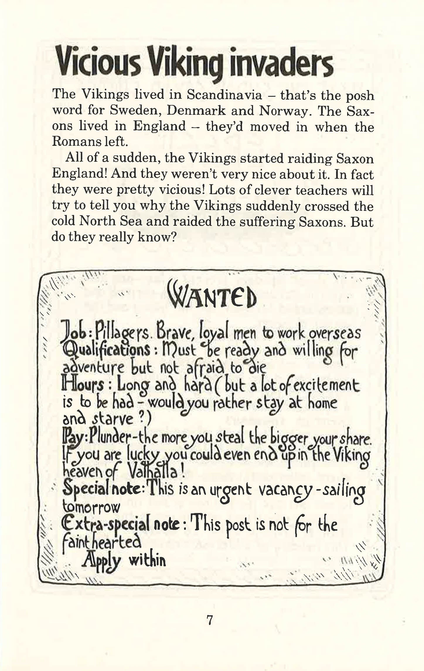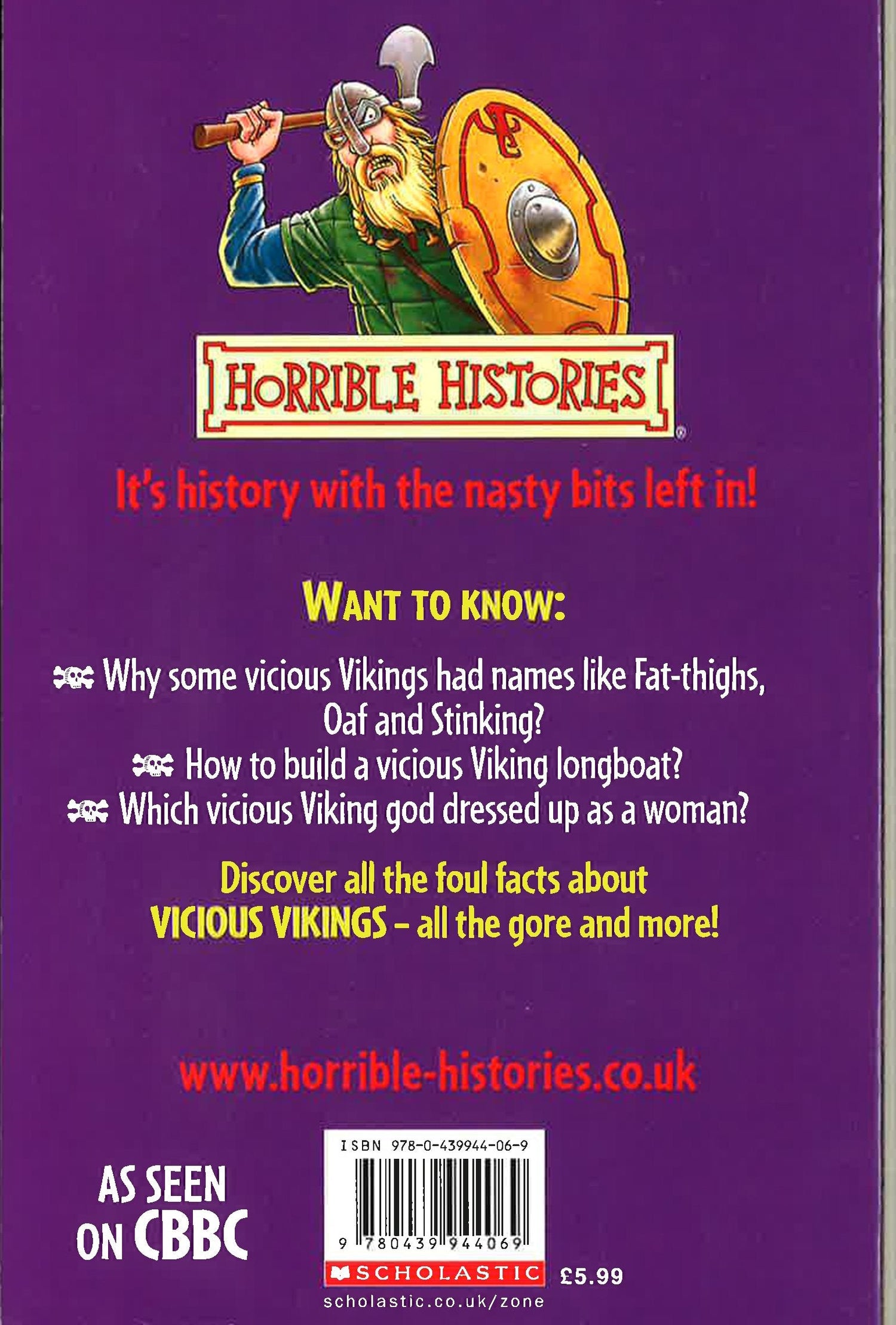 Sail back to a vicious time with fearsome seafaring Viking warriors with big boats, big shields and enormous ginger beards. Readers can discover all the foul facts about the Vicious Vikings, including Viking Gods in wedding dresses, corpses on trial and Death by booby-trapped statues. History with the nasty bits left in! 2013 is HORRIBLE HISTORIES twentieth anniversary.