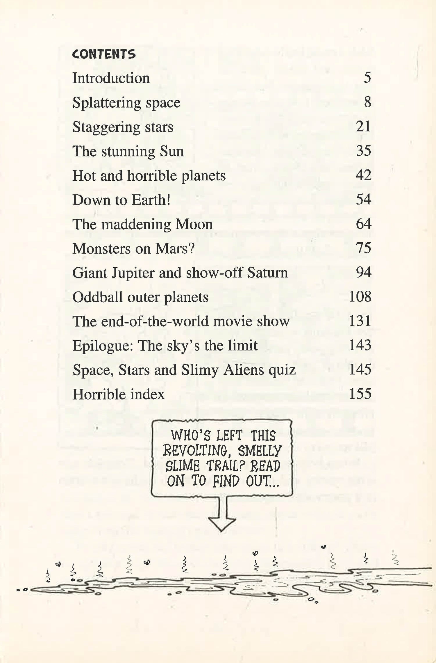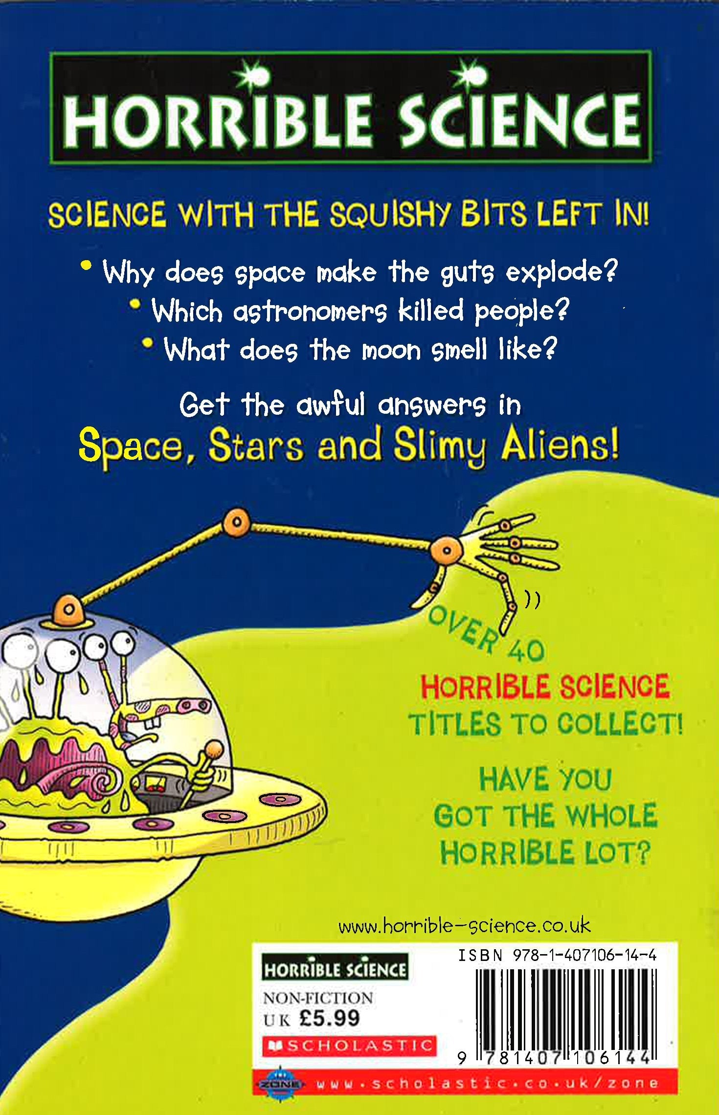 Science with the squishy bits left in! Why does space make the guts explode? Which astronomers killed people? What does the moon smell like? Get the awful answers in "Space, Stars and Slimy Aliens"!