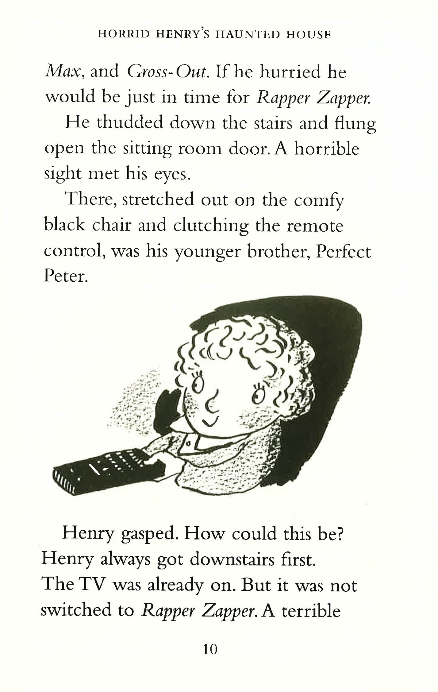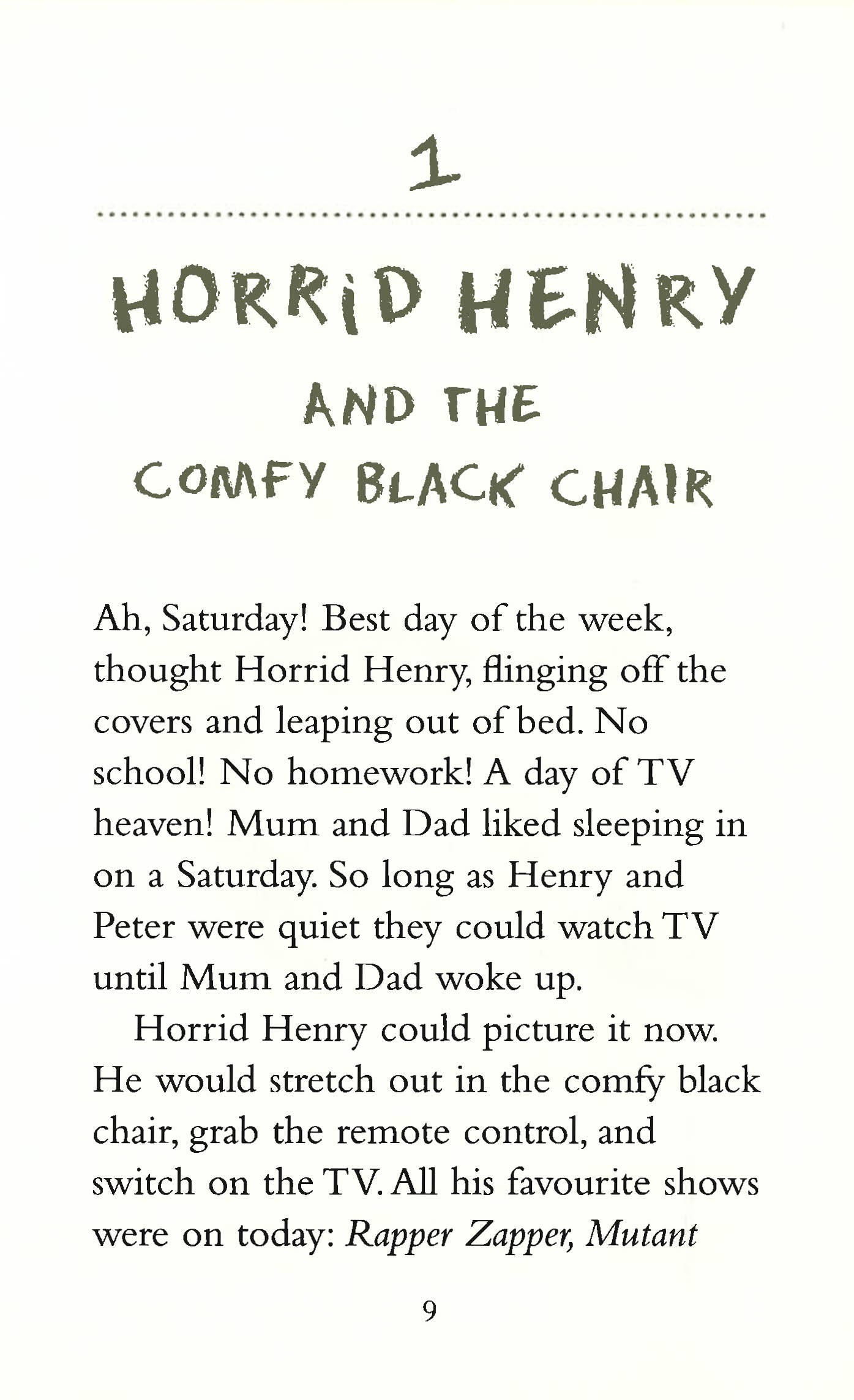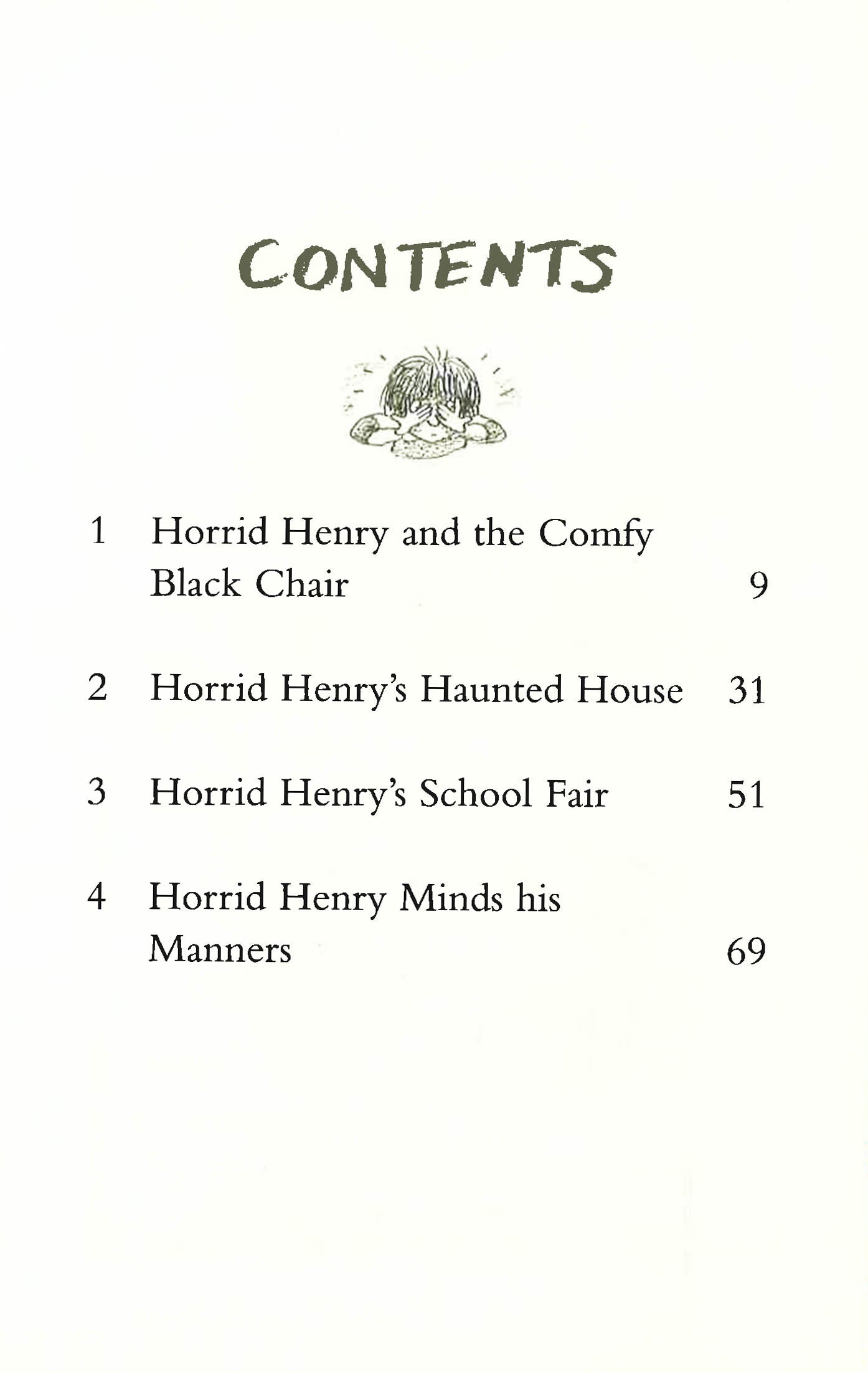 Four favourite HORRID HENRY stories: Horrid Henry and the Comfy Black Chair, Horrid Henry's Haunted House, Horrid Henry's School Fair, and Horrid Henry Minds his Manners.
