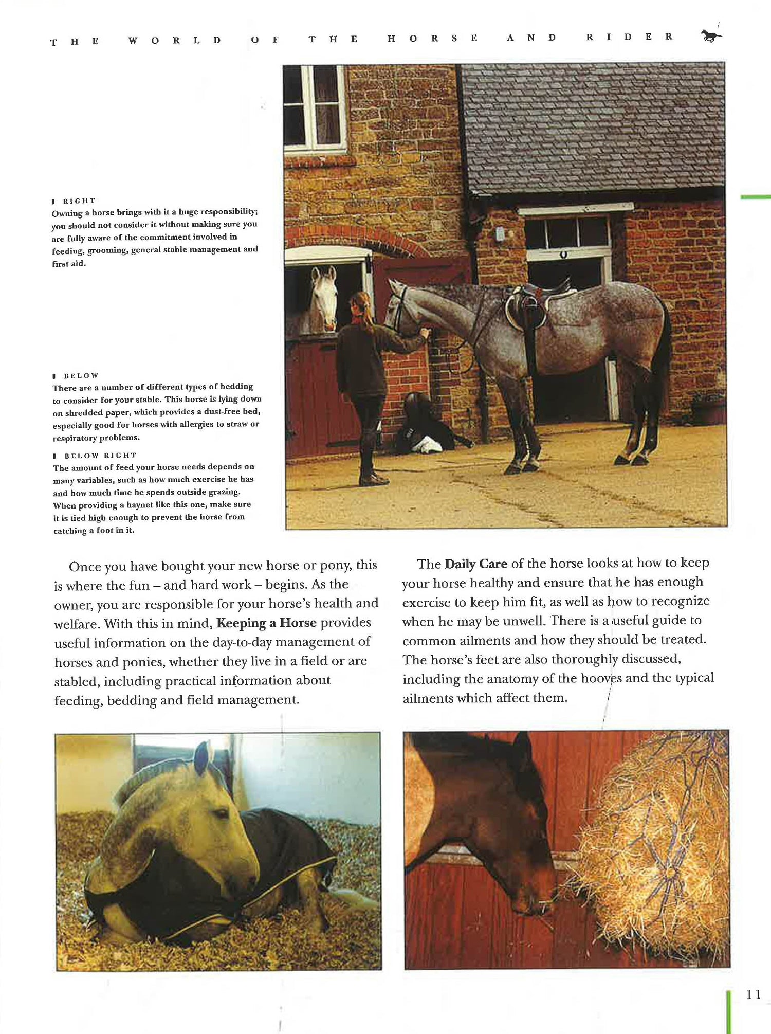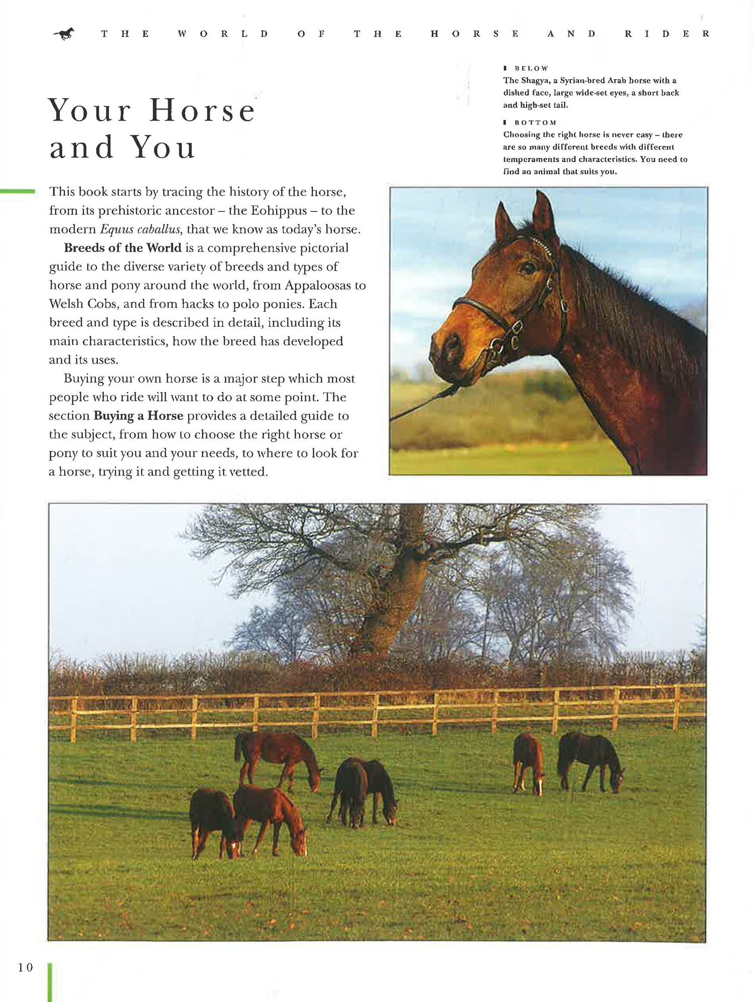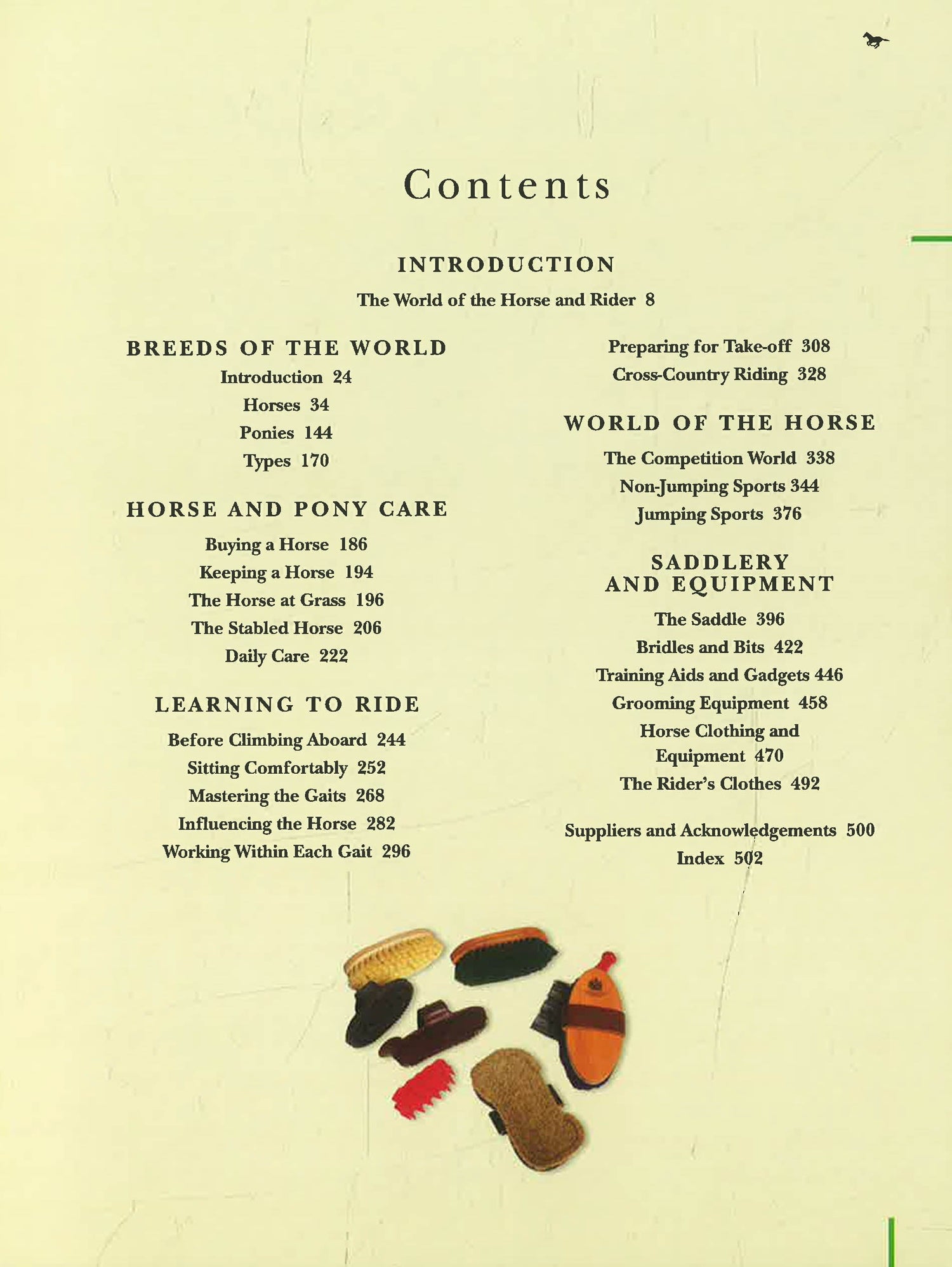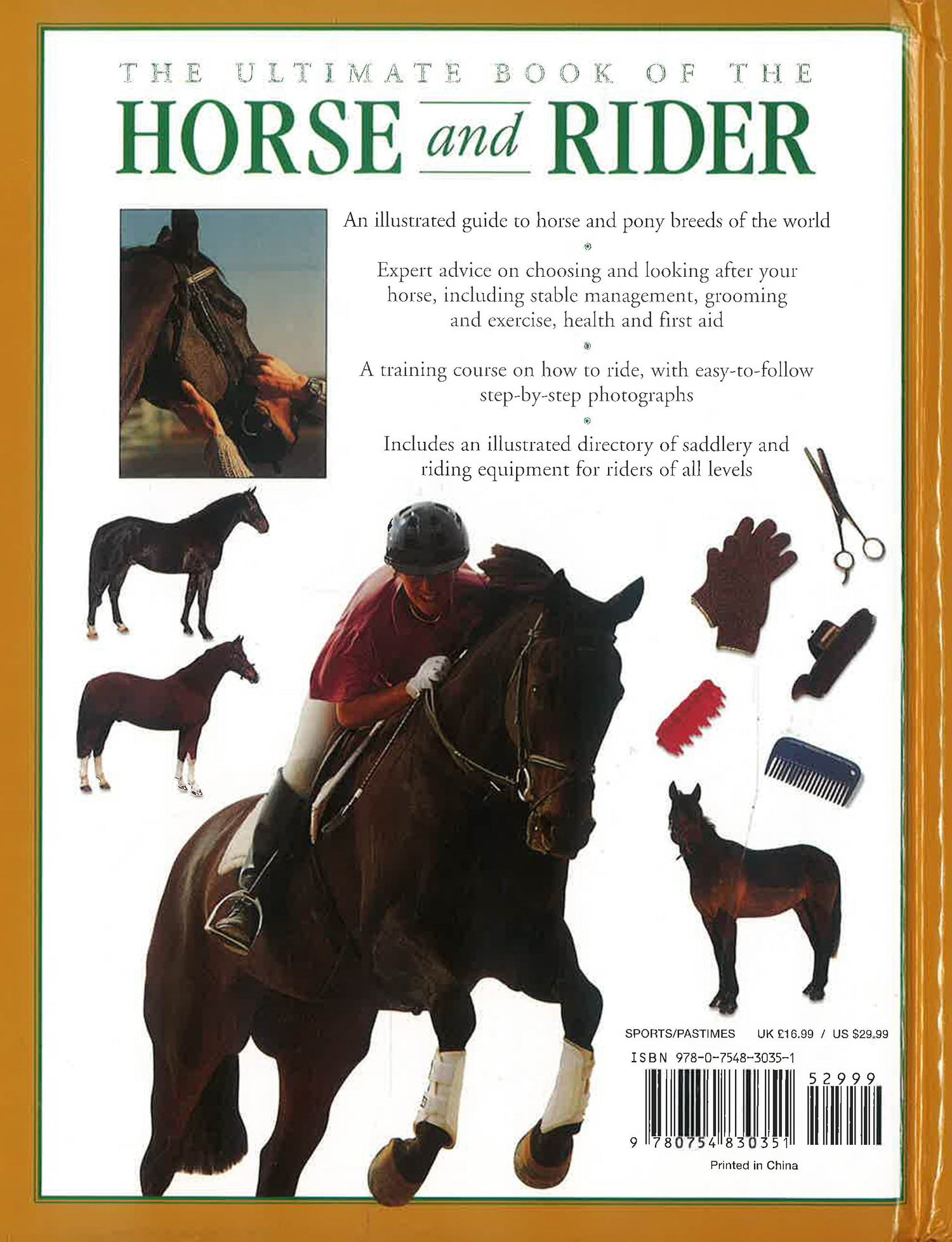 This is a complete encyclopedia of horse breeds. It is a practical training course on how to ride, shown in step-by-step photographs. It is a visual directory of riding equipment. It offers expert advice on choosing and looking after your horse, including stable management, grooming and exercise, health and first aid. It offers guidance on how to ride, from trotting, cantering and galloping to dressage, cross-country and competition riding. It includes an illustrated directory of saddlery and riding equipment for riders of all levels. This book is an invaluable guide to every aspect of horsemanship, with a fully illustrated directory of breeds of the world, step-by-step instructions on how to ride, and information about specialist equipment for both horse and rider. Over 60 breeds of horse and pony are covered, from the more familiar Thoroughbred and Shetland pony to the less well known Nonius and Caspian. Riding instructions cover every stage, from tacking up for the first time to mastering the intricacies of dressage. The book also includes a directory of equipment, including the saddle, bridle and bit, training aids, horse clothing and protective equipment, and the rider's clothing, with step by step pictures covering every aspect of caring for your horse or pony.