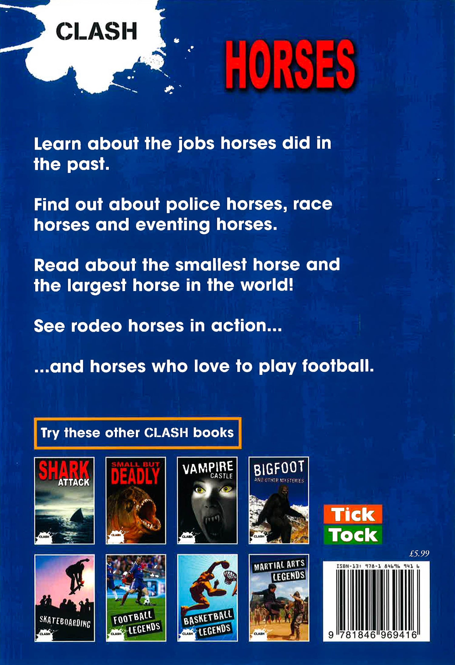A new range of non-fiction reading books for older reluctant or struggling readers. 'CLASH' offers older readers subjects they love, edgy, cool designs that will appeal to teenagers, dramatic imagery, and fact-packed, accessible text expertly levelled for older readers with reading ages of between 7 and 8 years.