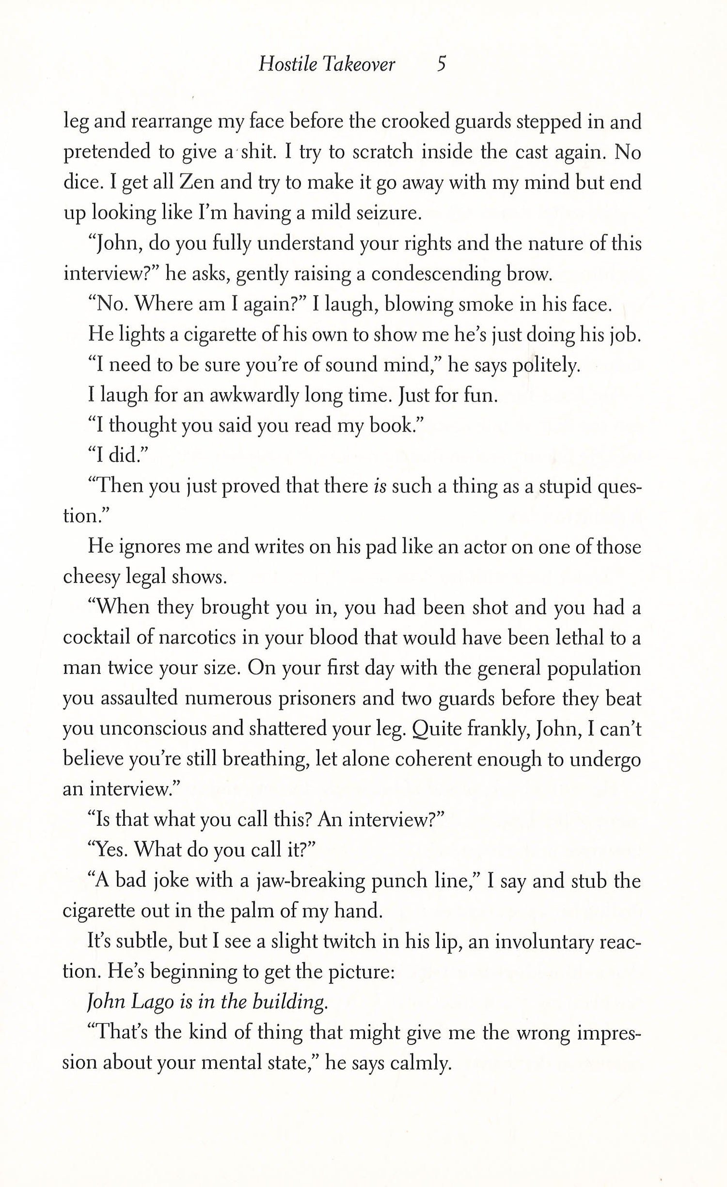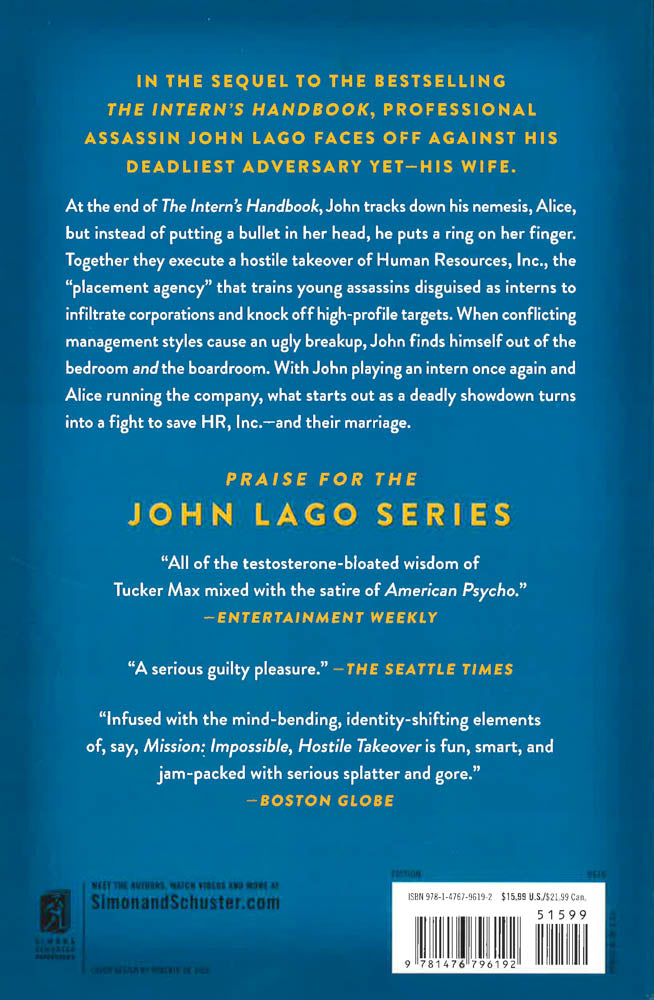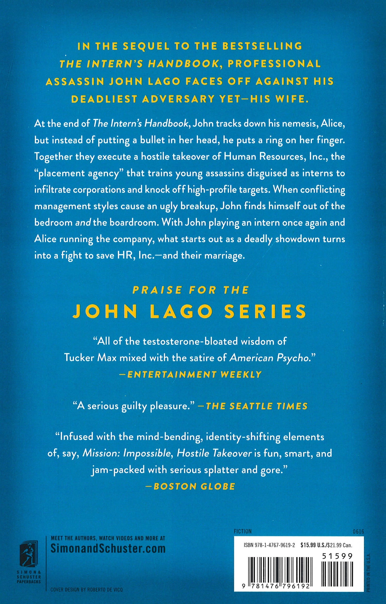 In the sequel to Shane Kuhn's bestselling The Intern's Handbook, professional assassin John Lago faces off against his deadliest adversary yet--his wife--in a thriller that has "all of the testosterone-bloated wisdom of Tucker Max mixed with the satire of American Psycho" (Entertainment Weekly). At the end of The Intern's Handbook, John tracks down his nemesis Alice but instead of putting a bullet in her head, he puts a ring on her finger and marries her. Together, they execute a hostile takeover of Human Resources, Inc., the "placement agency" that trains young assassins to infiltrate corporations disguised as interns and knock off high profile targets. As HR's former top operatives, they are successful until conflicting management styles cause an ugly breakup that locks John out of the bedroom and the boardroom. Then Alice takes on a new HR target, and John is forced to return to the office battlefield in a role he swore he would never play again: the intern. What starts out as a deadly showdown turns into the two of them fighting side by side to save HR, Inc.--and their marriage. "Those who like Dexter will love John Lago" (Booklist), and this in this suspenseful sequel to The Intern's Handbook, author Shane Kuhn's wildly clever antihero needs to use all his wits to land on top. "Far grittier than a Bond film and infused with the mind-bending, identity-shifting elements of, say, Mission: Impossible, Hostile Takeover is fun, smart, and jam-packed with serious splatter and gore. Lago's canny shenanigans will keep you riveted, from its taut opening pages to its explosive, cinematic ending" (The Boston Globe).