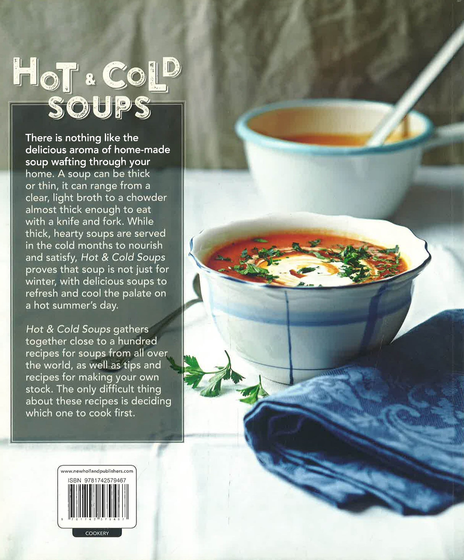 There is nothing like the delicious aroma of home-made soup wafting through your home. A soup can be thick or thin, it can range from a clear, light broth to a chowder almost thick enough to eat with a knife and fork. While thick, hearty soups are served in the cold months to nourish and satisfy, Hot & Cold Soups proves that soup is not just for winter, with delicious soups to refresh and cool the palate on a hot summer’s day.