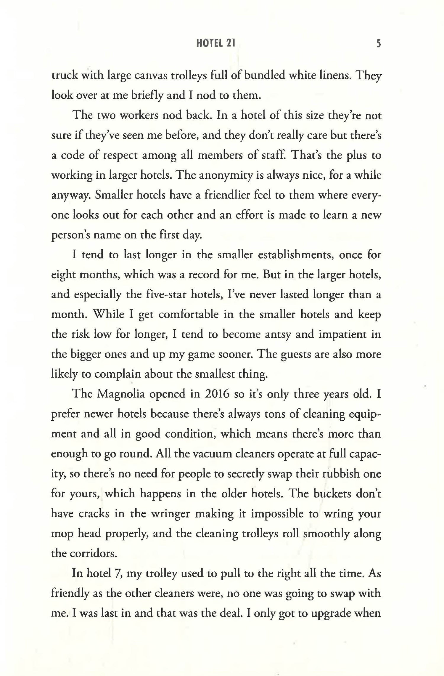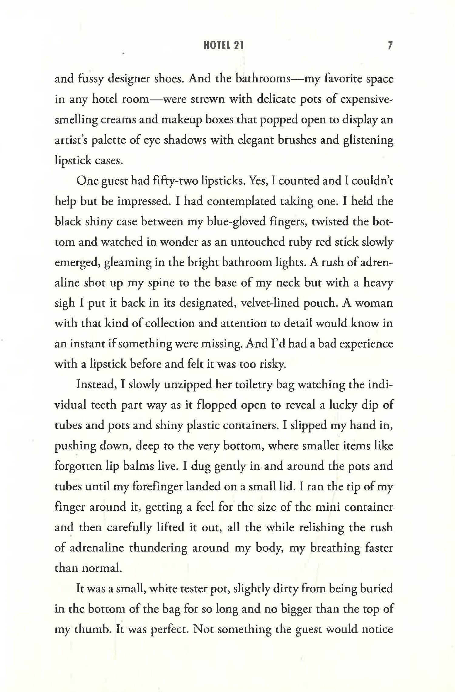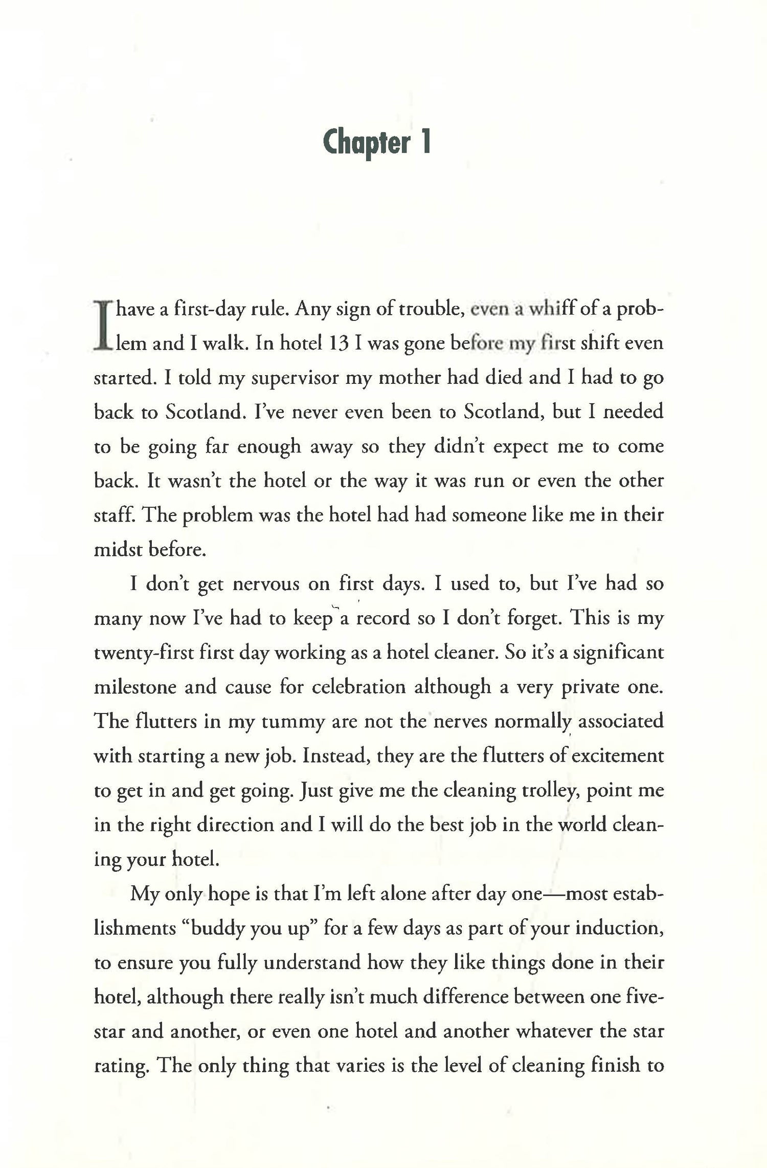 Noelle is an efficient, friendly hotel cleaner--a model employee. Or so she'd have you think . . . trouble is, she can't help but take little "souvenirs" from the rooms she cleans. Nothing of value--a lipstick, a hair clip, some tweezers. By the time the guest has noticed, she's long gone. As Noelle begins work at her twenty-first hotel, she's determined to last longer than her record of one month in the job. But then she meets her new colleagues. These women are real: they live lives full of happiness and worry, pain and joy. They make her wonder what it might be like to have true friends, people to stick round for--and someone to love. . . . Will they give her the courage to claim the life she deserves, or will her old habits come back to haunt her?