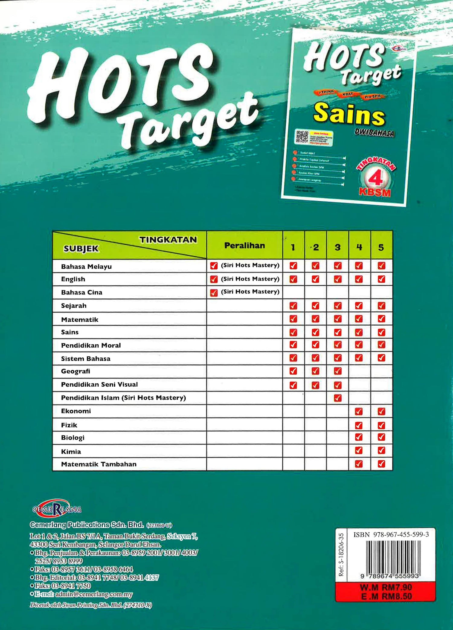 Buku latihan Sains (Dwibahasa) Tingkatan 4 yang dilengkapi dengan nota informatif padat, latihan dalam bentuk modul beserta jawapan lengkap. Sesuai untuk i-Think, KBAT dan DSKP.