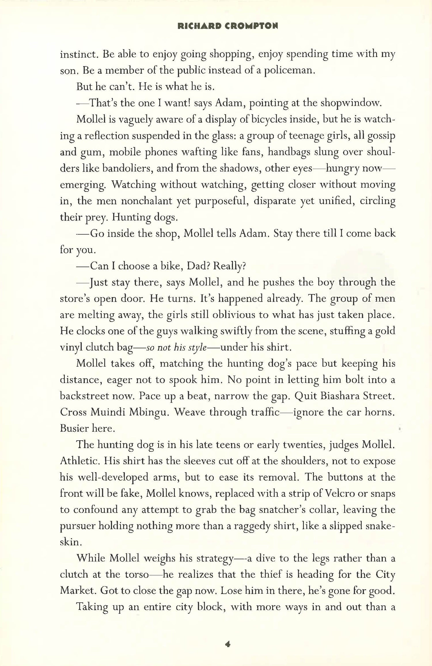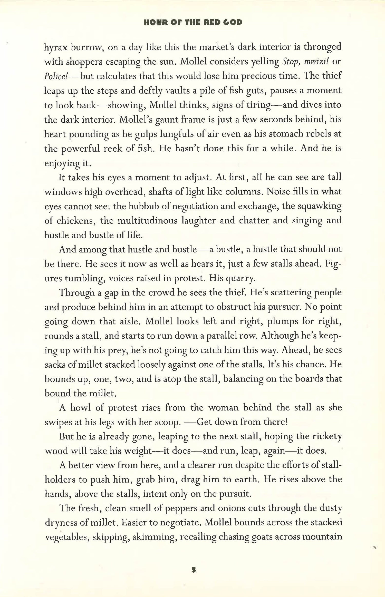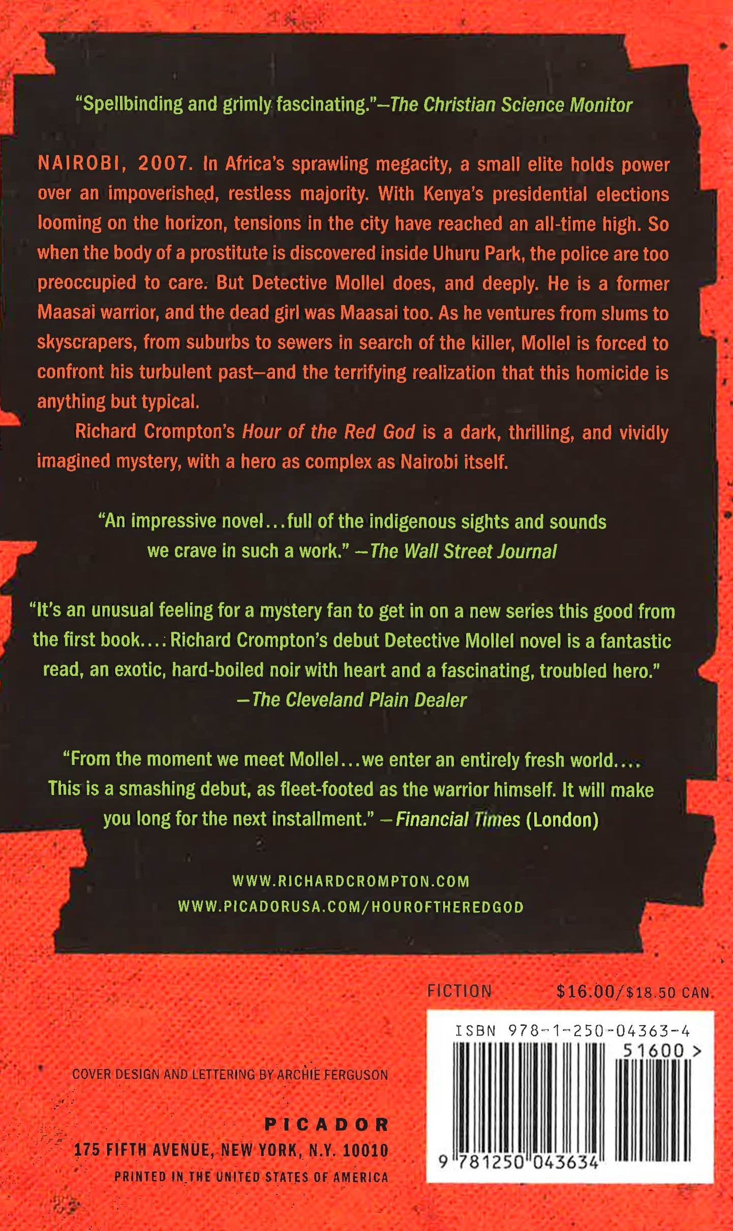 The Maasai believe in two gods. Enkai Narok, the Black God, is benign. Enkai Nanyokie, the Red God, is the god of anger, vengeance, and death. Nairobi, 2007. In Africa's sprawling megacity, a small elite holds power over an impoverished, restless majority. Corruption, exploitation, and ethnic rivalry are part of everyday life. Amid claims of vote rigging and fraud, the presidential elections could be the spark that sets this city ablaze. With chaos looming, few care about one dead prostitute. But Detective Mollel does. For Mollel is a former Maasai warrior, and the dead girl was a Maasai, too. As he ventures from slums to skyscrapers, from suburbs to sewers, Mollel begins to realize that there is more at stake than just this murder. But even as he is forced to confront his turbulent past, he begins to doubt his warrior's instincts. Can Mollel manage to find the killer and solve the case before the Red God consumes all?