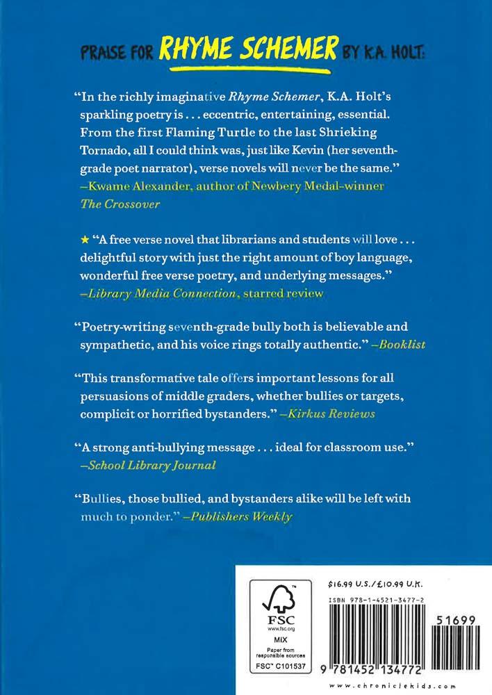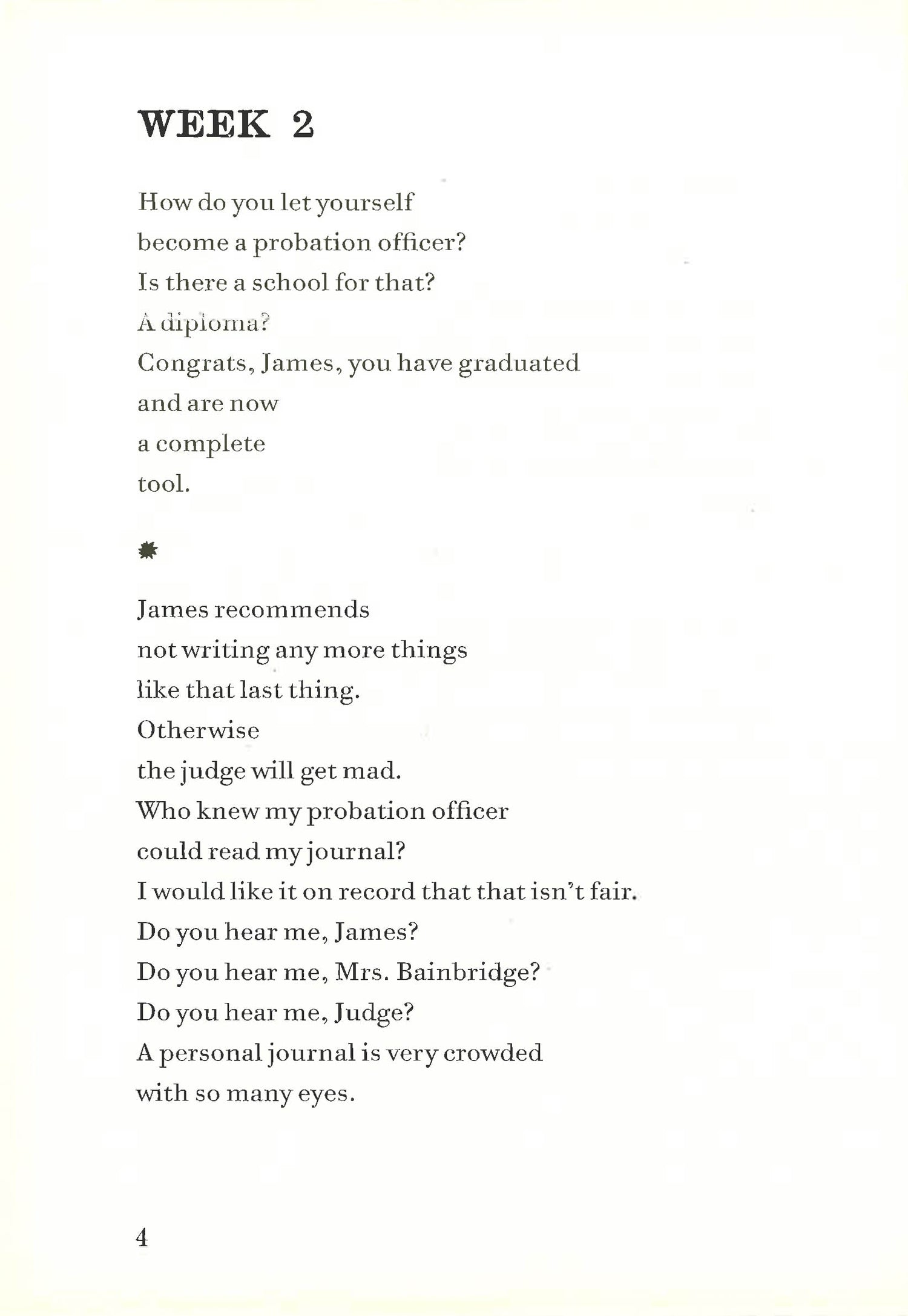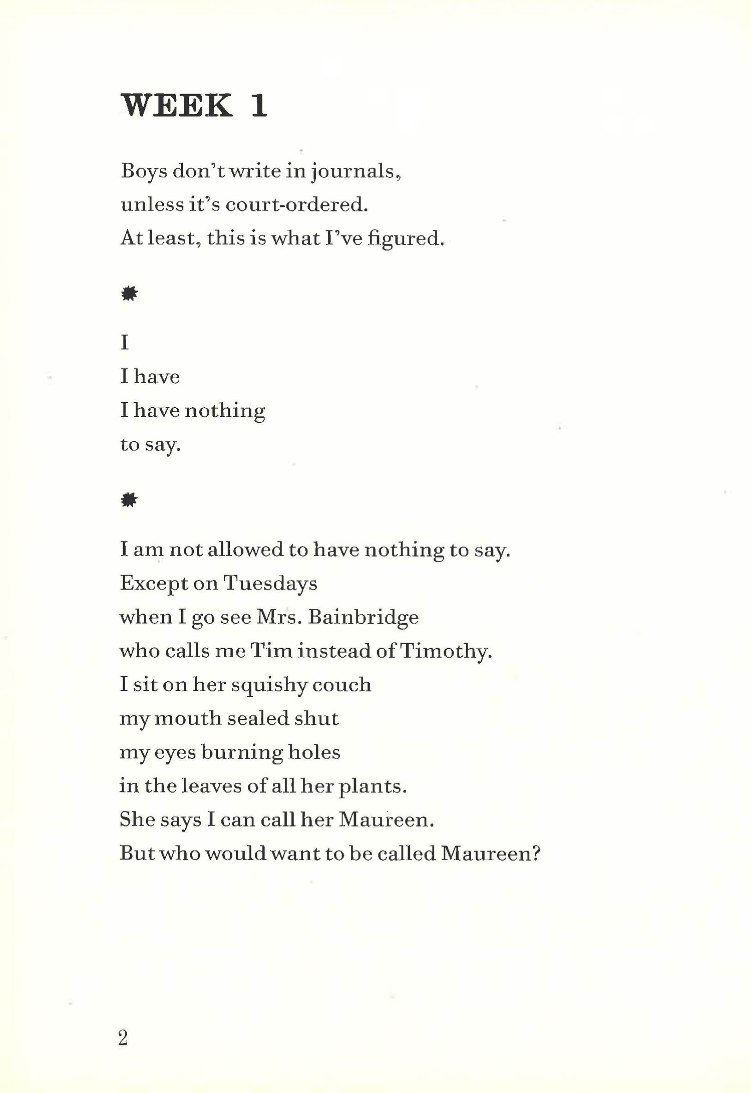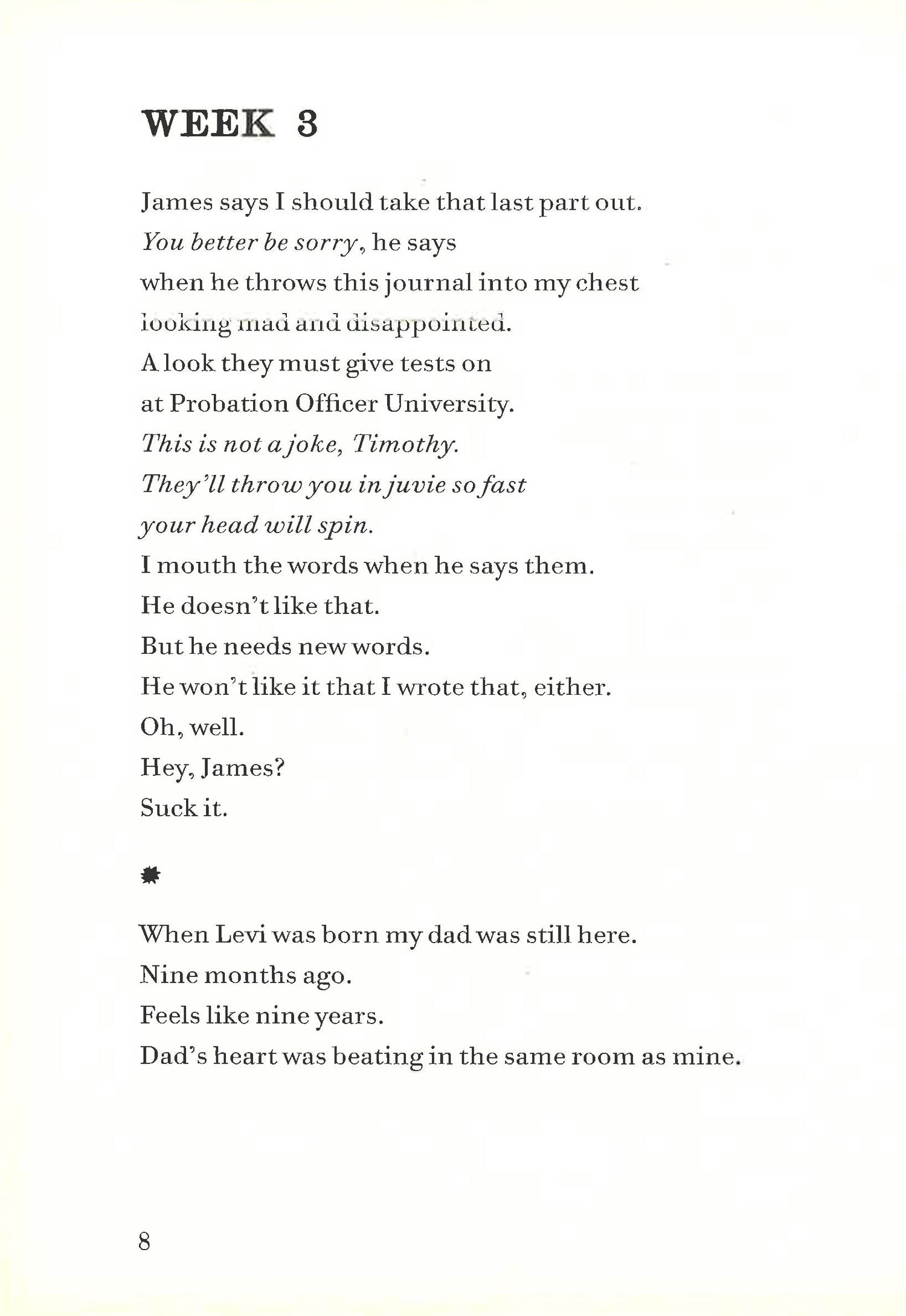 Timothy is on probation. It's a strange word--something that happens to other kids, to delinquents, not to kids like him. And yet, he is under house arrest for the next year. He must check in weekly with a probation officer and a therapist, and keep a journal for an entire year. And mostly, he has to stay out of trouble. But when he must take drastic measures to help his struggling family, staying out of trouble proves more difficult than Timothy ever thought it would be. By turns touching and funny, and always original, House Arrest is a middle grade novel in verse about one boy's path to redemption as he navigates life with a sick brother, a grieving mother, and one tough probation officer.