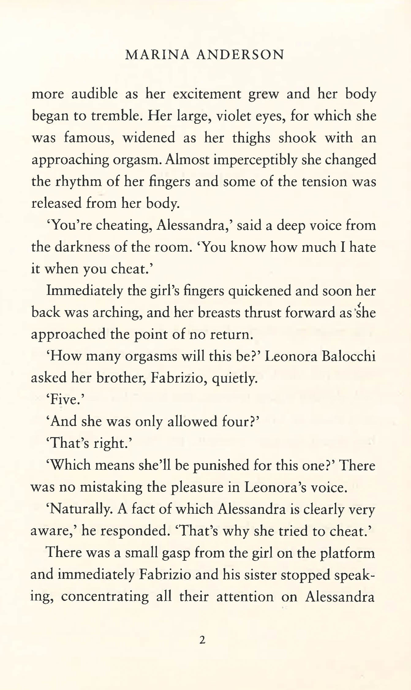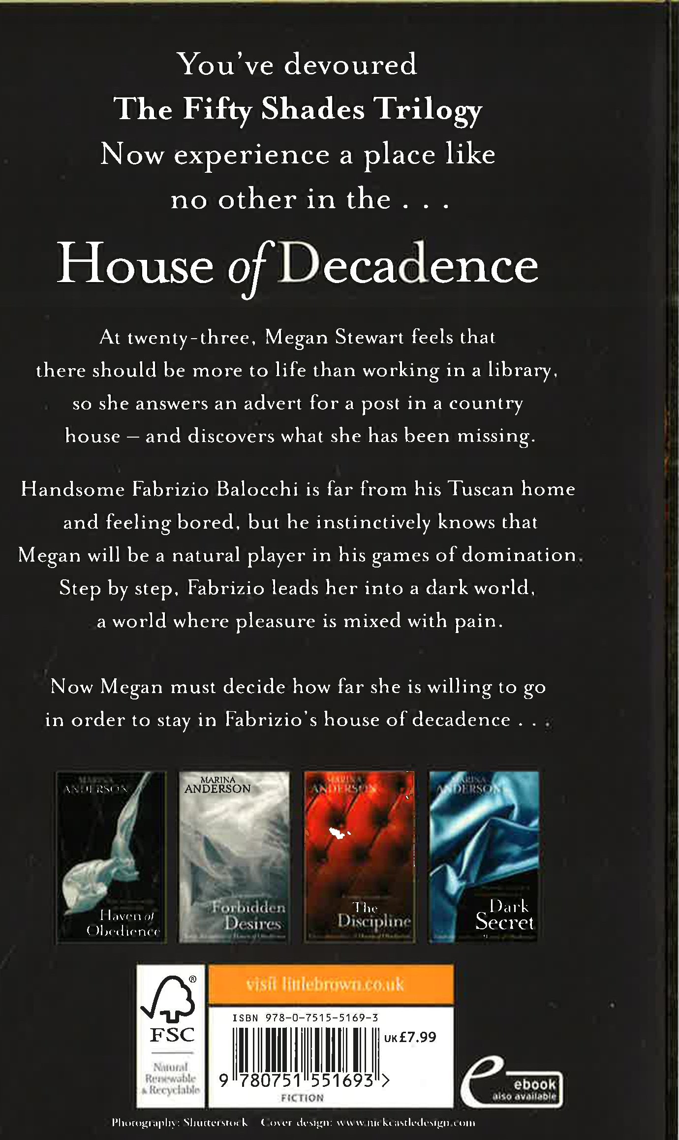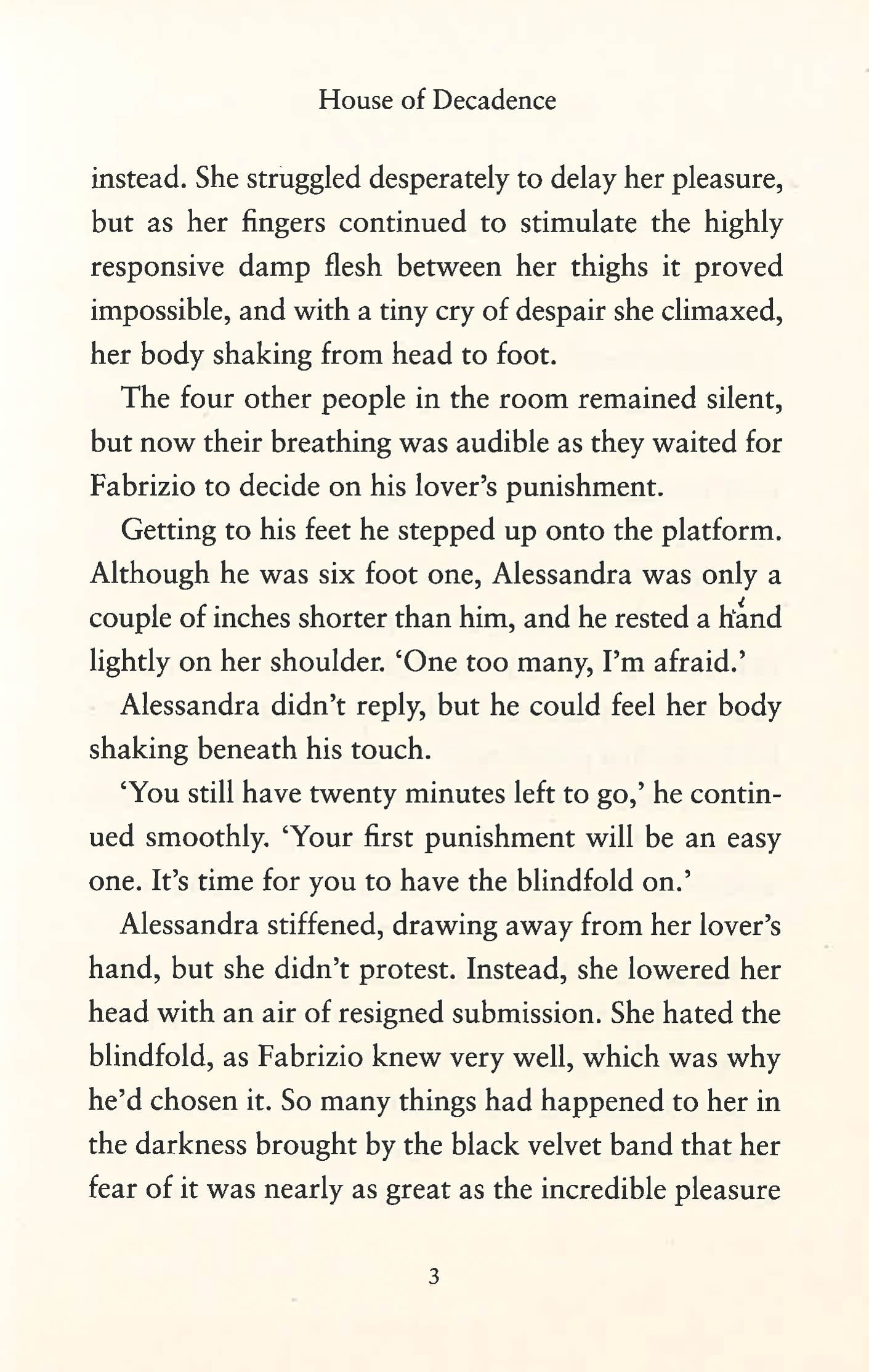 Handsome Fabrizio Balocchi is far from his Tuscan home and feeling bored. But he instinctively knows that Megan will be a natural player in his games of domination and step by step, he leads her into a darker world, a world where pleasure is mixed with pain. Now Megan must decide how far she is willing to go in order to stay in Fabrizio's house of decadence . . .