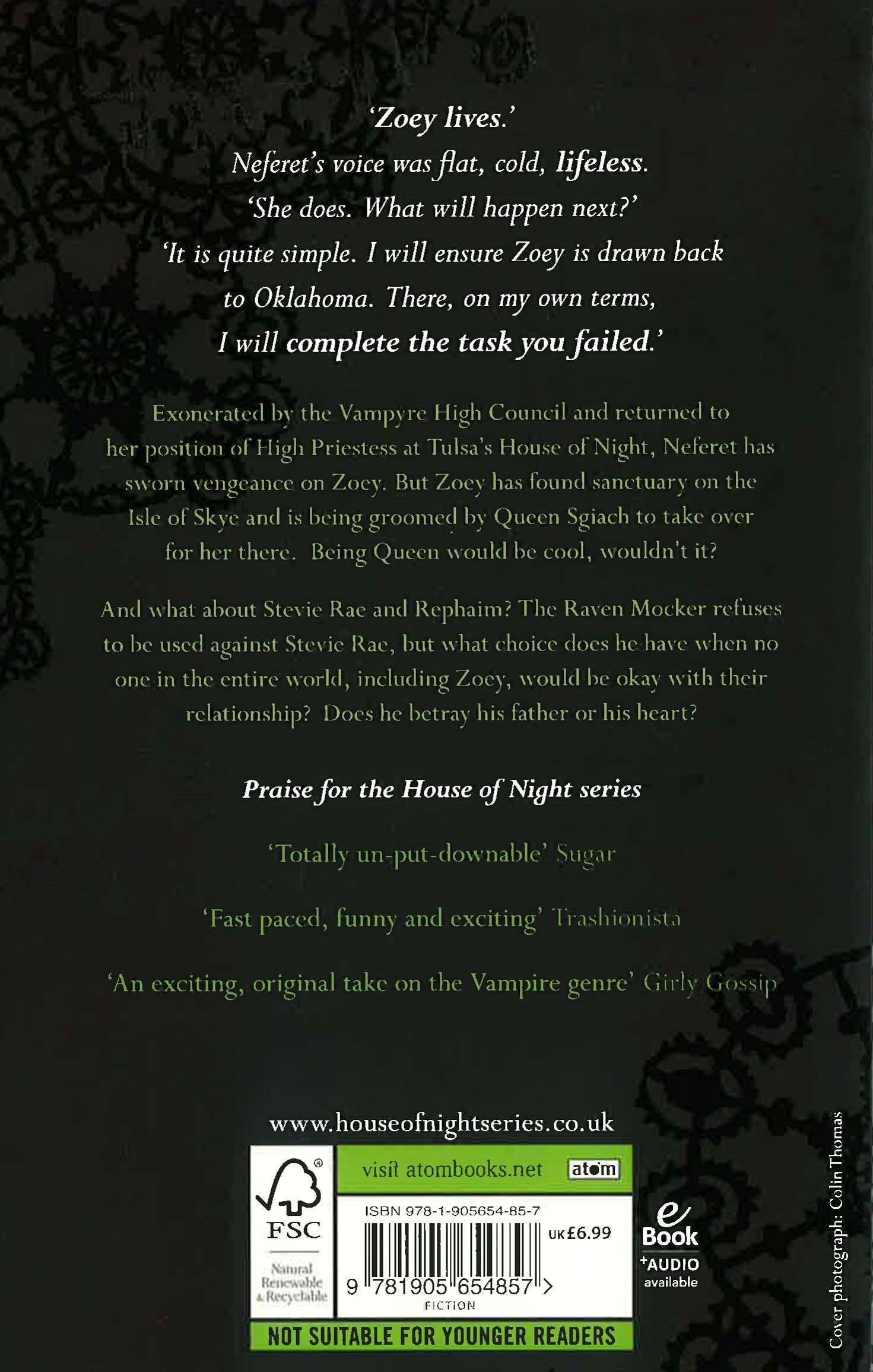 Exonerated by the Vampyre High Council and returned to her position of High Priestess at Tulsa's House of Night, Neferet has sworn vengeance on Zoey. But Zoey has found sanctuary on the Isle of Skye and is being groomed by Queen Sgiach to take over for her there. Being Queen would be cool, wouldn't it? And what about Stevie Rae and Rephraim? The Raven Mocker refuses to be used against Stevie Rae, but what choice does he have when no one in the entire world, including Zoey, would be ok with their relationship? Does he betray his father or his heart?
