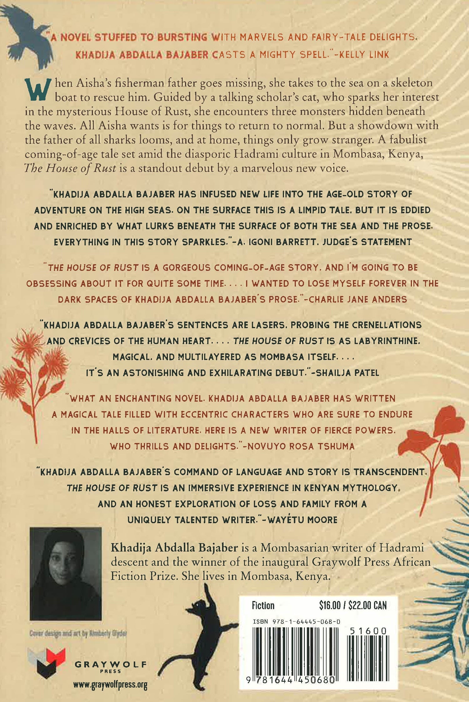 The first Graywolf Press African Fiction Prize winner, a story of a girl's fantastical sea voyage to rescue her father The House of Rust is an enchanting novel about a Hadrami girl in Mombasa. When her fisherman father goes missing, Aisha takes to the sea on a magical boat made of a skeleton to rescue him. She is guided by a talking scholar's cat (and soon crows, goats, and other animals all have their say, too). On this journey Aisha meets three terrifying sea monsters. After she survives a final confrontation with Baba wa Papa, the father of all sharks, she rescues her own father, and hopes that life will return to normal. But at home, things only grow stranger. Khadija Abdalla Bajaber's debut is a magical realist coming-of-age tale told through the lens of the Swahili and diasporic Hadrami culture in Mombasa, Kenya. Richly descriptive and written with an imaginative hand and sharp eye for unusual detail, The House of Rust is a memorable novel by a thrilling new voice.