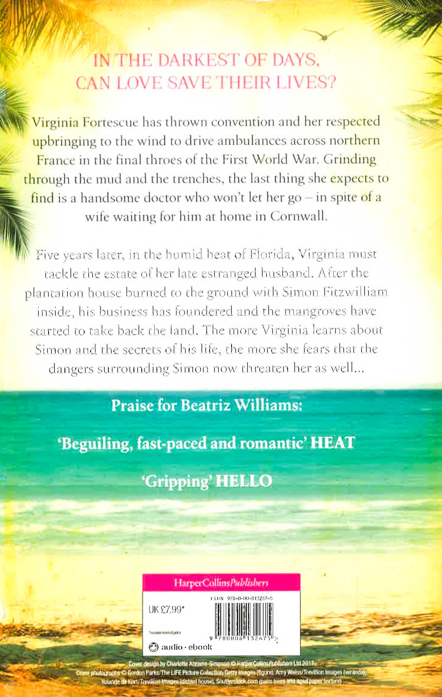 Lose yourself in a sweeping love story this summer - perfect for fans of Dinah Jeffries and Santa Montefiore Northern France, 1917Virginia Fortescue has thrown convention and her respected upbringing to the wind to drive ambulances for the American Red Cross across northern France. Grinding through the mud and the trenches to bring injured and dying men back from the front, the last thing she expects to find is a handsome English doctor who won't let her go - in spite of a wife waiting for him at home in Cornwall. Florida, 1922In the humid heat of Florida, Virginia Fitzwilliam must tackle the estate of her late estranged husband. After the plantation house burned to the ground with Simon Fitzwilliam inside, the shipping business he built from scratch has foundered and the mangroves have started to take back the land. The more Virginia learns about Simon and the secrets of his life, the more she fears that the dangers surrounding Simon now threaten her as well...