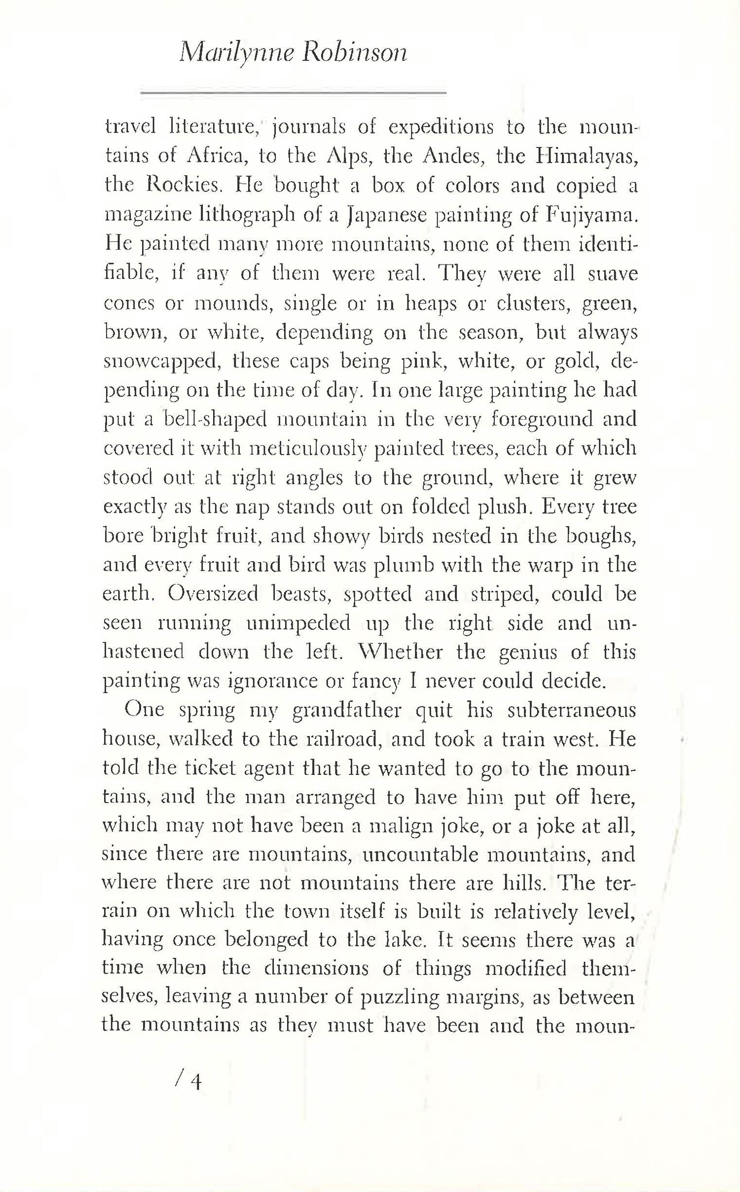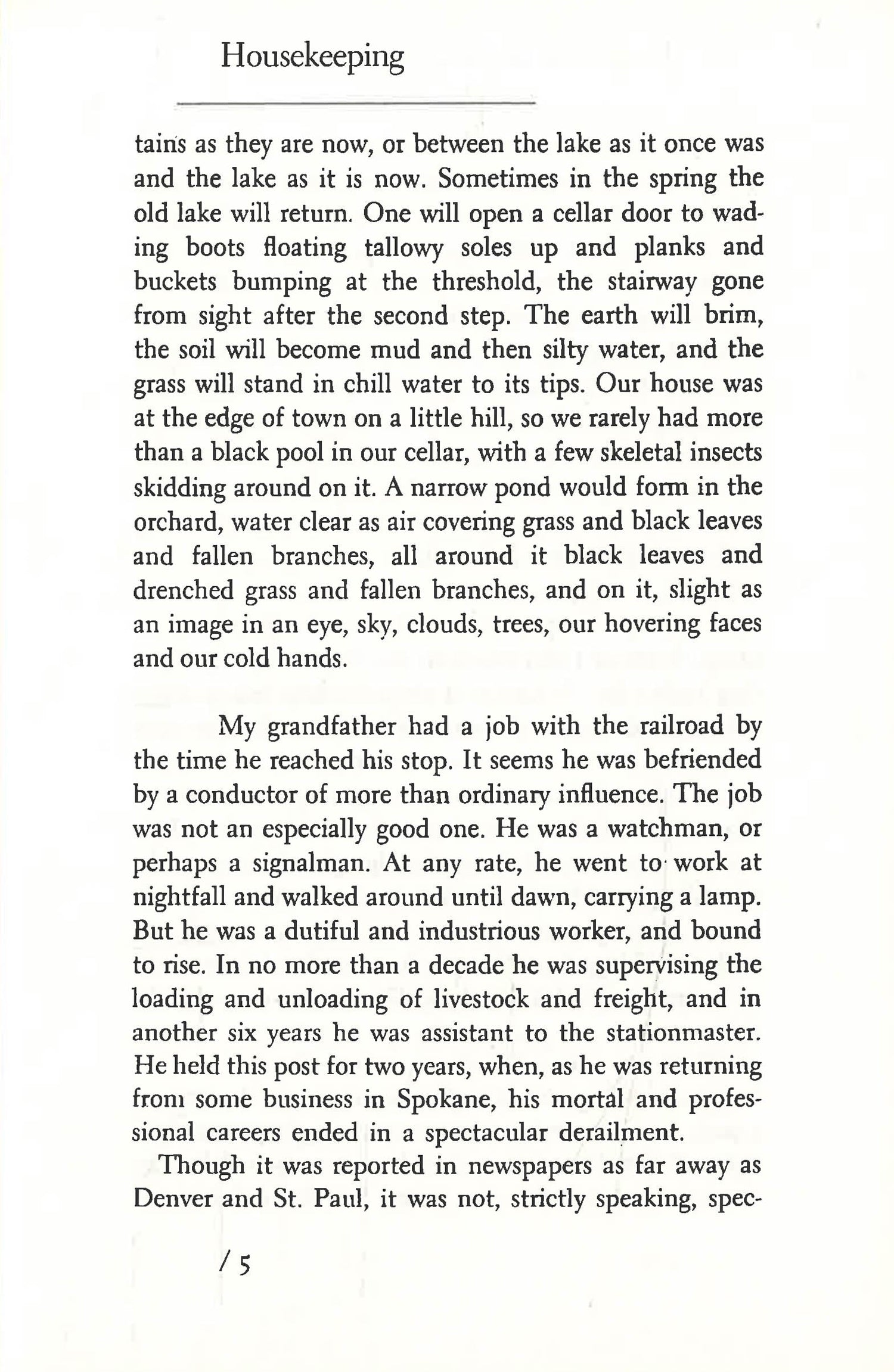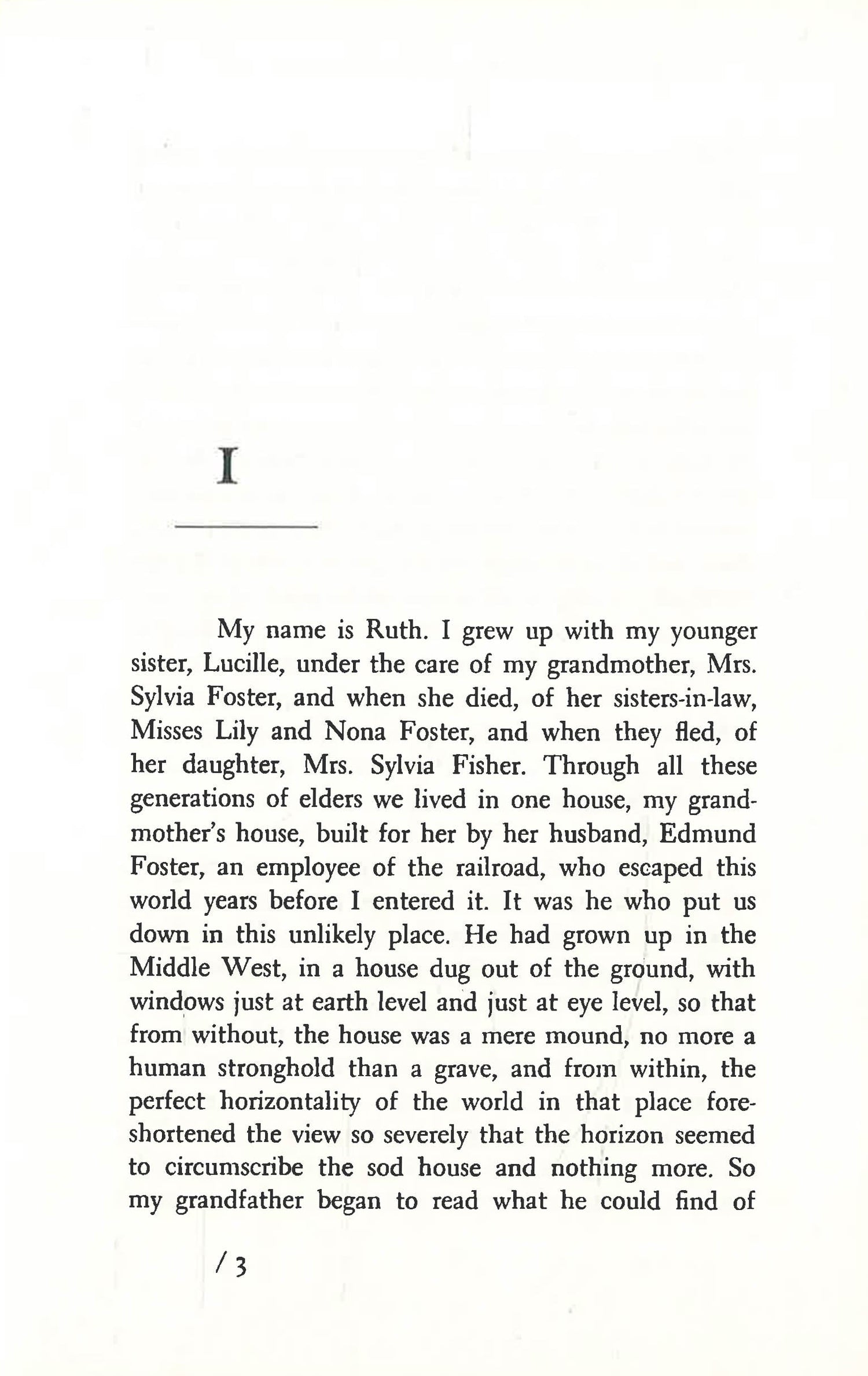 The family house is in the small town of Fingerbone on a glacial lake in the Far West, the same lake where their grandfather died in a spectacular train wreck and their mother drove off a cliff to her death. It is a town chastened by an outsized landscape and extravagant weather, and chastened again by an awareness that the whole of human history had occurred elsewhere.