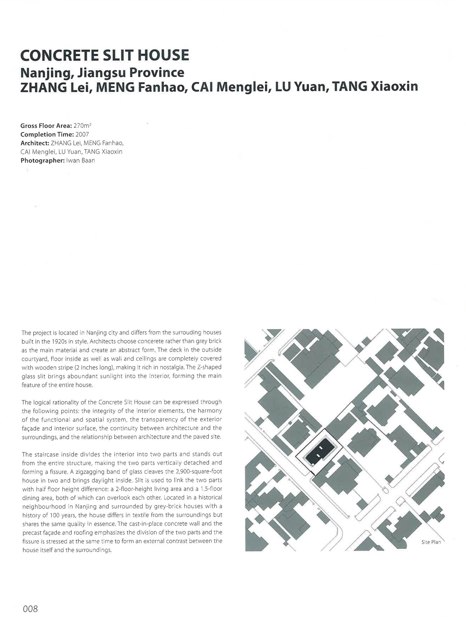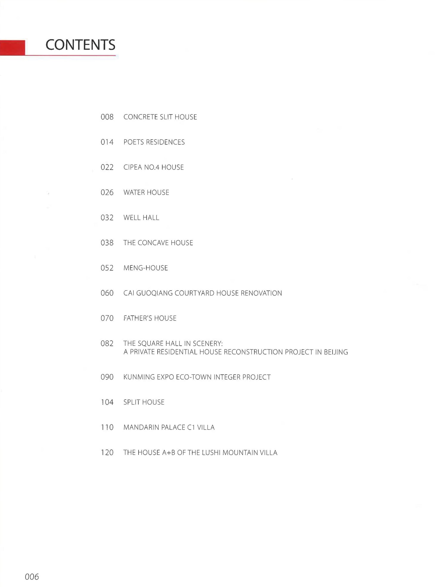 With the rapid development of the economy and tremendous changes in technology in contemporary China, people are no longer satisfied with the existing living condistions and they demand more comfort, variety, and adaptability. In addition to ensuring a continuing supply of houses, it is increasingly important to improve the functional quality in residential space design. The human-oriented concept pays more attention to the relationship between the dwelling space and its natural surroundings, providing the basic functions of houses while endowing them with a deeper ethos. From the designers' perspective, client requirements and developing housing trends bring more opportunities and challenges. Houses investigates the relationship between dwelling space and natural context and summarizes the developing trends of residential design in China by collecting projects of renowned local designers. Each project in the book is illustrated with beautiful images, delicate drawings, and a detailed description to showcase the innovation ideas of the designer in a clear and systematic way.