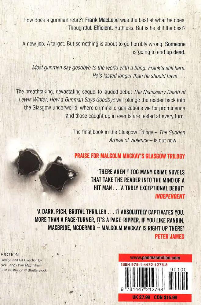 How does a gunman retire? Frank MacLeod was the best at what he does. Thoughtful. Efficient. Ruthless. But is he still the best? A new job. A target. But something is about to go horribly wrong. Someone is going to end up dead. Most gunmen say goodbye to the world with a bang. Frank's still here. He's lasted longer than he should have . . . The breathtaking, devastating sequel to lauded debut The Necessary Death of Lewis Winter, How a Gunman Says Goodbye will plunge the reader back into the Glasgow underworld, where criminal organisations war for prominence and those caught up in events are tested at every turn.