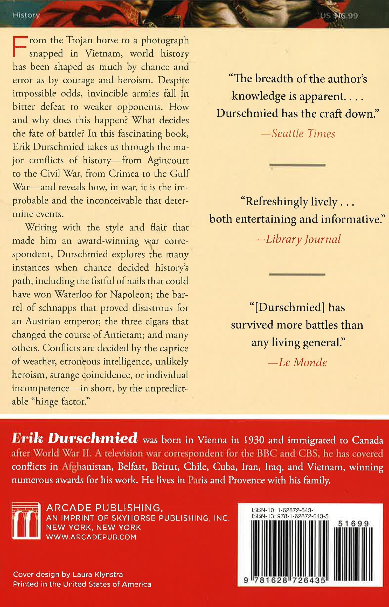 From the Trojan Horse to a photograph snapped in Vietnam, world history has been shaped as much by chance and error as by courage and heroism. Despite impossible odds, invincible armies fall in bitter defeat to weaker opponents. How and why does this happen? What decides the fate of battle? In this fascinating book, Erik Durschmied takes us through the major conflicts of history from Agincourt to the Civil War, from Crimea to the Gulf War and reveals how, in war, it is the improbable and the inconceivable that determine events. Writing with the style and flair that made him an award-winning war correspondent, Durschmied explores the fistful of nails that could have won Waterloo for Napoleon; the barrel of schnapps that proved disastrous for an Austrian emperor; and the three cigars that changes the course of Antietam; and many other instances when chance decided history's path. Conflicts are decided by the caprice of weather, erroneous intelligence, unlikely heroism, strange coincidence, or individual incompetence in short, by the unpredictable "hinge factor."
