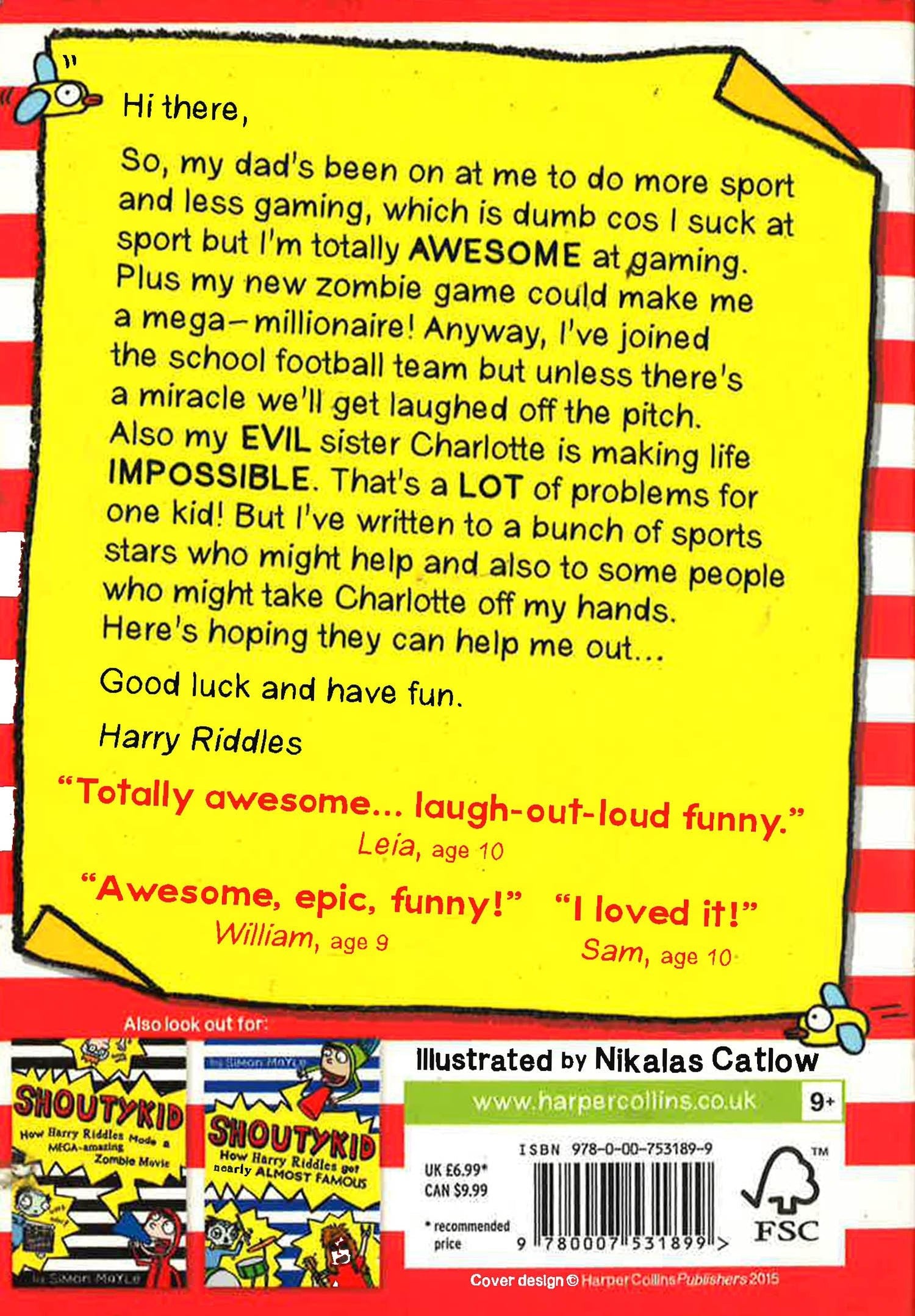 The funniest kid in fiction is back! Hi there, My name is Harry Riddles, and I live with my mum, my dad and my EVIL sister Charlotte. But now my mum is having TWINS so either me or Charlotte are gonna lose our bedroom. ALSO, Dad's moaning that I should do more sport and not be just a gamer (which shows what he knows cos I'm actually the BEST gamer World of Zombies has ever seen). But I've joined the school football team to keep him happy although if we win anything it will be a miracle cos we suck. I've written to some stars of the football world to see if they wanna help out, and also a bunch of people who might take Charlotte off our hands - oh and Brad Pitt's wife to see if she wants to adopt a couple more kids, but who knows if they will write back. We'll see. Good luck and have fun. Harry Riddles Follow Harry's hilarious ups and downs told through laugh-out-loud letters, emails, texts and more!